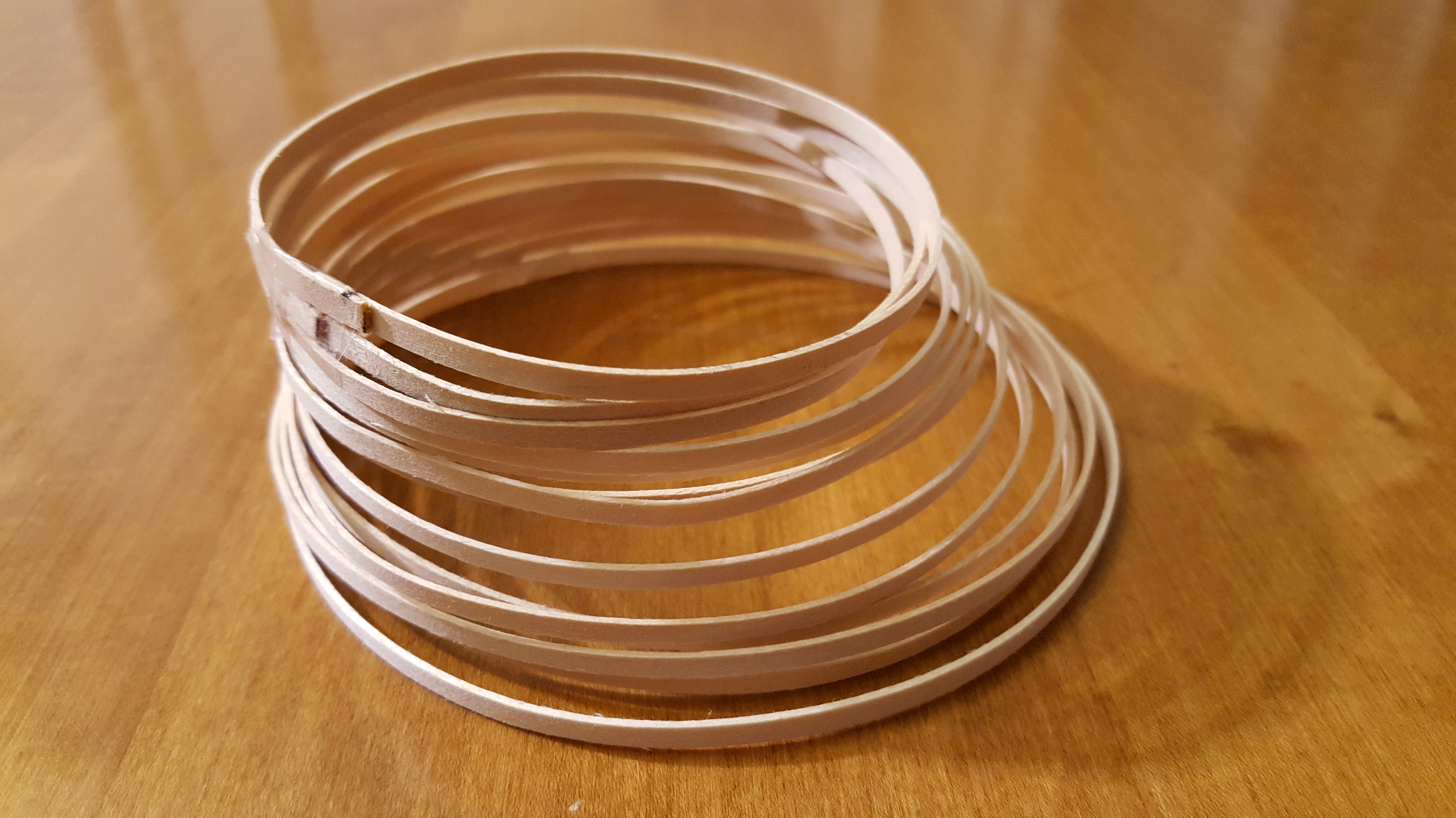 Once all of the pieces are cut, it is time to fasten them into hoops. The simplest and most reliable method I found was to use one drop of instant-bond glue on one end of a stick, and bend the other end around and squeeze them together briefly with a flat pliers. (The usual caveats with instant-bond glue apply: don’t use too much or your work piece will cement itself to your pliers; don’t squeeze with your fingers because the glue voraciously bonds skin.) You may note that the overlap introduces a (varying) discrepancy from our modeled circumferences.