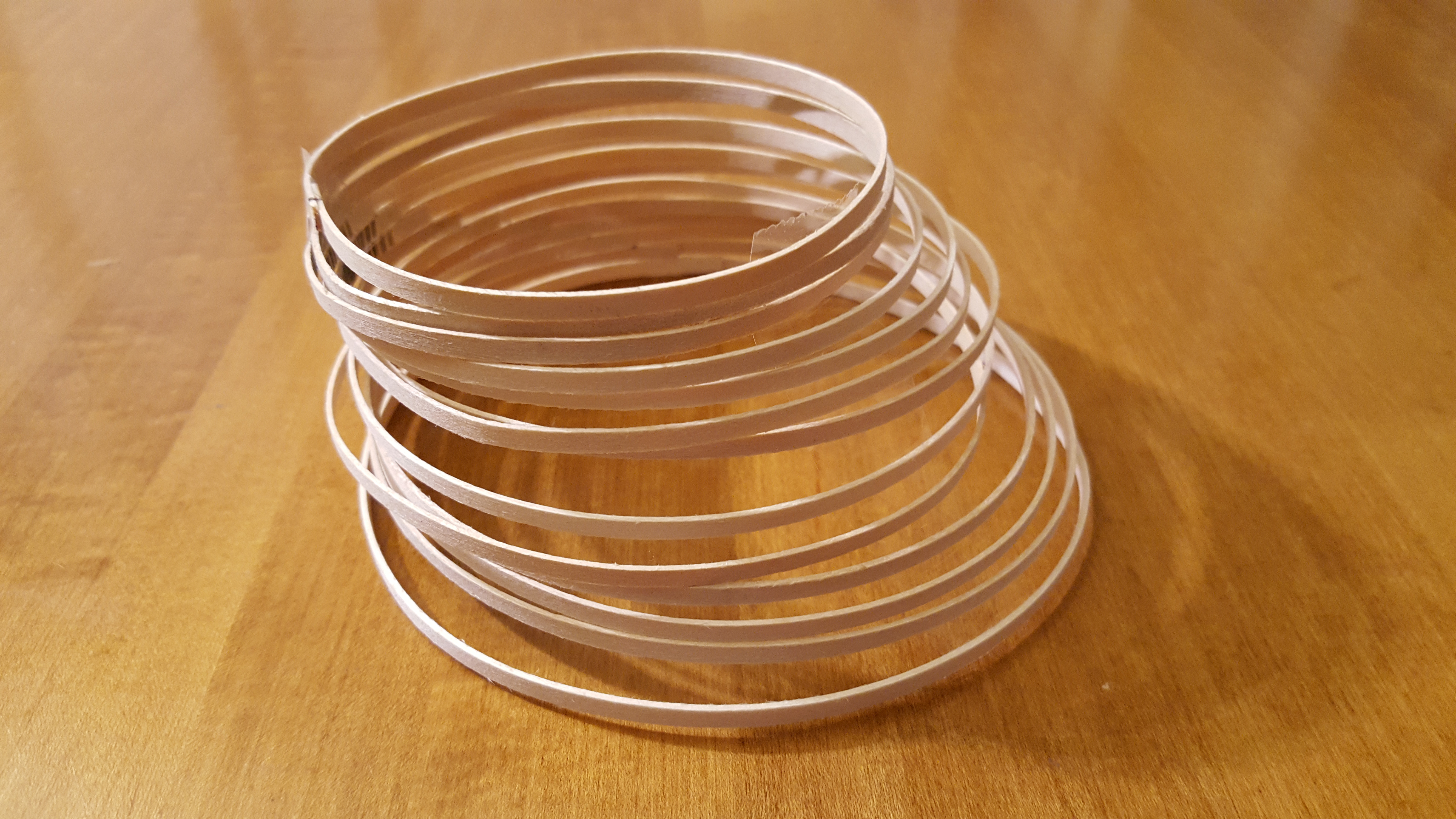 When they’re all done, another nice characteristic of the 3/8″ circumference increment emerges: the hoops nest beautifully. Note that at about ten inches, the wood strips starting snapping repeatedly, so our cornucopia will be left with a hole in the end. If that’s bothersome, you could continue with strips of cardstock, or just insert a cone made of a stiff sheet material, again perhaps cardstock; manila would match the wood color fairly closely.