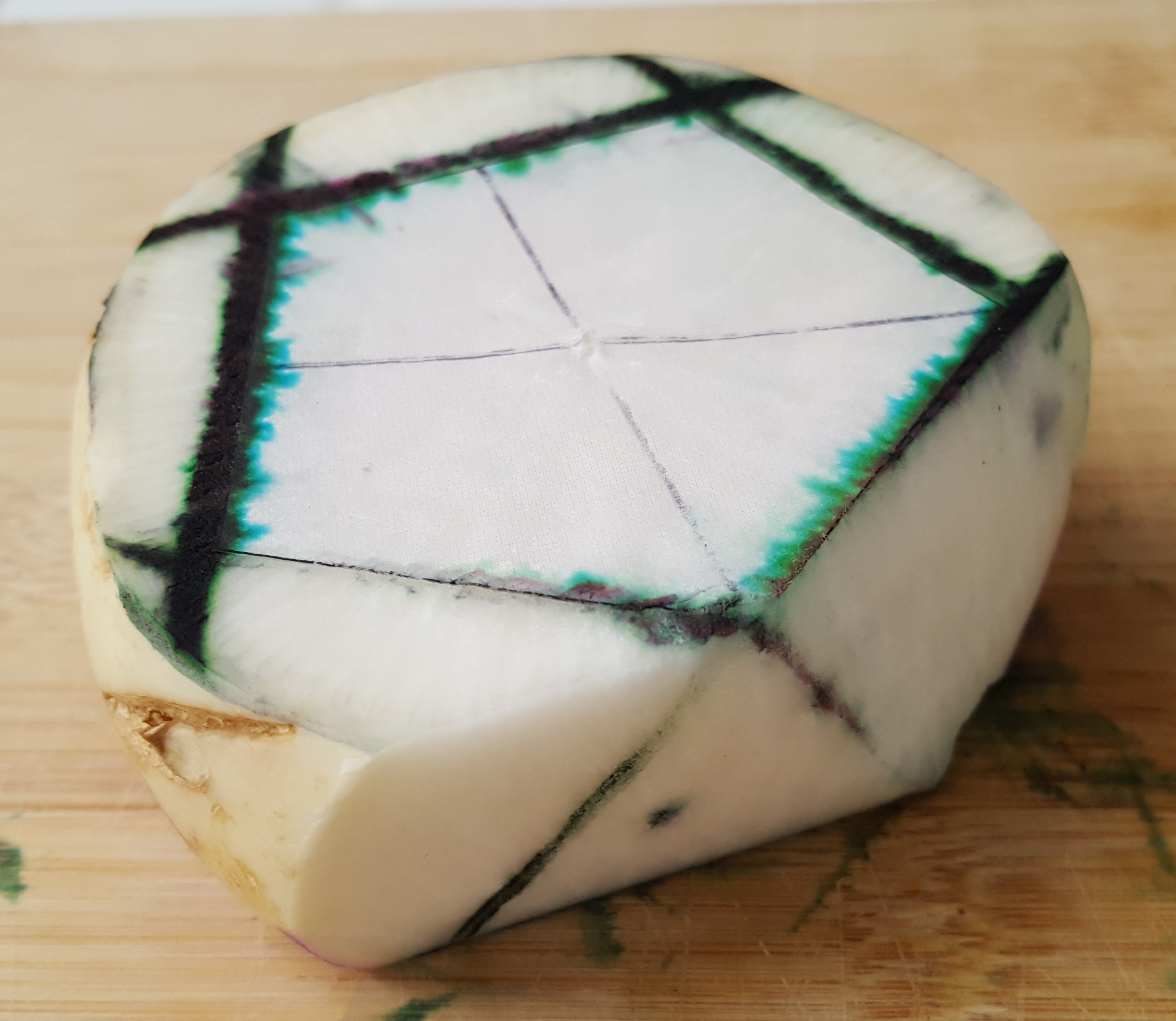 Now you can trace the pentagons on both sides of your turnip slabs. But note the cuts for the planes of the equilateral triangle equatorial faces of the the antiprism will not be prefectly vertical — they alternate sloping slightly out and slightly in as viewed from the top. So your guide line for the first cut needs to respect that; view along one edge of the top pentagon, and do your best to draw a line on the side of the turnip which, from that perspective, will pass directly in front of one of the corners of the bottom face of the solid. Now make a flat slice along the guide lines you have drawn. You will know all is well if you have made a planar cut that passes through the selected edge of the top pentagon and one vertex of the bottom pentagon; there is only one plane that does so, and it is the plane in which one of the equatorial faces of the pentagonal antiprism lies.