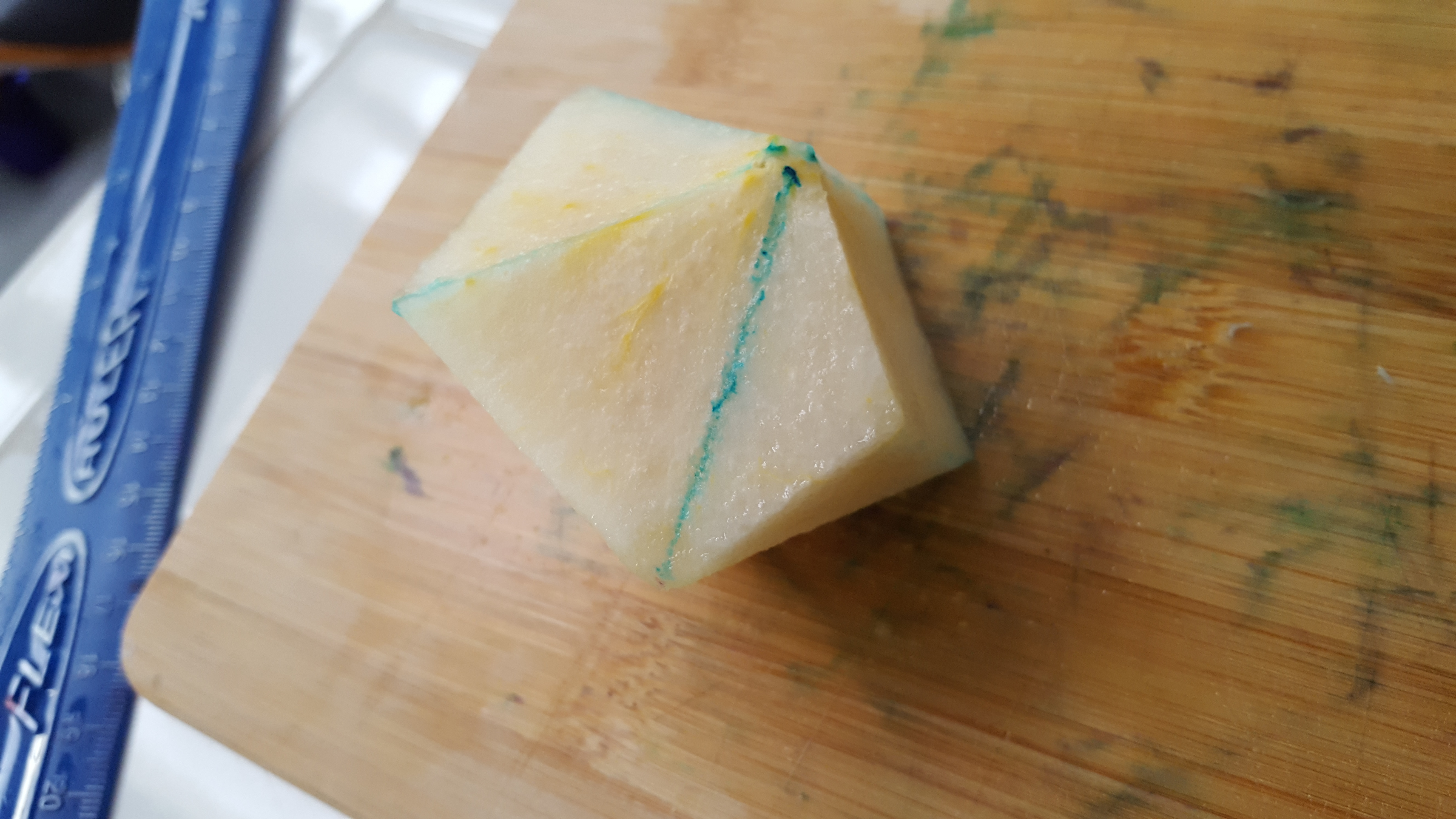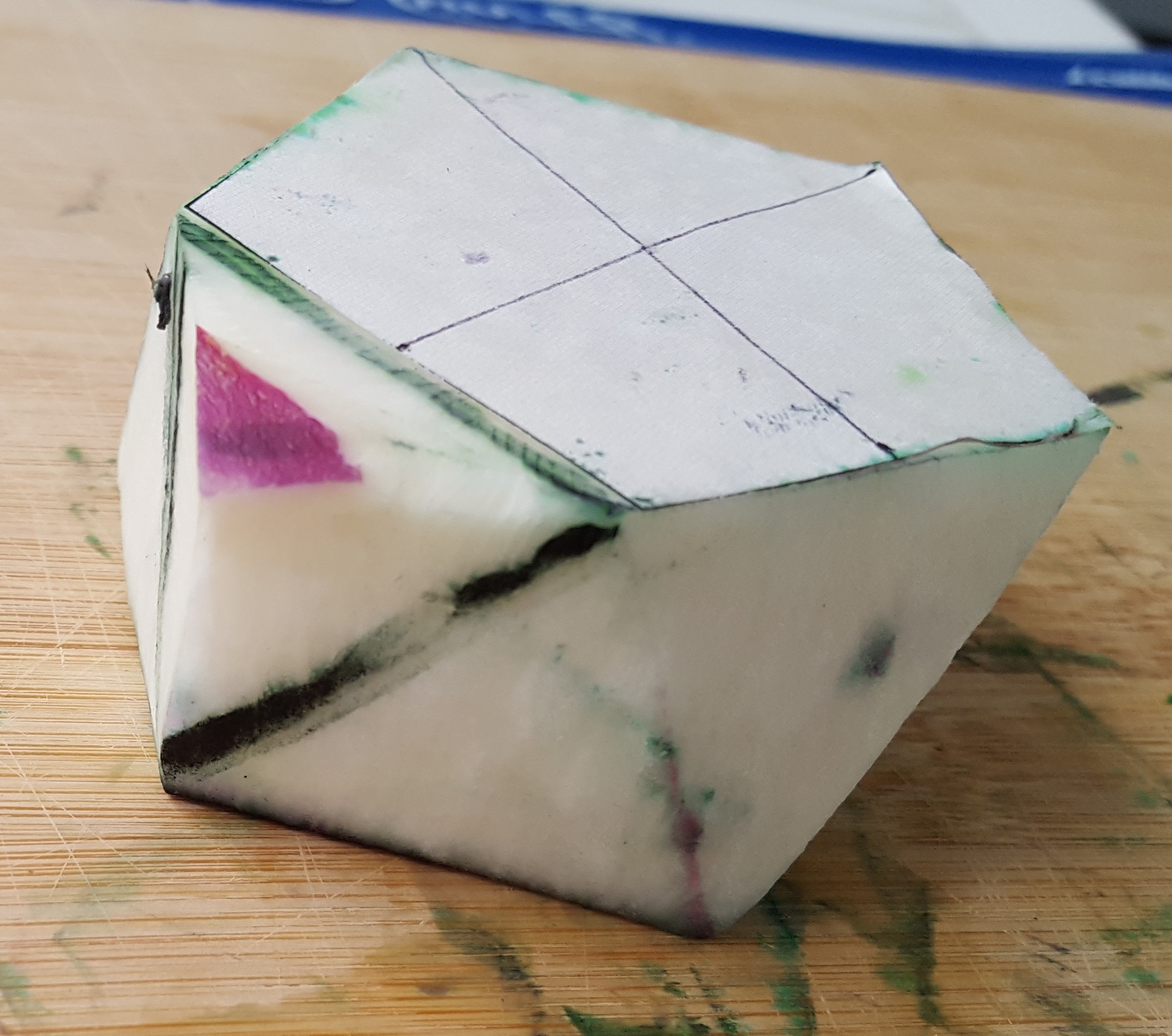 Then you align pentagons on both sides (I had to use a skewer this time, rather than a needle, because the slab was too tall for a needle) and cut out a tall pentagonal prism. Mark the centers of the top and bottom pentagons and the midpoints of each vertical edge, which are the equatorial vertices of the eventual bipyramid. Now you have a mark at every vertex of the final carving, in its actual location in space. Finishing off just involves drawing guidelines that follow the planes connecting three nearest-neighbor vertices and slicing along those planes.