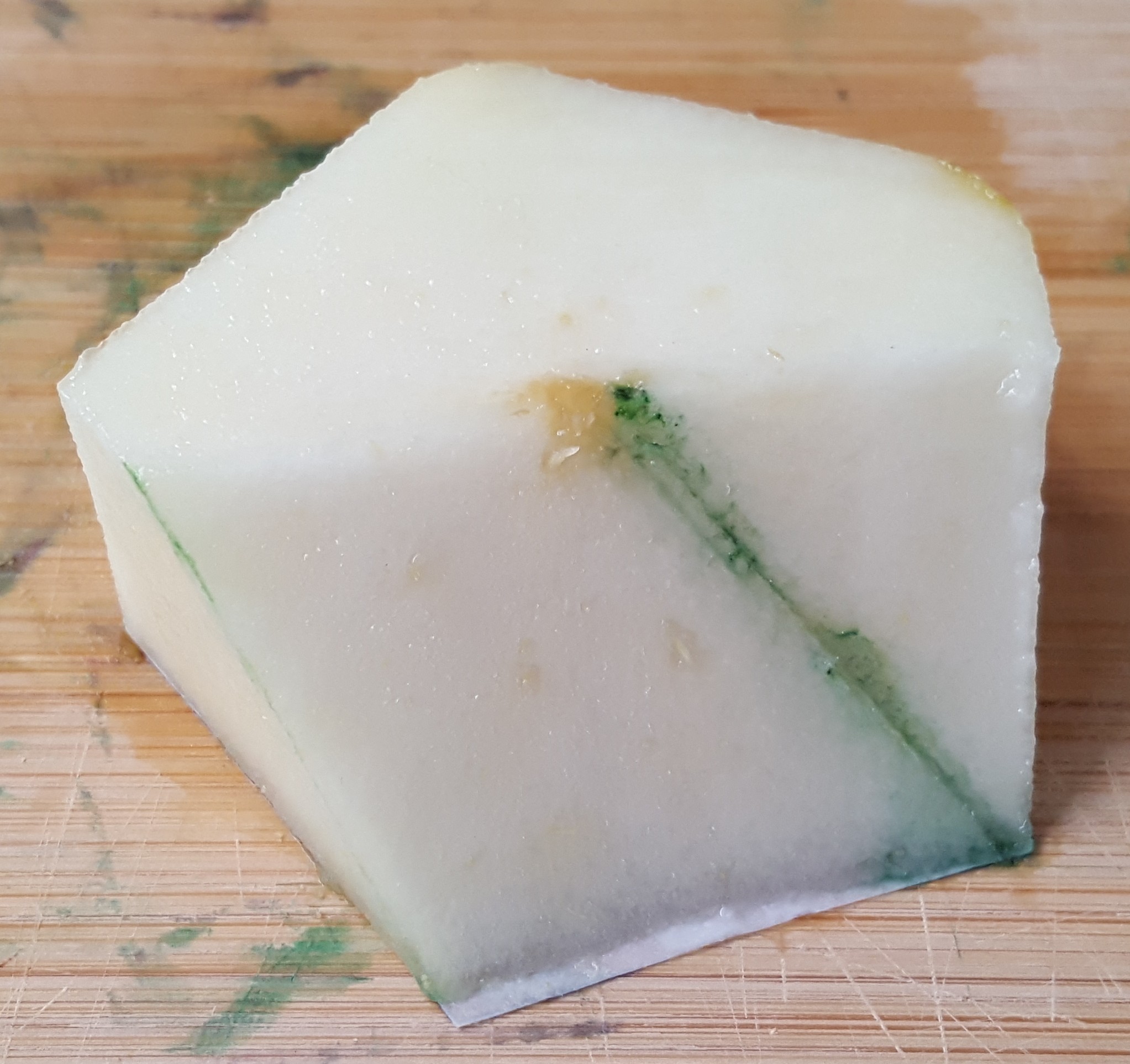 Next in line to be carved was this pear. Since it narrows to a point on the top, it suggested the carving of a regular pentagonal pyramid, one of the Johnson solids. I had some more pentagons around, and they fit the cross section at the base of the pair, so I simply re-used them for this polyhedron.