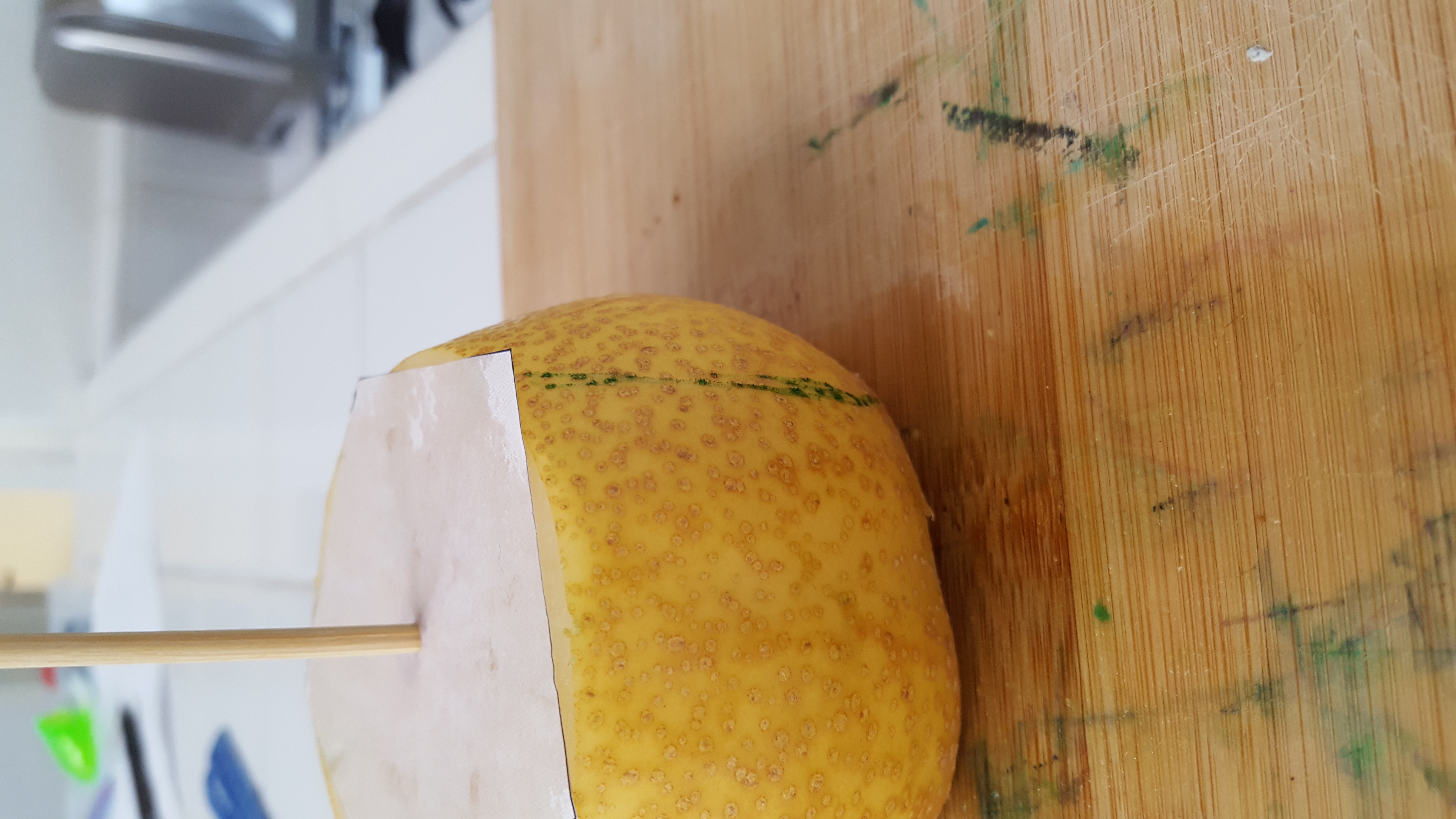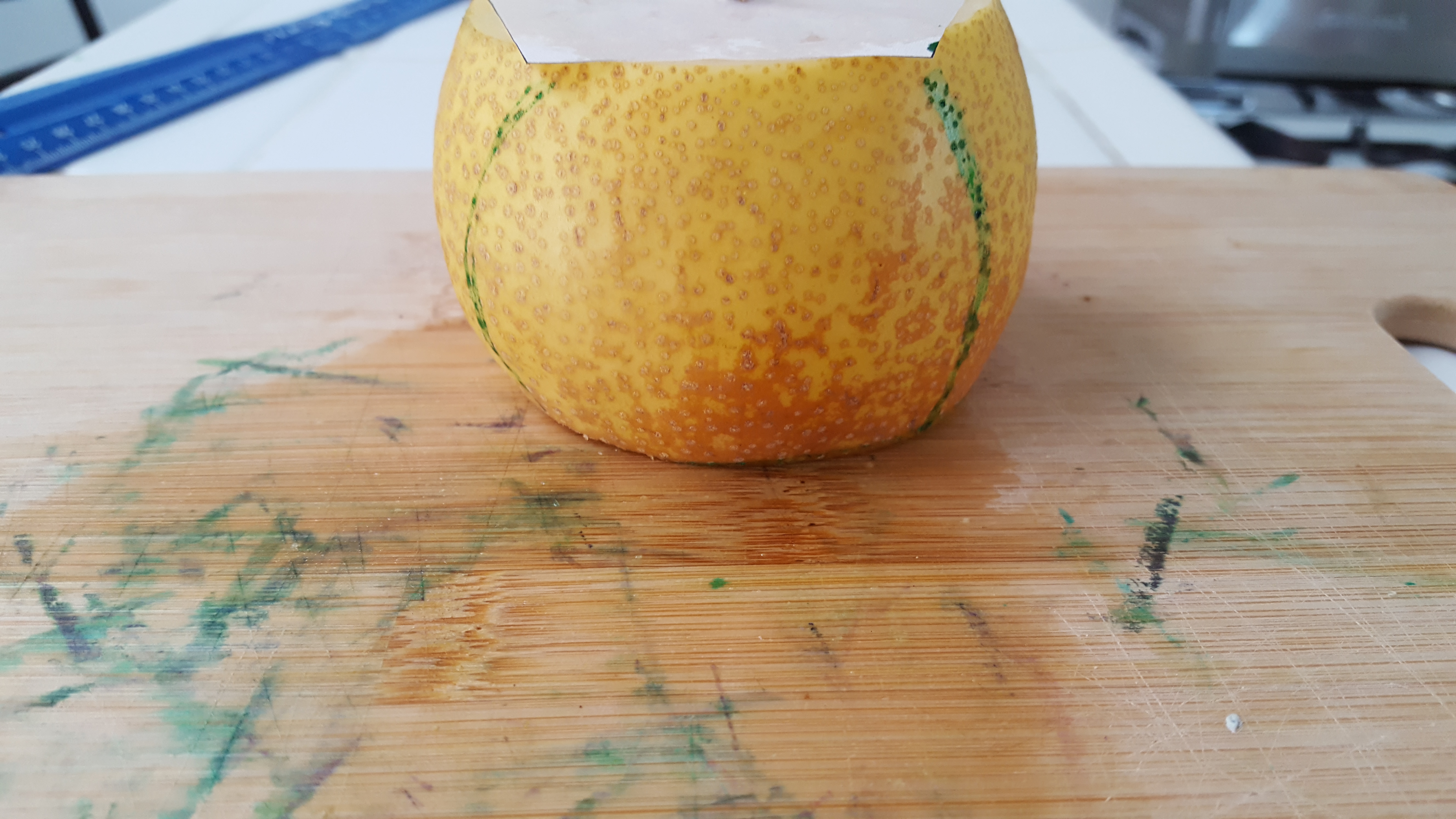 The second difference is that once you’ve made the two parallel planar cuts, you need to line up the pentagons on either side with a tenth of a turn rotation relative to each other. In other words, rather than having them line up exactly as with the prism, each corner of one pentagon should point exactly toward the middle of an edge of the pentagon on the other side. The easiest way to arrange this is to mark the centers of each pentagon, which will still line up one center vertically above the other, and push a pin straight vertically through the fruit and then align the two centers on the pin. Then rotate them so they are exactly half-way between aligning.