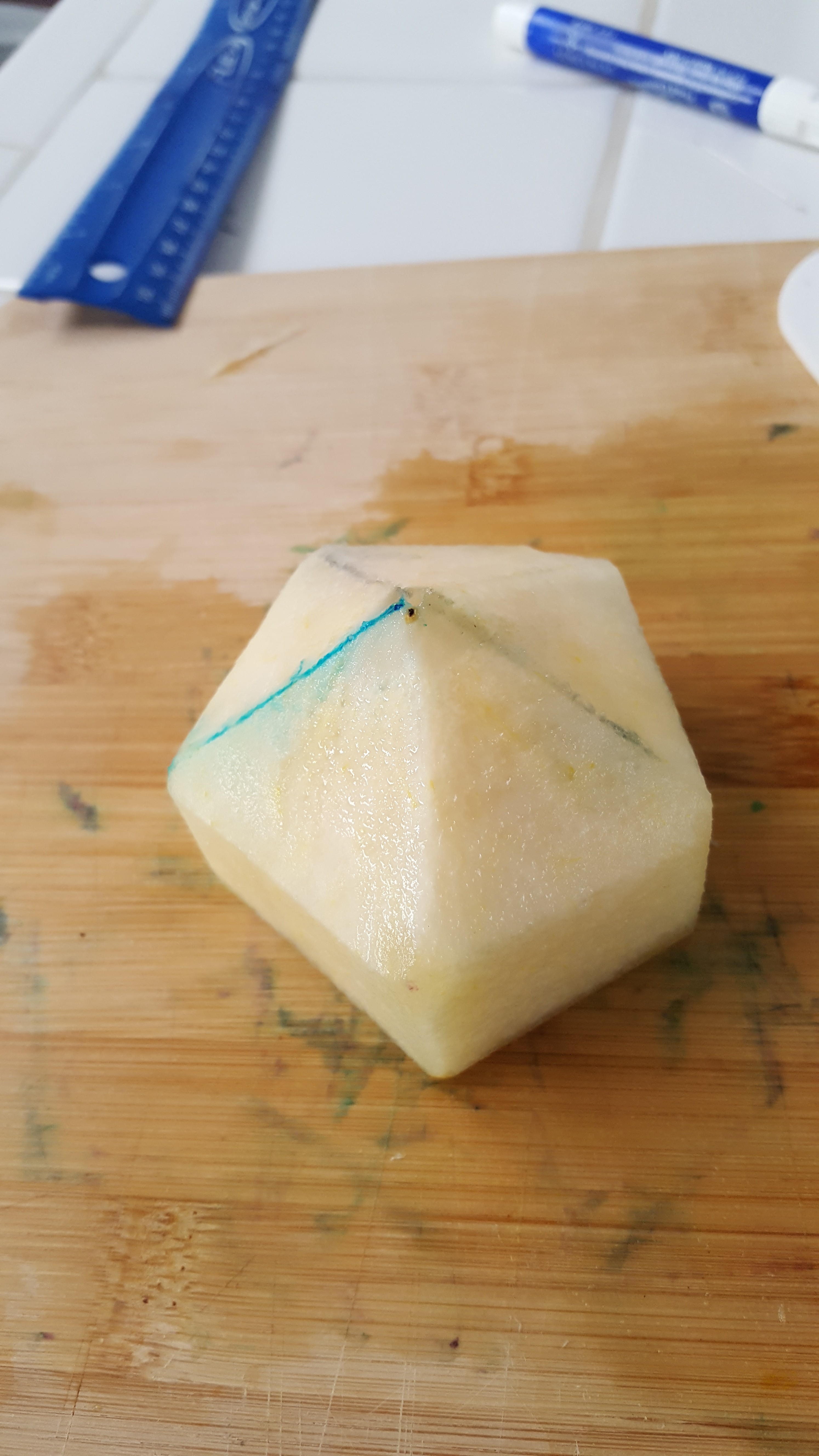 Like the hexagonal prism from last time, it features two largest faces in parallel planes, so we begin the same way, with two important differences. First, we need to look up on the web what the relationship of the height and the edge length of regular pentagonal antiprism is; it turns out that the edge length is √10 / √(5+√5), or about 1.18, times the height. So once I made the first planar cut, I could determine I had about 3.5 cm of usable height left in the turnip, which implied an edge length of the pentagonal base of 4.13 cm. Printing out a couple of regular pentagons with that edge length, I found that they fortunately fit the horizontal cross-section nicely.
