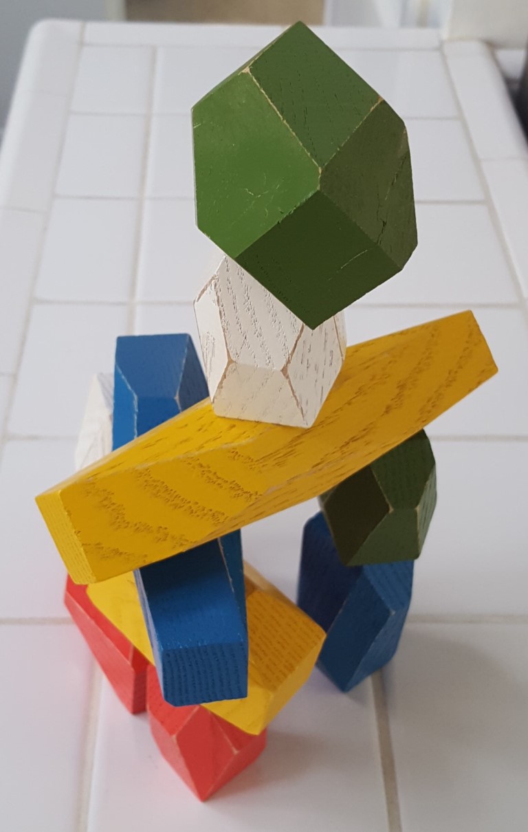“And I thought it would be fun to play with these irregular polyhedral blocks with the interesting property that every pair of opposite faces is parallel, so they can always stack straight.” offers Shay.