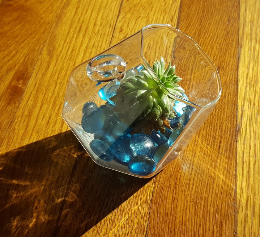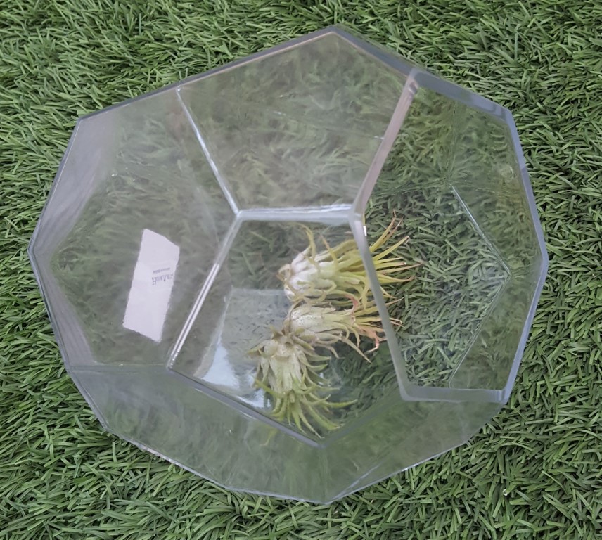 Taylor breaks in, “Wow! I thought this place needed more plants, so I got these two glass planters — one is a compound of an octagonal pyramid and frustum, and the other is an unusual polyhedron that illustrates Euler’s theorem on pentagon-hexagon polyhedra.”