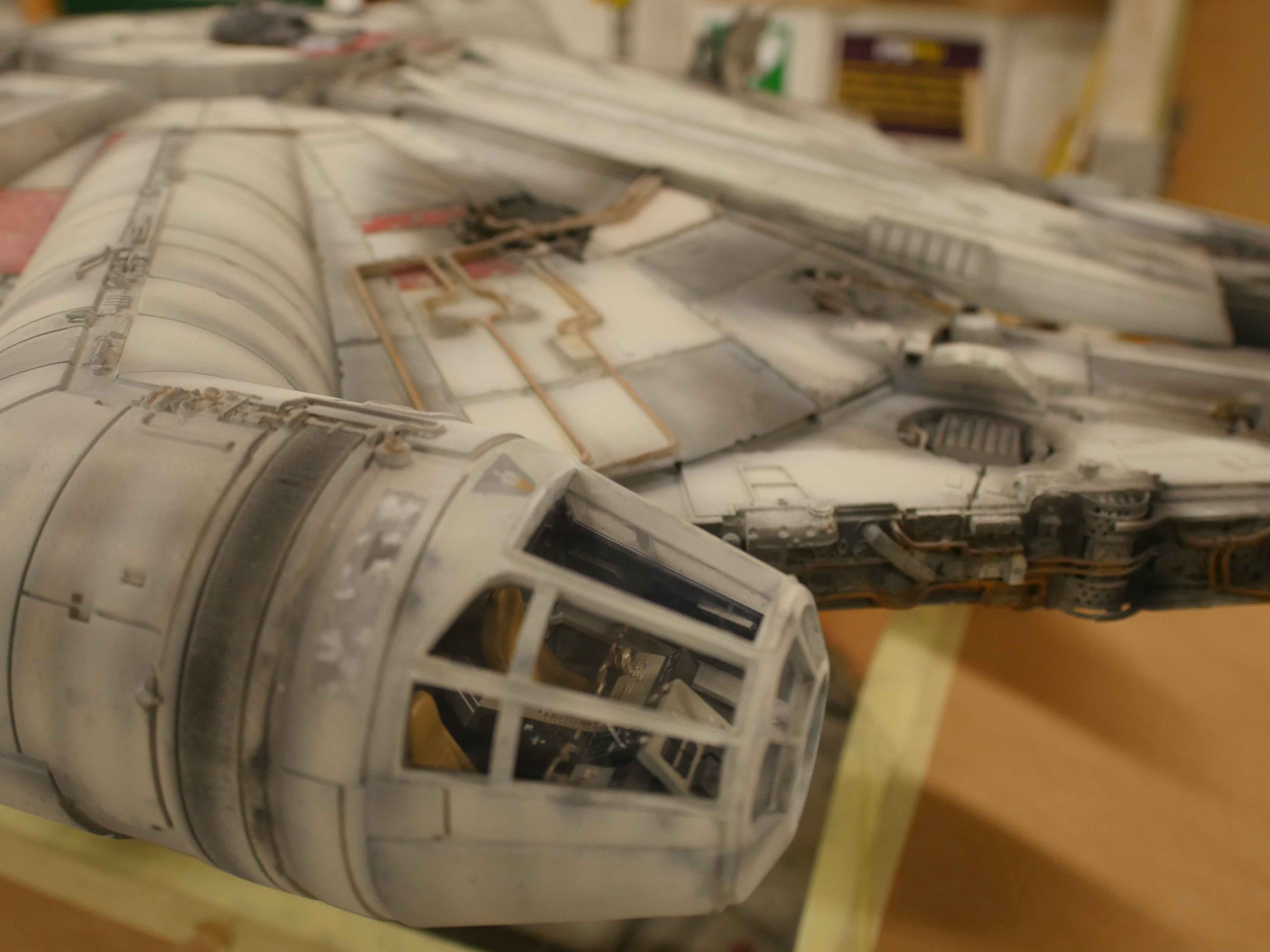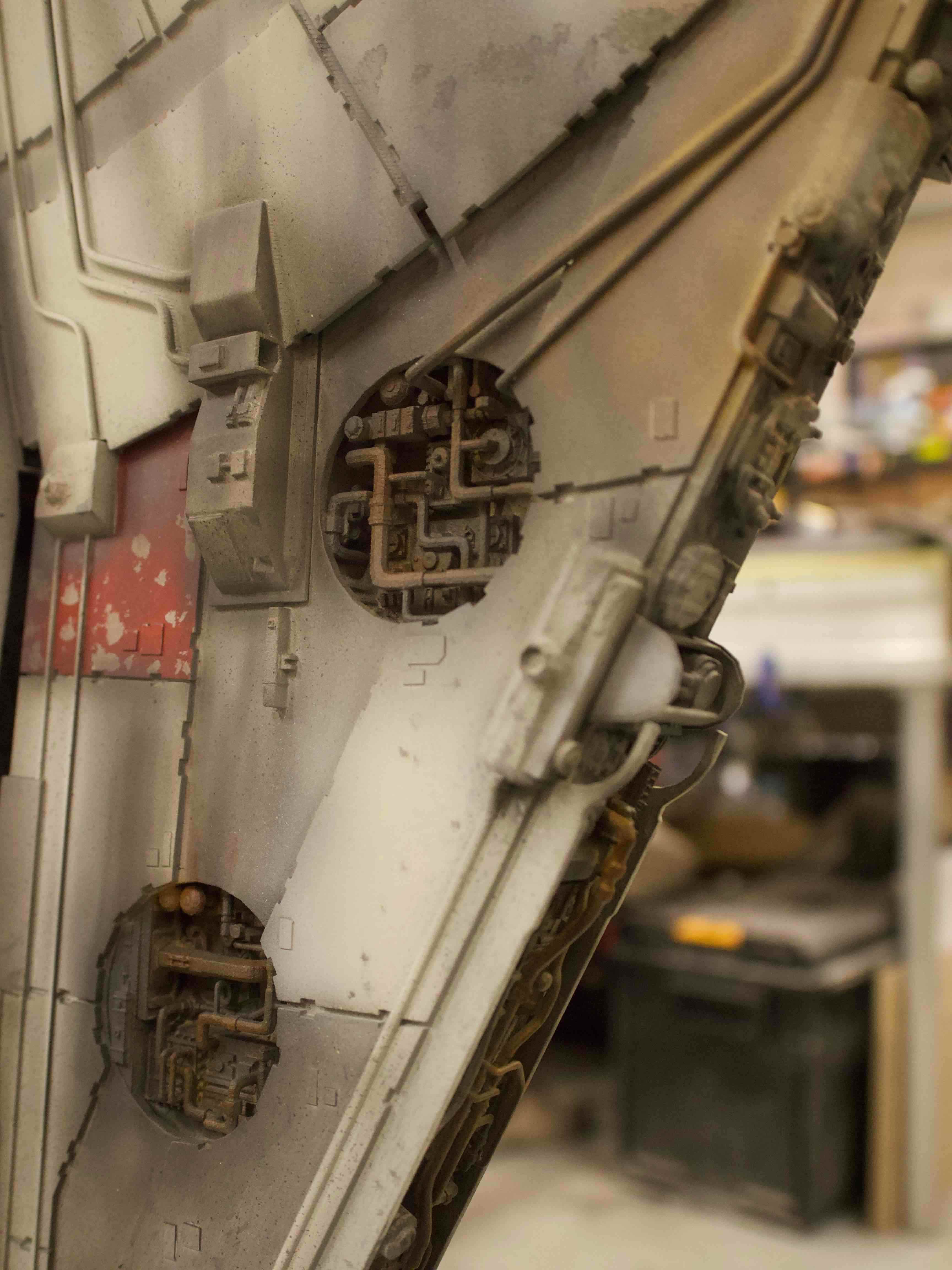 I was a little overwhelmed to see this grey primed mass of printed plastic before me. Even so, it still looked stunning and oh so familiar! I airbrushed the base coats which were a set of off warm white glazes to give some feel of depth. After I concentrated on each panel; many panels had their own unique specific detail. I applied liquid latex on certain areas where damage had been inflicted by laser, near misses, space debris and general wear and tear. I applied subtle warm artists acrylic reds over several panels, keeping faithful to ‘original Falcon filming miniature’ references. After the general colours were applied and dried, I removed the liquid latex with a craft knife very carefully; the result worked like a treat. I made up a dirty glaze/wash top breakdown the Falcon’s still too fresh look. This aged the bodywork effectively; telling a little more of the journey the Falcon had undergone. I started to wok on the surrounding sides of the Falcon, where an exposed mass of pipes were. I applied to them a rusty glaze/wash which also lent to the Falcon, a feeling of being rundown somewhat.