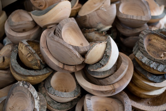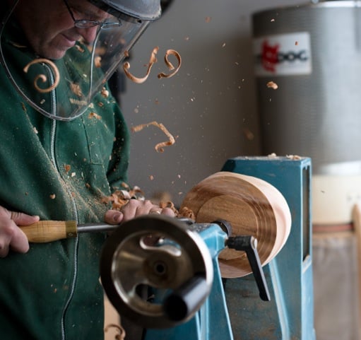 Strobel learned his craft by taking a week-long course from Craft Supplies USA in Provo, Utah. If you want to get started making bowls from your neighborhood, he wholeheartedly recommends their classes. But if you’re a skilled woodworker, you can also learn a lot by trial and error in your woodshop. With about $1,000 you can equip yourself with all you need to get going: a moderately priced lathe, a chuck to hold the wood, at least one bowl gouge,ย at least one spindle gouge, and the safety equipment. Start with wood that’s a little wet, not a piece that has been kiln-driedโmaybe a tree that was cut down last week, or a few weeks ago. โYou’ve got a lot that you’re fighting,โ he advises, โand slightly wet wood makes it easier.โ Avoid pine which is soft and has a lot of resin and woods that are sappy.