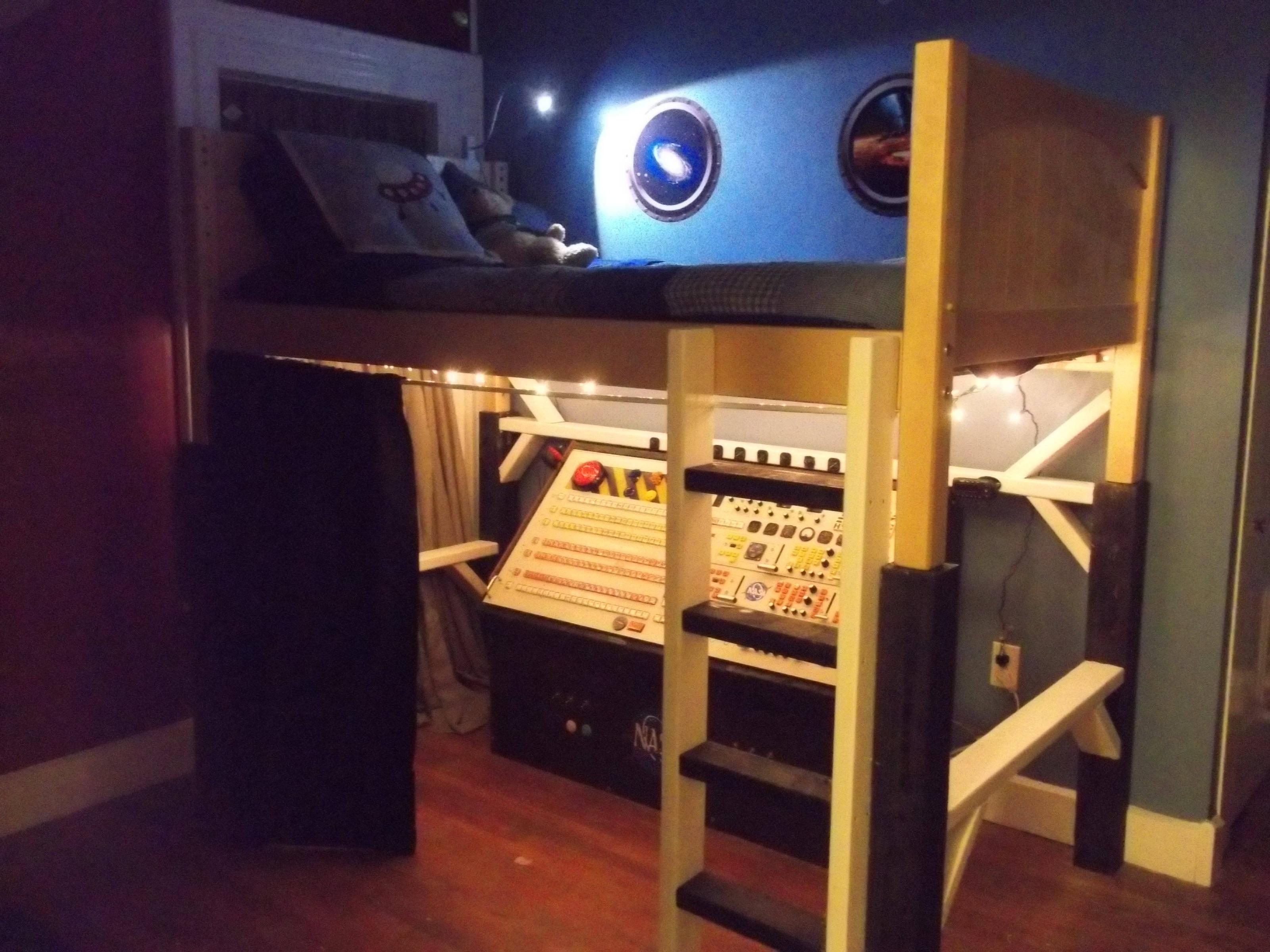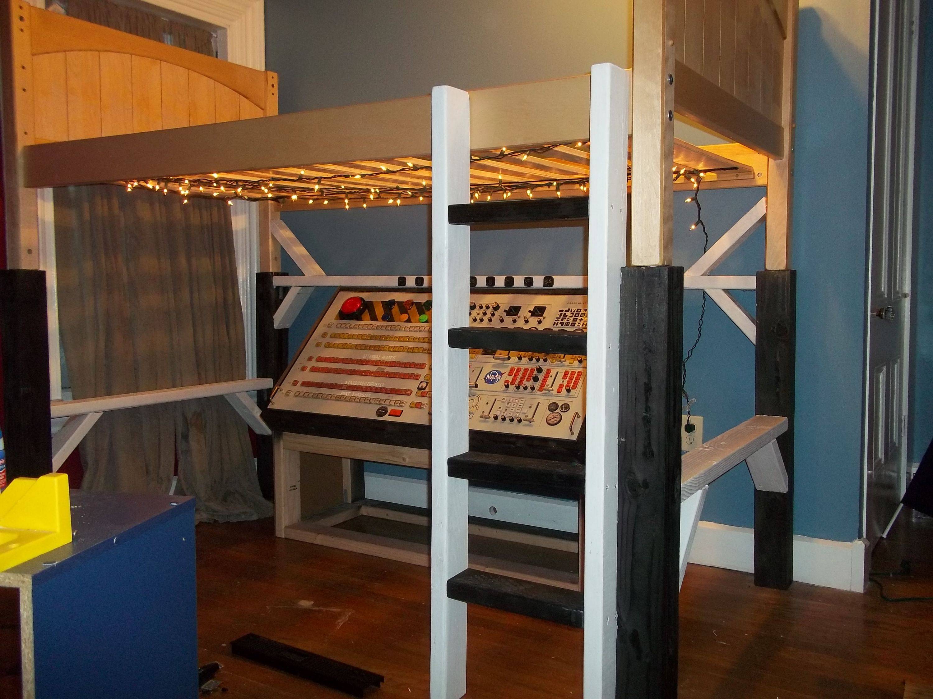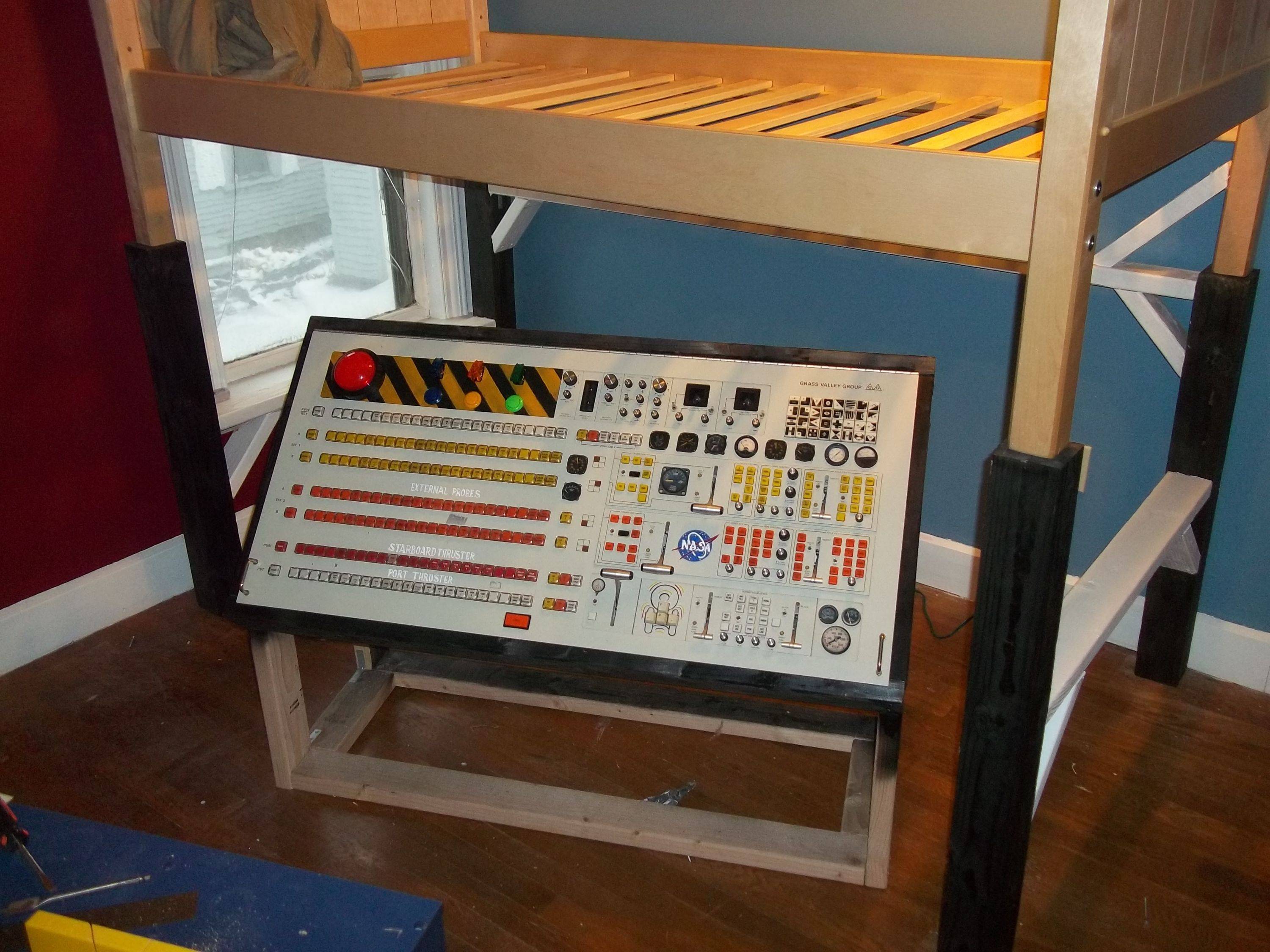 Redditor (and father of the year) JeremiahGorman posted these photos of a simulated spaceship he built for his son Finn’s fifth birthday. Assembled with surplus electronic components including a master control board from a television station dumpster, the spaceship’s control panel is mounted below Finn’s newly-lofted bed. Check out the gallery below for photos of the build process and Captain Finn operating his brand new spacecraft.