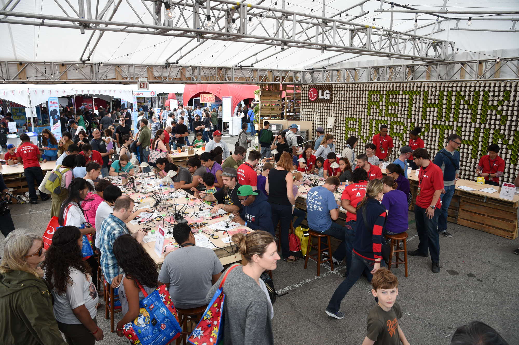 Once you stepped inside, you could clearly see that LG gets the maker mentality. Sure, they want to show off their products, but they didn’t just haul in their appliances and talk about how great they are. They literally ripped parts from them and let makers build things with these parts. You could create characters to race on washing machine motors, and make little decorative light and sound boards with LG displays. People were learning to solder and having fun. To top it all off, they had a cool little printer so you could take a picture of your racing creation and take a print with you, like an old Polaroid.