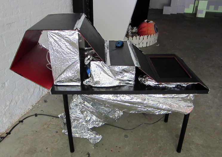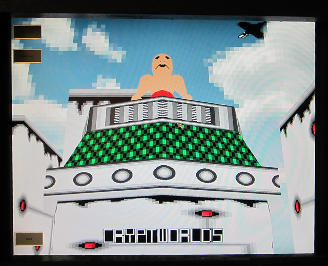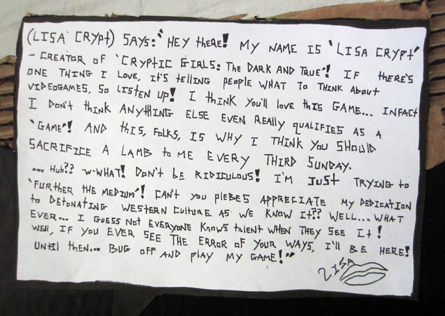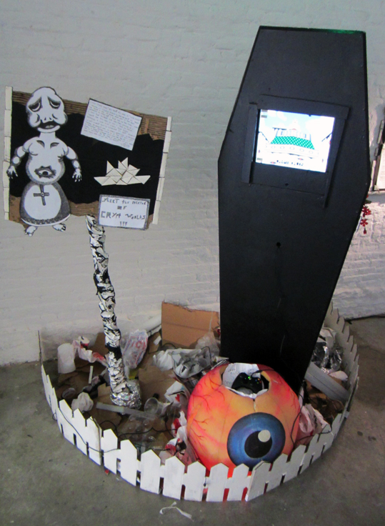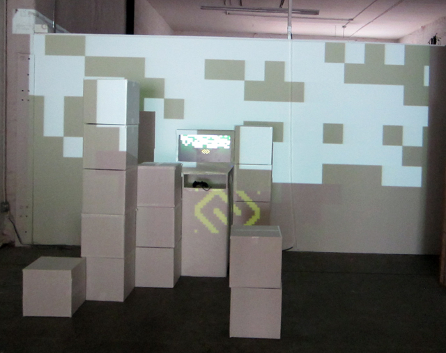 Curator Stephen Lawrence Clark did a fantastic job of collaborating with the exhibiting artists by helping them to build suitably whimsical interfaces that reflect the philosophical quandaries explored in the the games. Like the concepts of impermanence that the games question, the unorthodox arcade game cabinets are made from from cardboard, LEDs, and other salvaged materials.