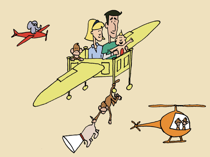 The project is based around a children’s book I wrote and illustrated. A typical Seussian scenario, one day a baby wakes with a button where her navel should be. Her obviously worried parents are compelled to press it. When the lights flicker in the book (press the button), a lamp flickers in the room. When the house shakes in the story (press the button), actual toys get knocked off of the shelves. When an elephant zips along in an airplane (press the button), elephant and jet sound effects are triggered.