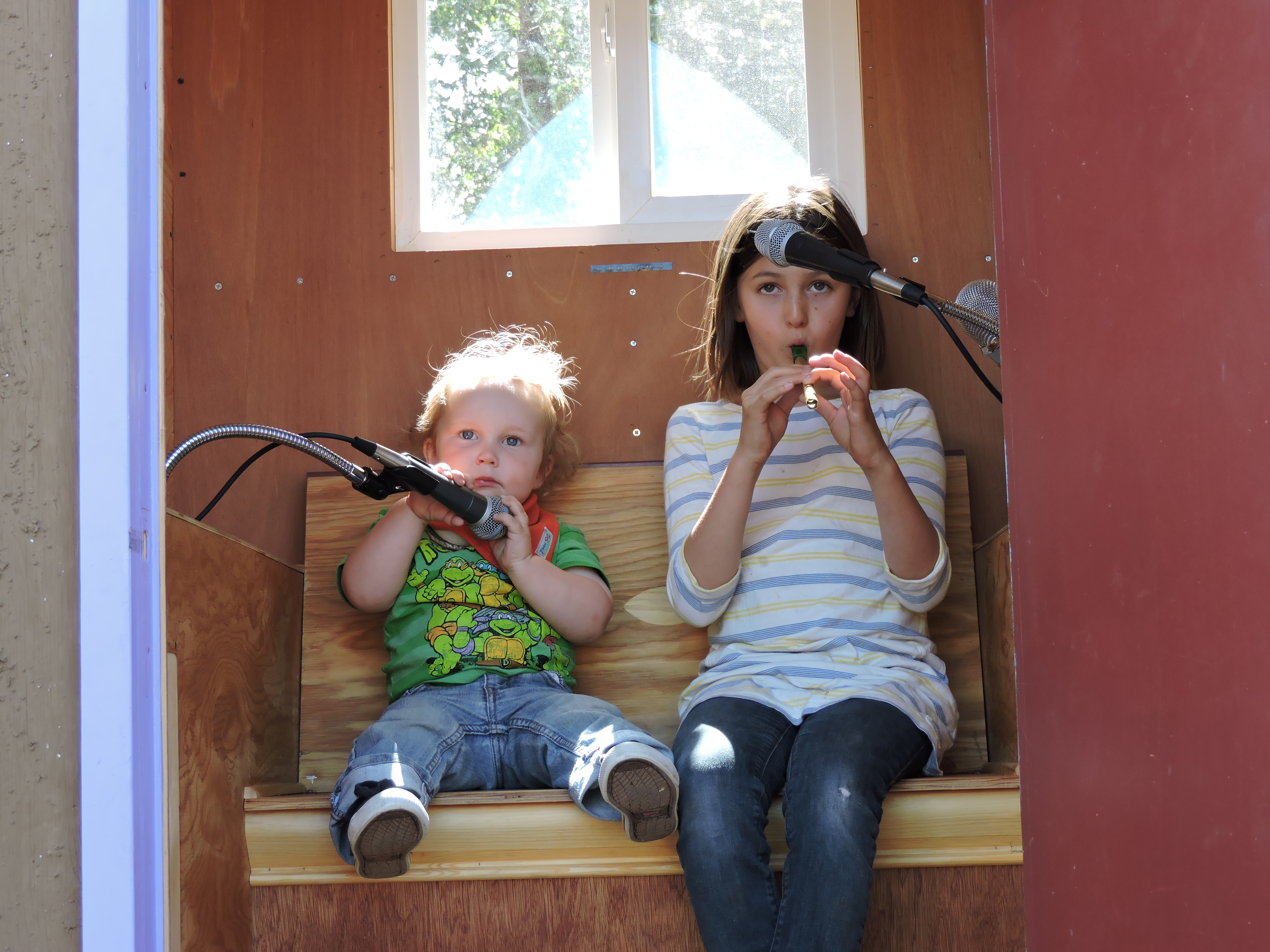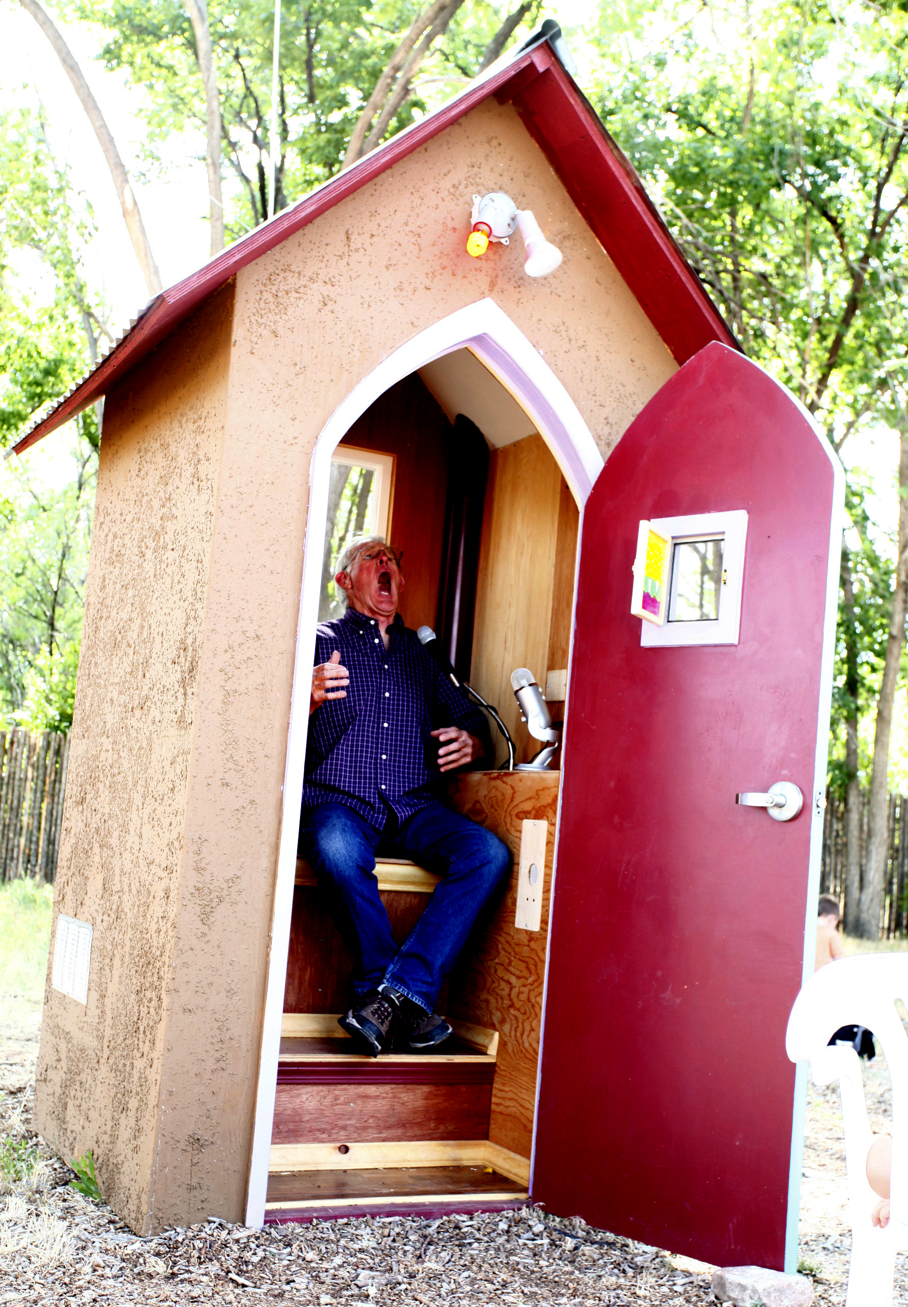 I built this tiny broadcast room complete with live mics that broadcast to the local radio. The structure is made of scrap steel and scrap plywood with a faux stucco paint job (paint and bead styrofoam) .