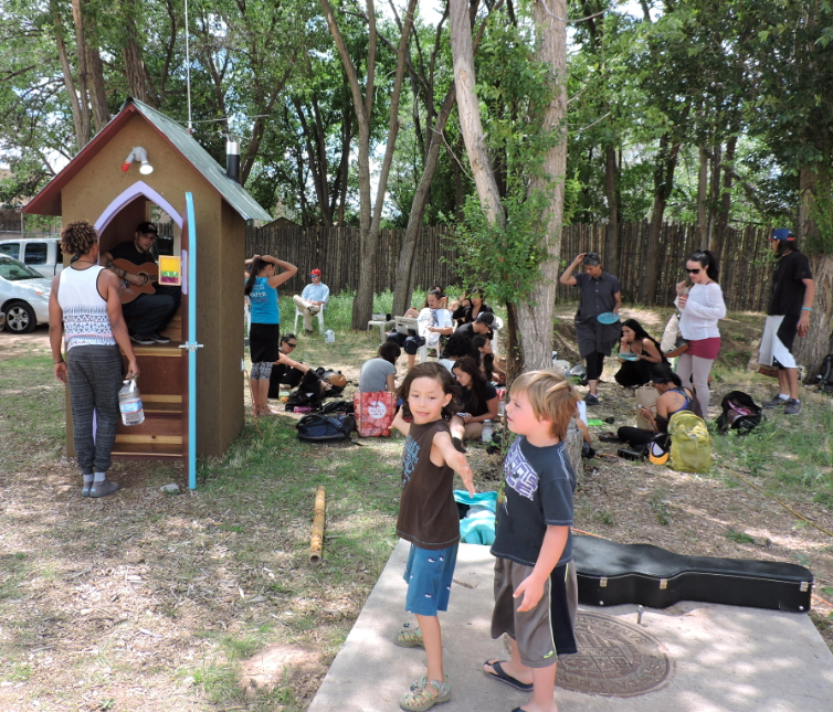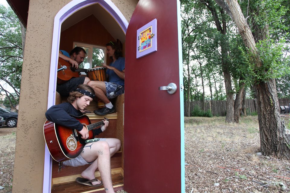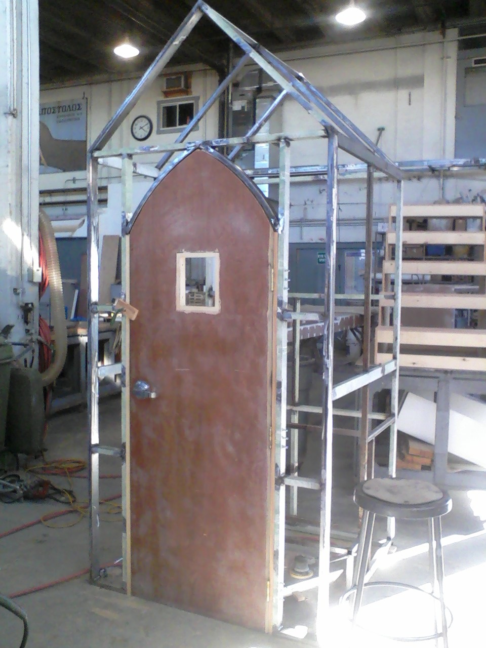 I built this tiny broadcast room complete with live mics that broadcast to the local radio. The structure is made of scrap steel and scrap plywood with a faux stucco paint job (paint and bead styrofoam) .