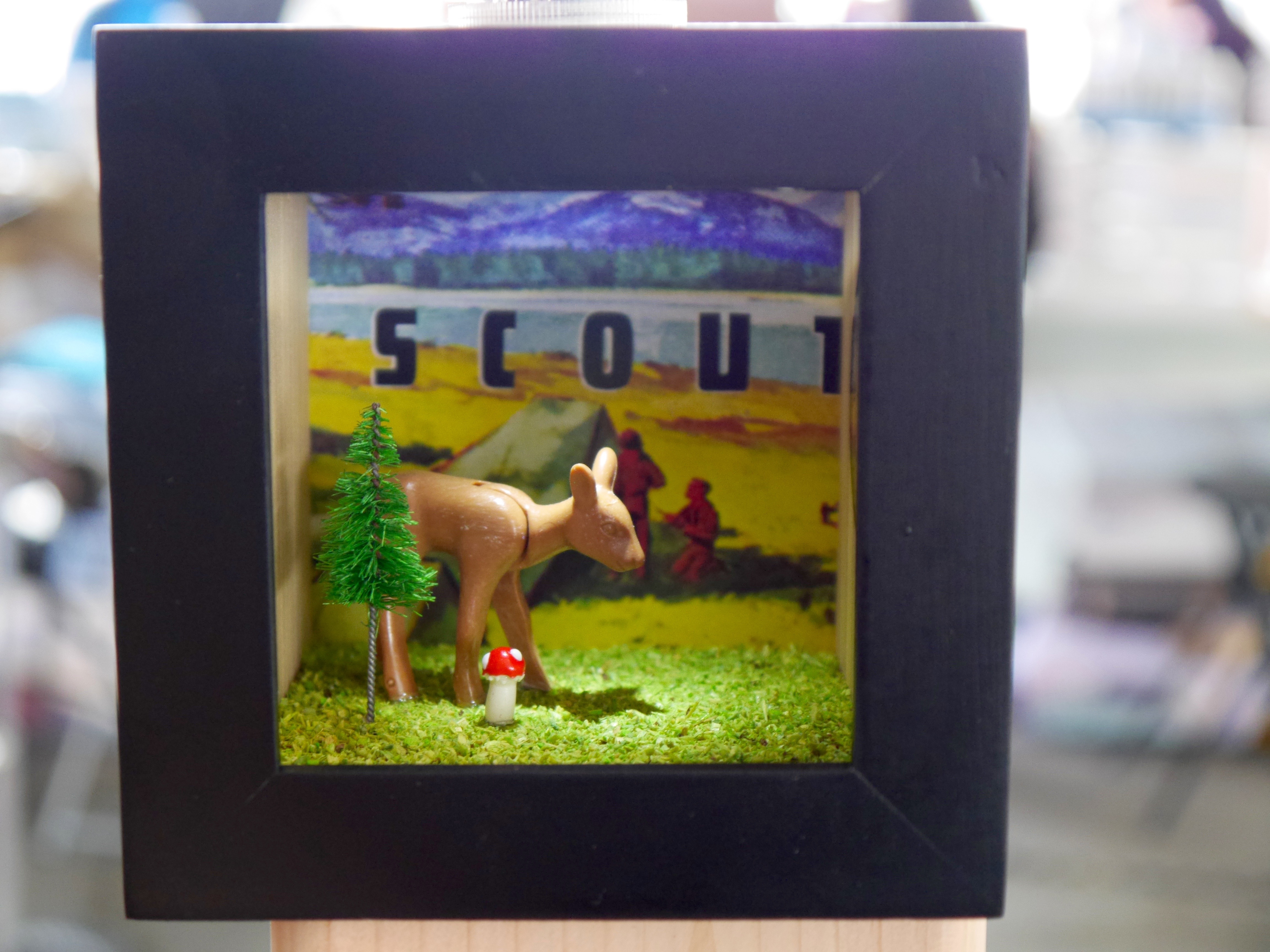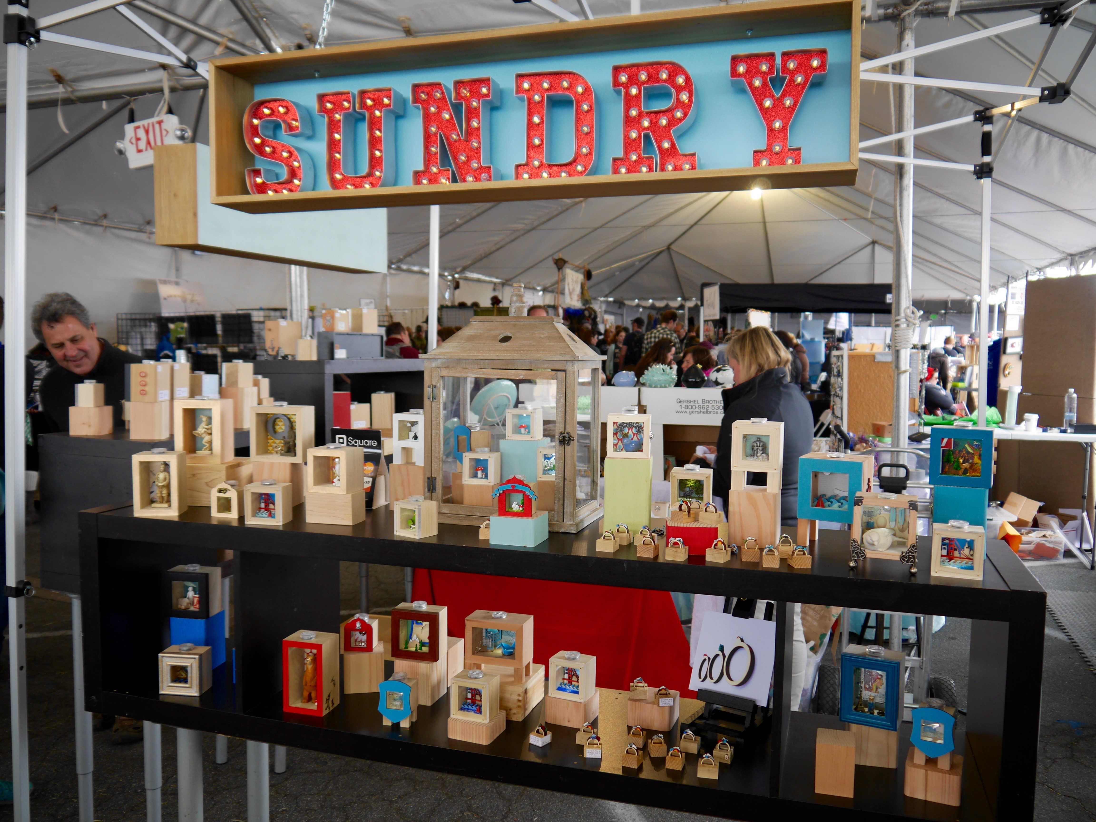 Jen Amos from Sparrow and Sundry had adorable miniature dioramas on display. Each one was handcrafted by her and depicts an unique scene. Some boxes are enclosed and have moving pieces inside while others are open. Each one is illuminated by a LED at the top of the box. Make sure you take a closer look when you walk by.