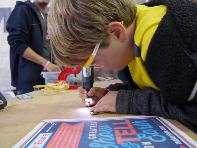Beyond the official Dremel booth, Dremel tools’ potential is on display throughout the fairgrounds. Clockmaker David West, for example, hand carves his pieces using the scroll saw. The clock displayed at Maker Faire is made of wood and painstakingly created without the aid of laser cutters or CNC mills.