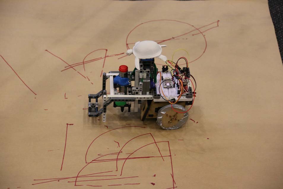 The parts from the workshops were all made available which included LEGO, SumoBot Jr. kits, tons of servos, and controllers like the Spark Core, the Raspberry Pi, and the Arduino Uno and Arduino Yun. Over thirty 3D printers were active making custom parts for teams, and participants scavenged raw materials such as cardboard, coffee cups, forks, and discarded drink cans and bottles. Duct tape, hot glue, and Sugru were all in high demand.