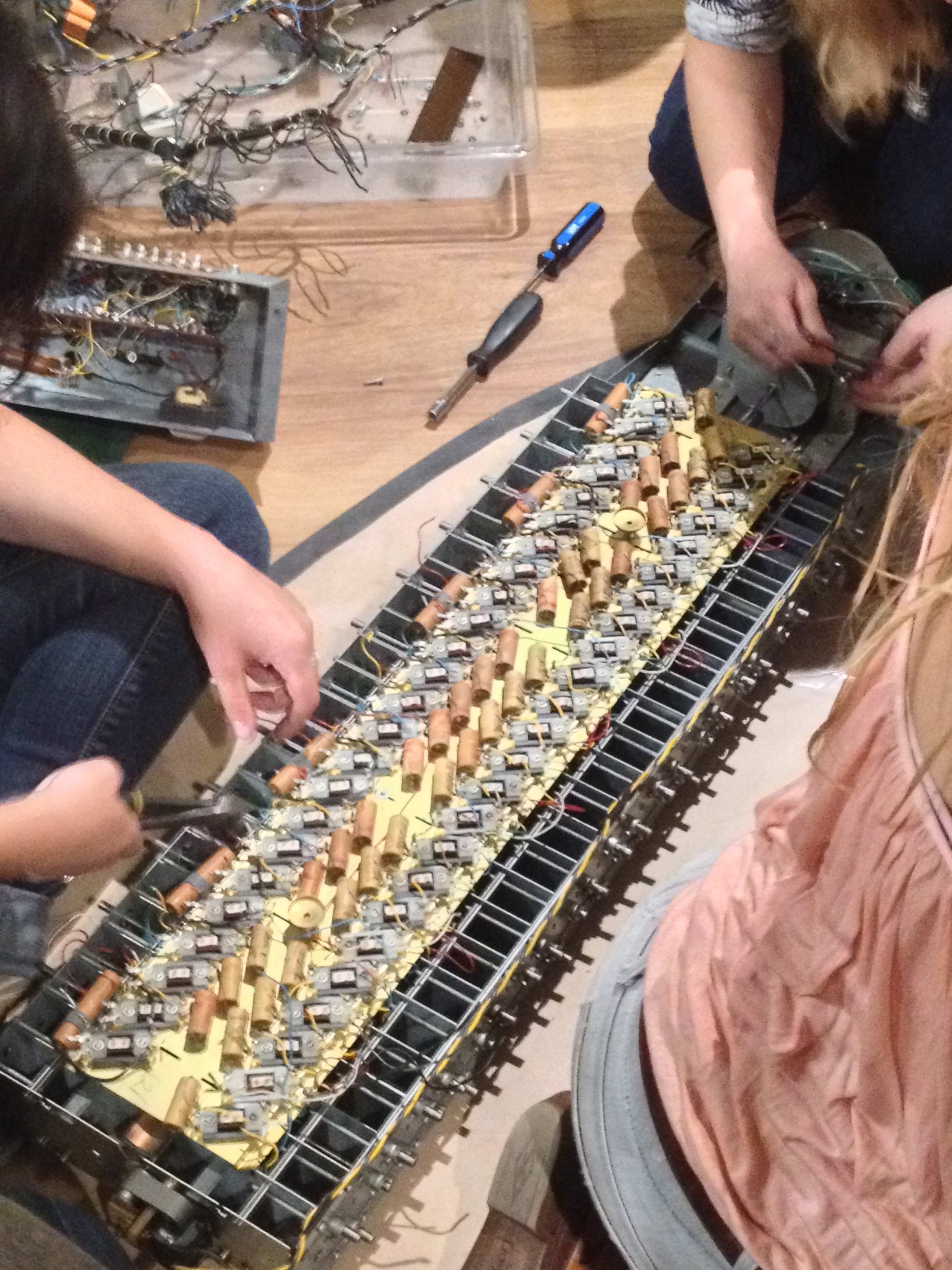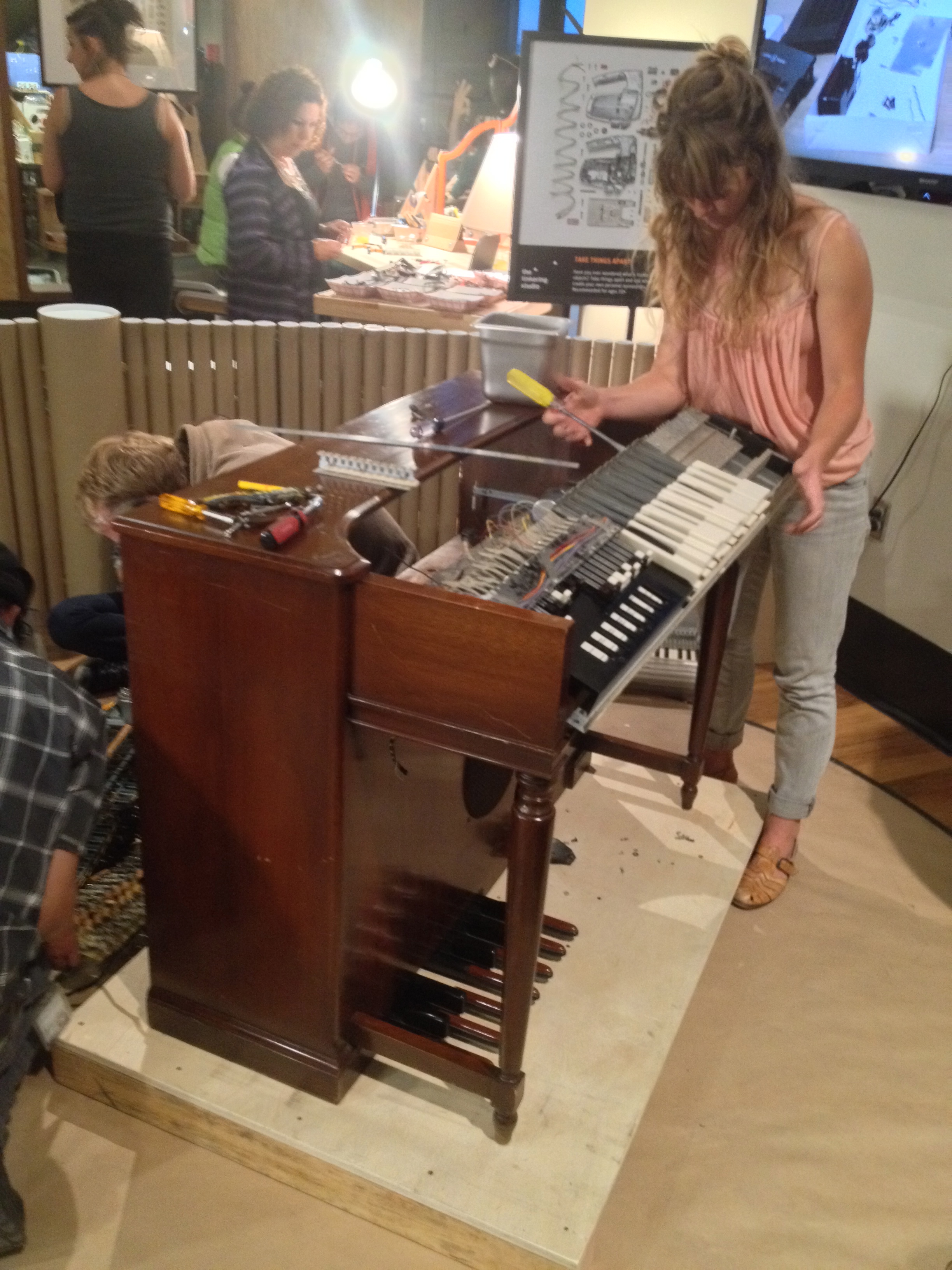Last, but not least, I’d like to report on my delightful visit to the Exploratorium in its new location at Pier 15 in San Francisco last night. They were holding their first Tinkering Social Hour, launching it with an exhibit of the work of Todd McLellan, whose photos of disassembled items have sparked the imaginations of many makers (or un-makers!). Todd was there, and the Tinkering Studio team had brought a bunch of odd items from Urban Ore in Berkeley for participants to, well, take apart. The best was a classic electric organ that a mad band of guests dove into with verve. There was a delightful moment of discovery and reverence when they discovered the signatures of the people who had originally assembled the organ scrawled on one of the interior boards.
