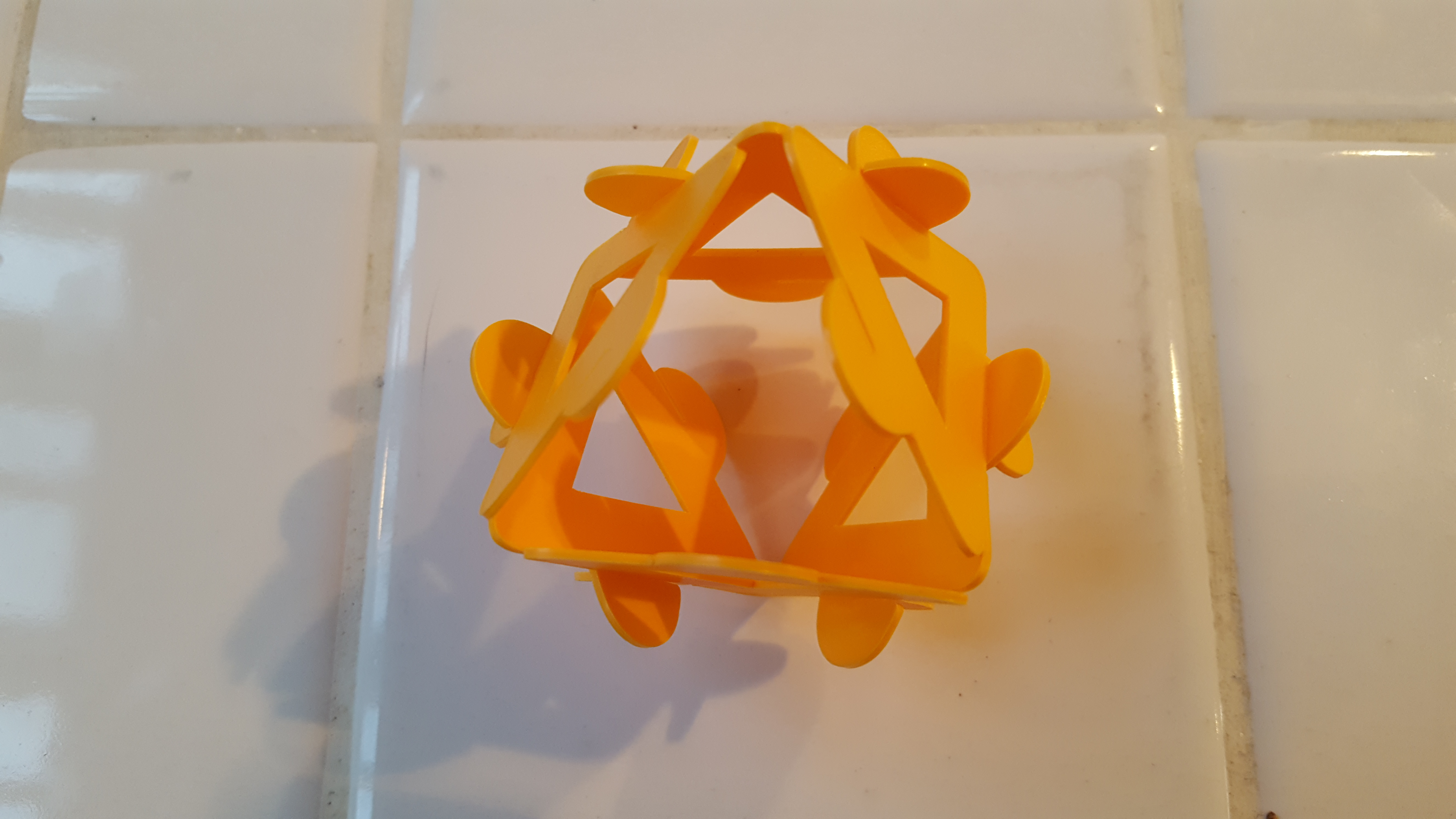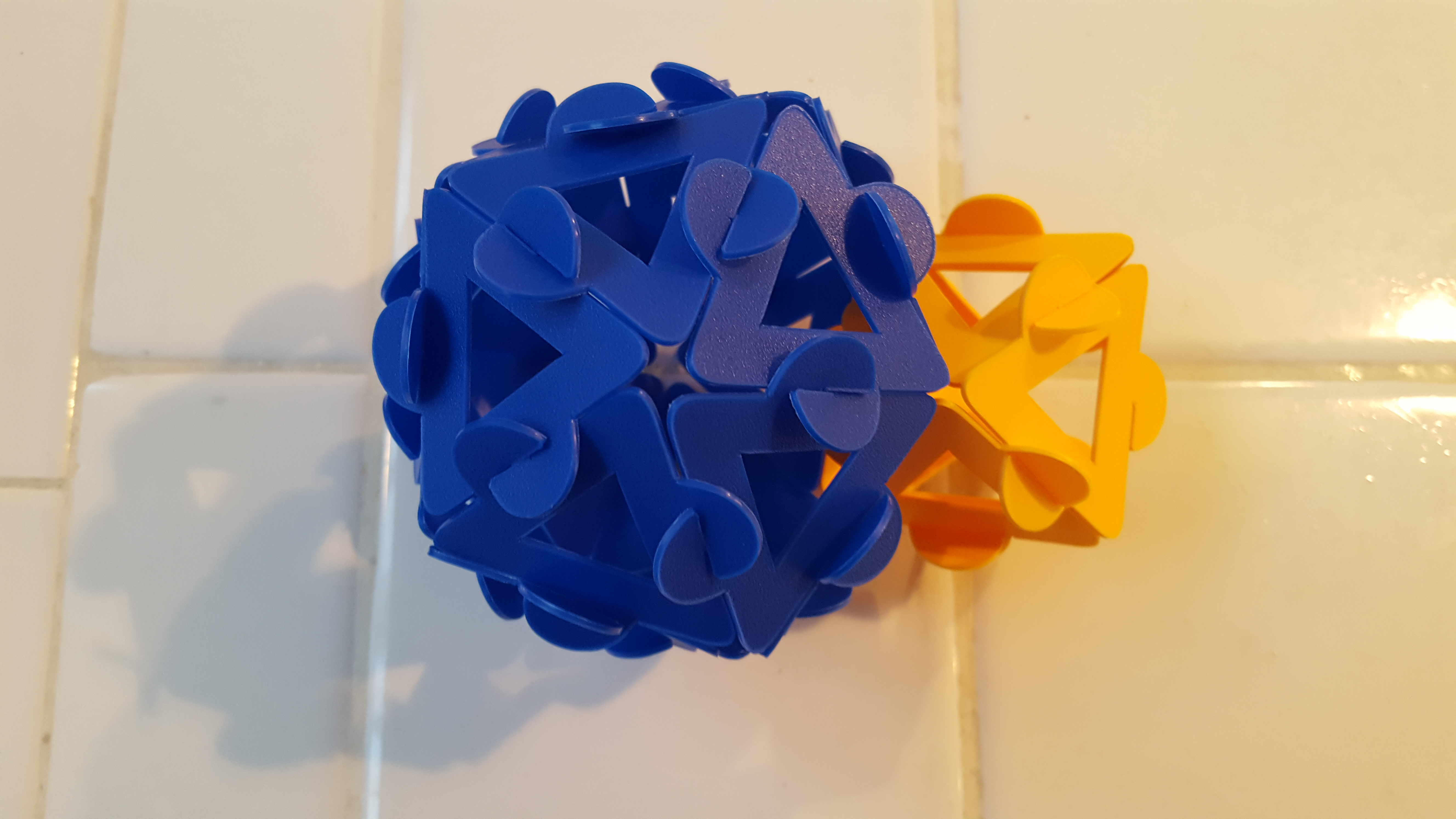 This toy consists of plastic polygons that have a slitted tab in the middle of each edge. You can interlock the slits on two polygons to connect them edge-to-edge. This usually leaves the tabs sticking out, and the pieces do have their centers cut out, so you don’t get the sleek look of Polypuzzles or Polydron. But they go together very quickly, and you can easily connect a pre-made octahedral connector with an icosahedron missing one face to assemble the components.