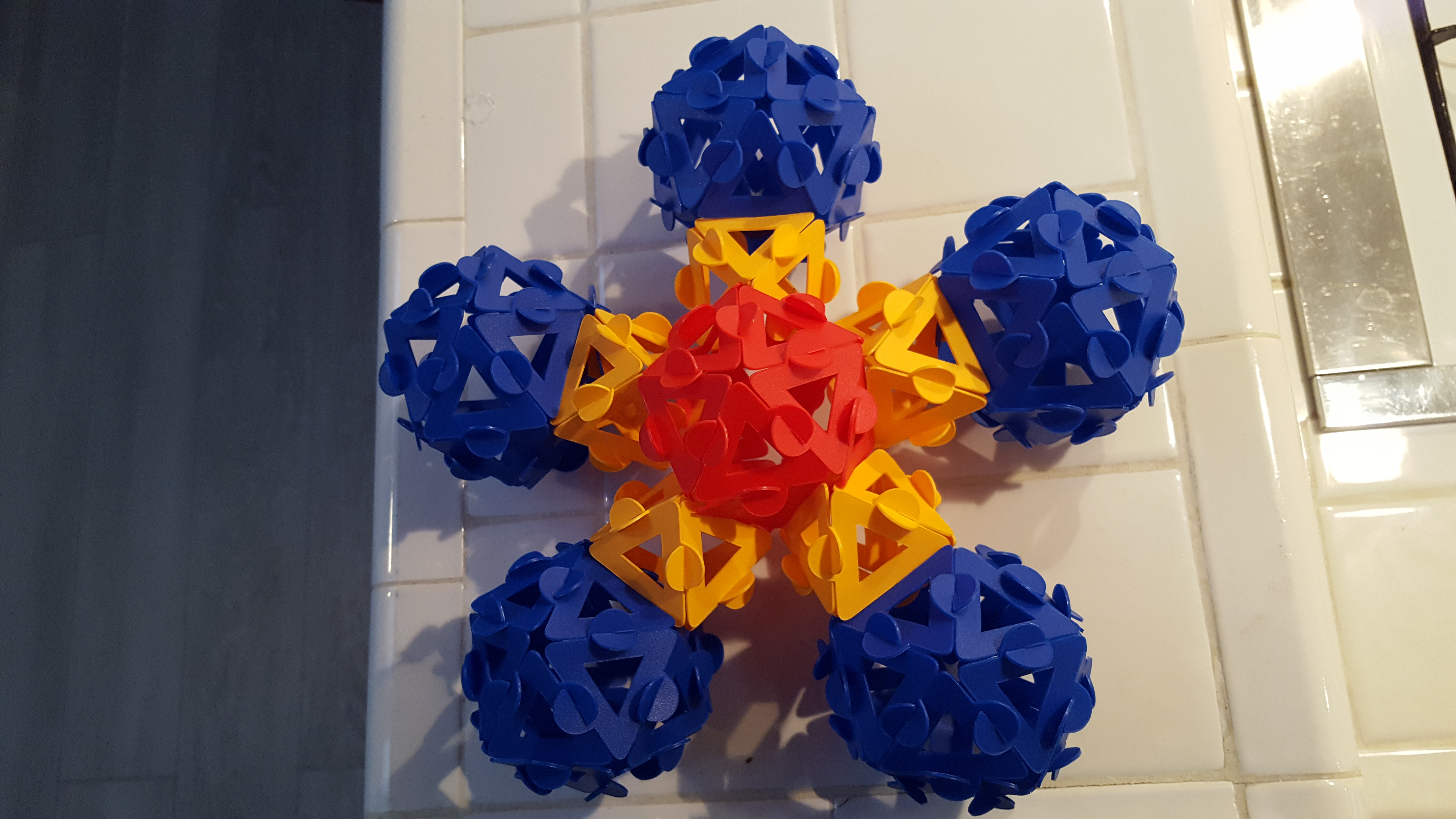 So Itsphun seemed like a promising material for this construction. As before, I started with one of the pentagonal faces of the eventulal dodecahedron; only this time, since it was sufficiently easy to take faces out as well as put them in, I just made the structure with complete icosahedra at what would become the vertices, and then removed the proper faces and plugged in pre-made octahedral connectors.
