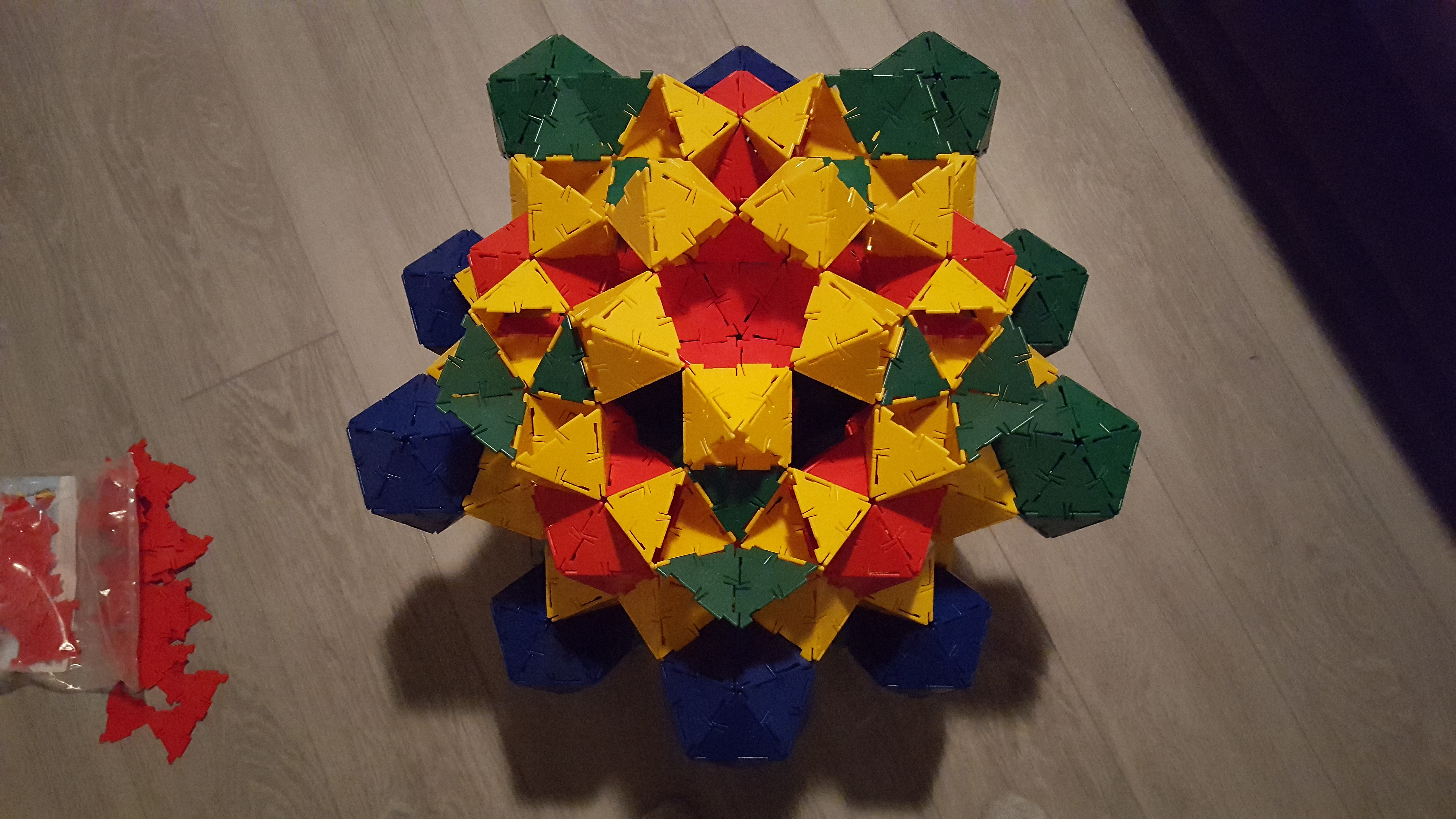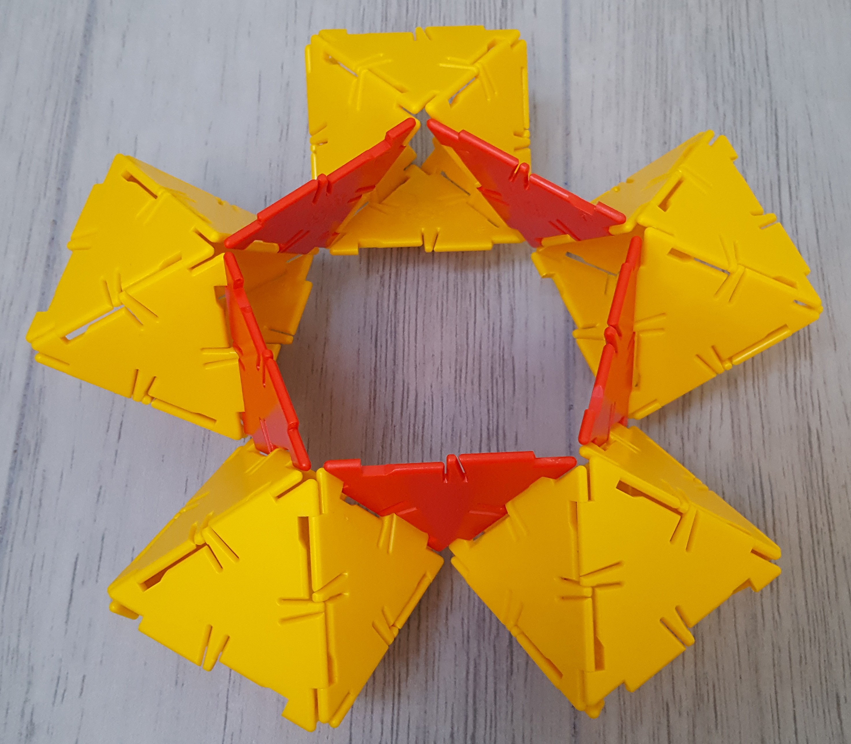 The next step was to assemble some of the pentagonal faces of the excavated dodecahedron. Since with the Polydrons you can’t reach inside of structures once they’re built, it seemed like it might be best to make these rings of octahedra connected by triangles — the red triangles would eventually become part of the face-central icosahedra. Checking back on the statistics, we’d need 12 of those.
