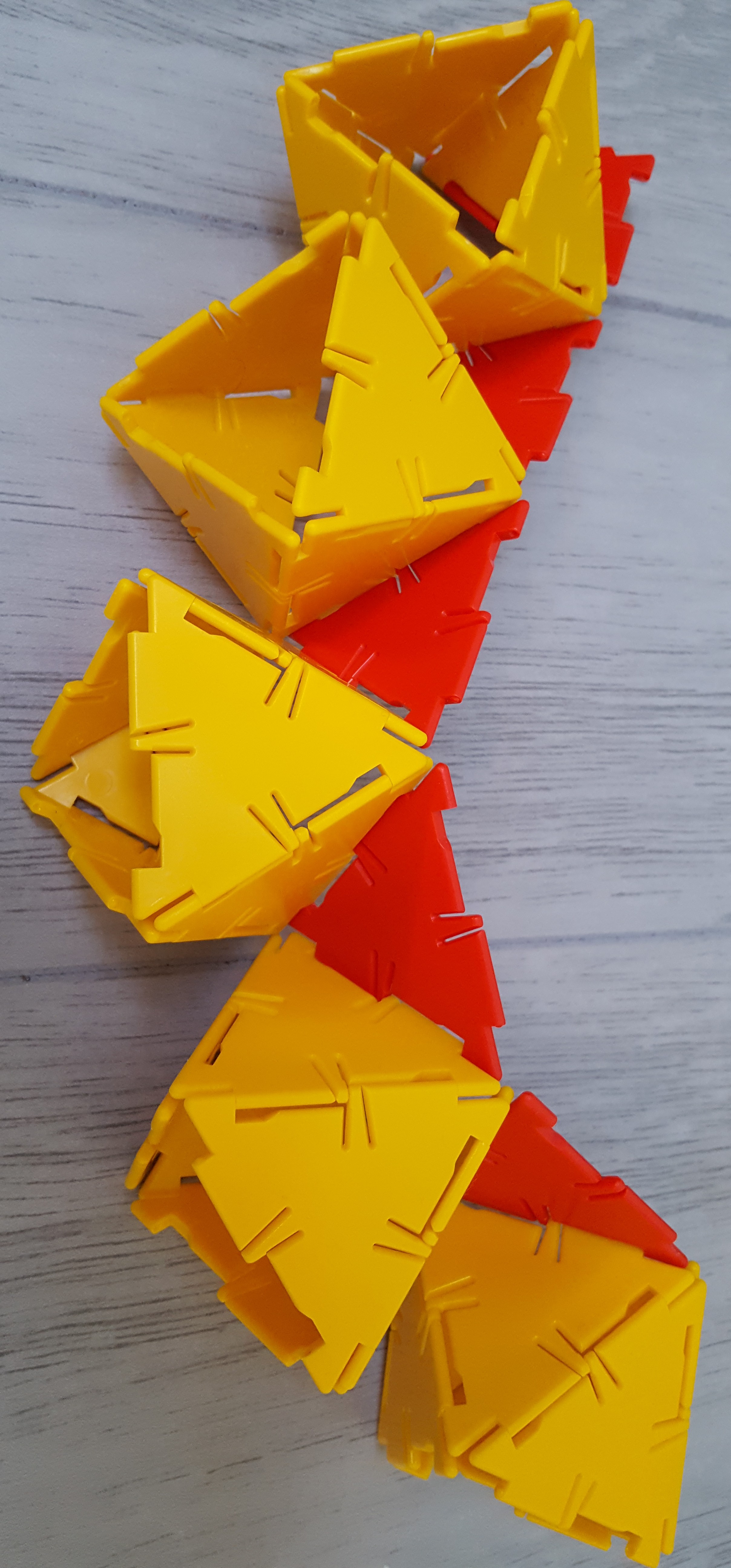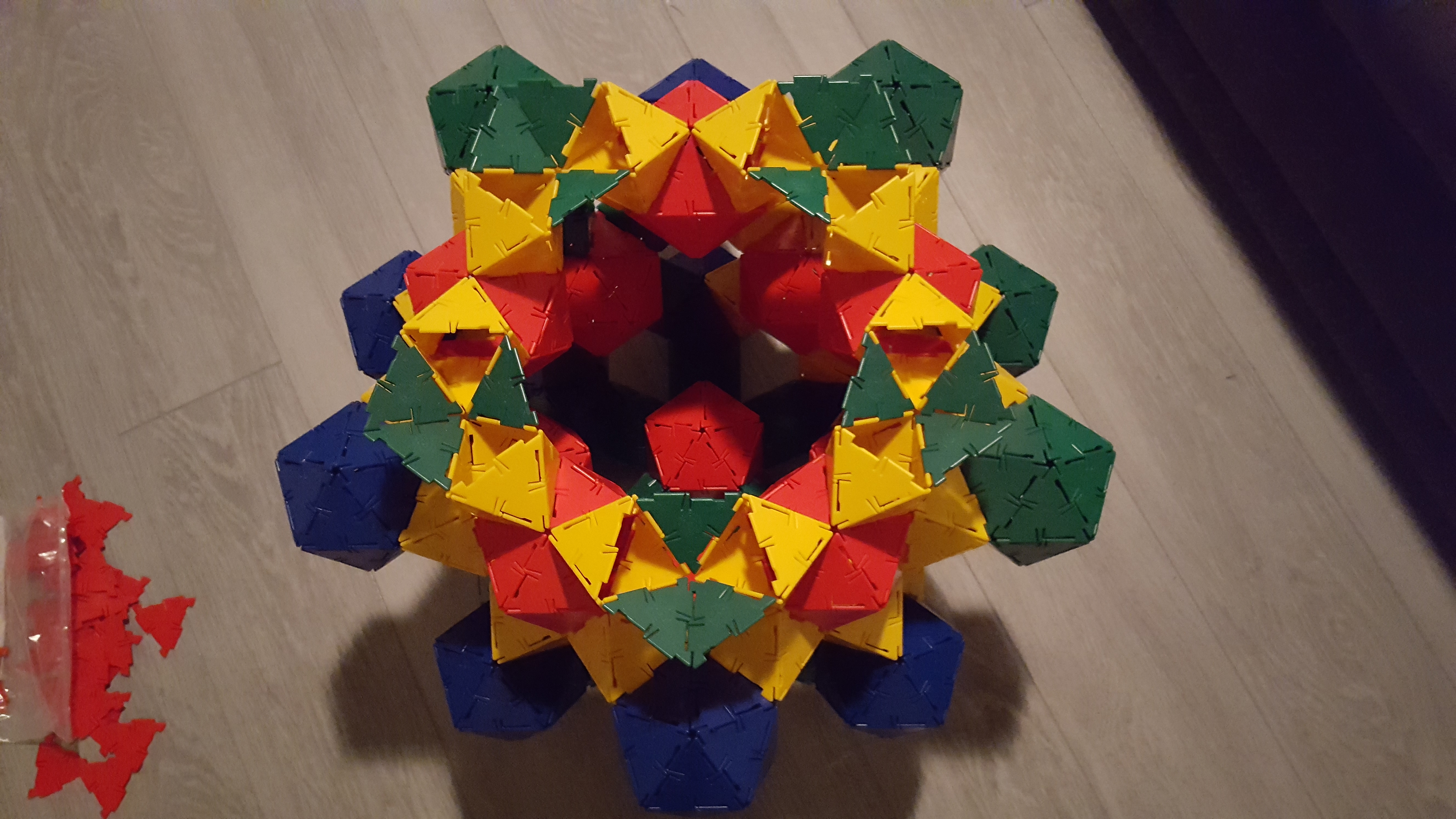 The next step was to assemble some of the pentagonal faces of the excavated dodecahedron. Since with the Polydrons you can’t reach inside of structures once they’re built, it seemed like it might be best to make these rings of octahedra connected by triangles — the red triangles would eventually become part of the face-central icosahedra. Checking back on the statistics, we’d need 12 of those.
