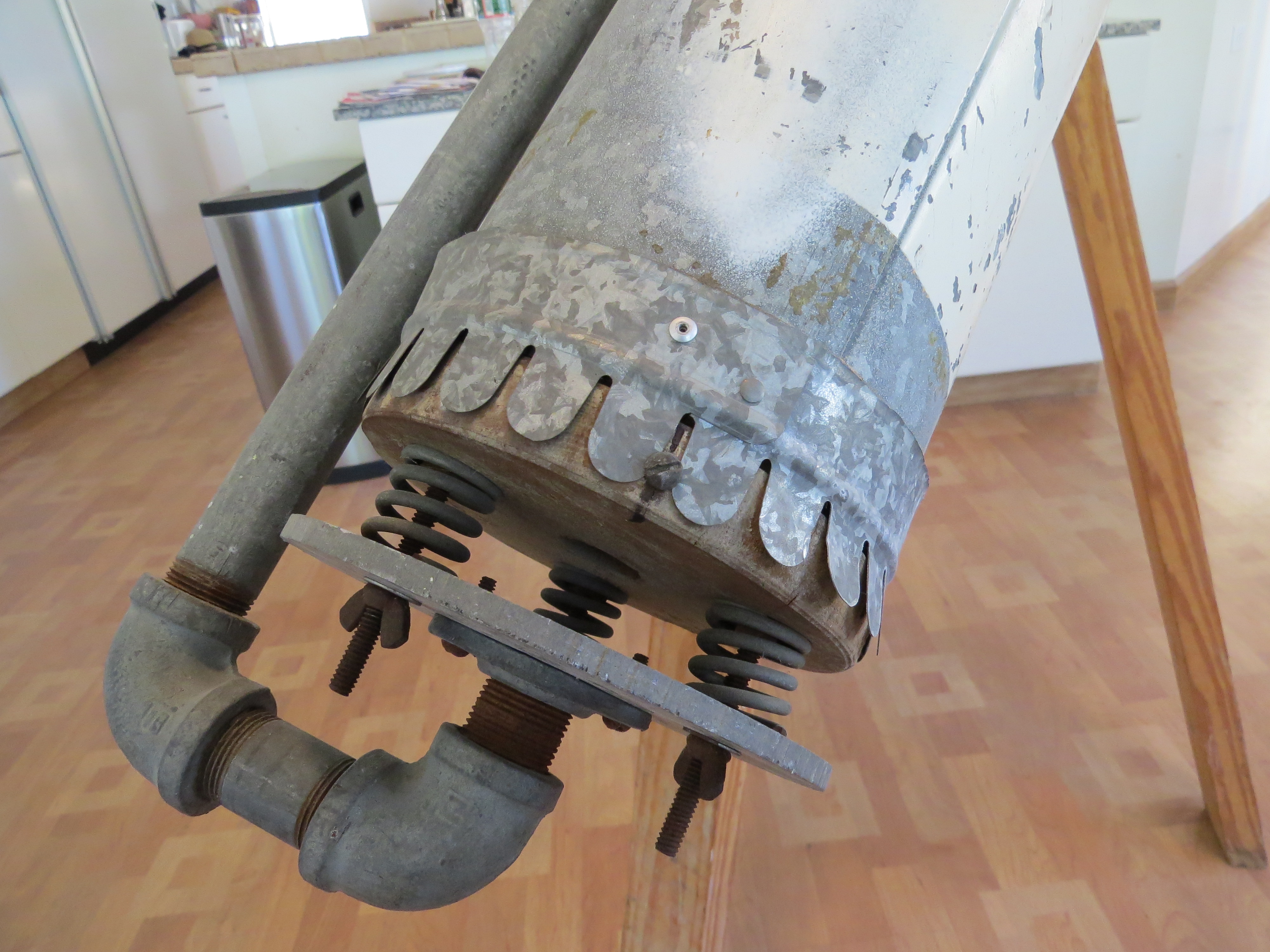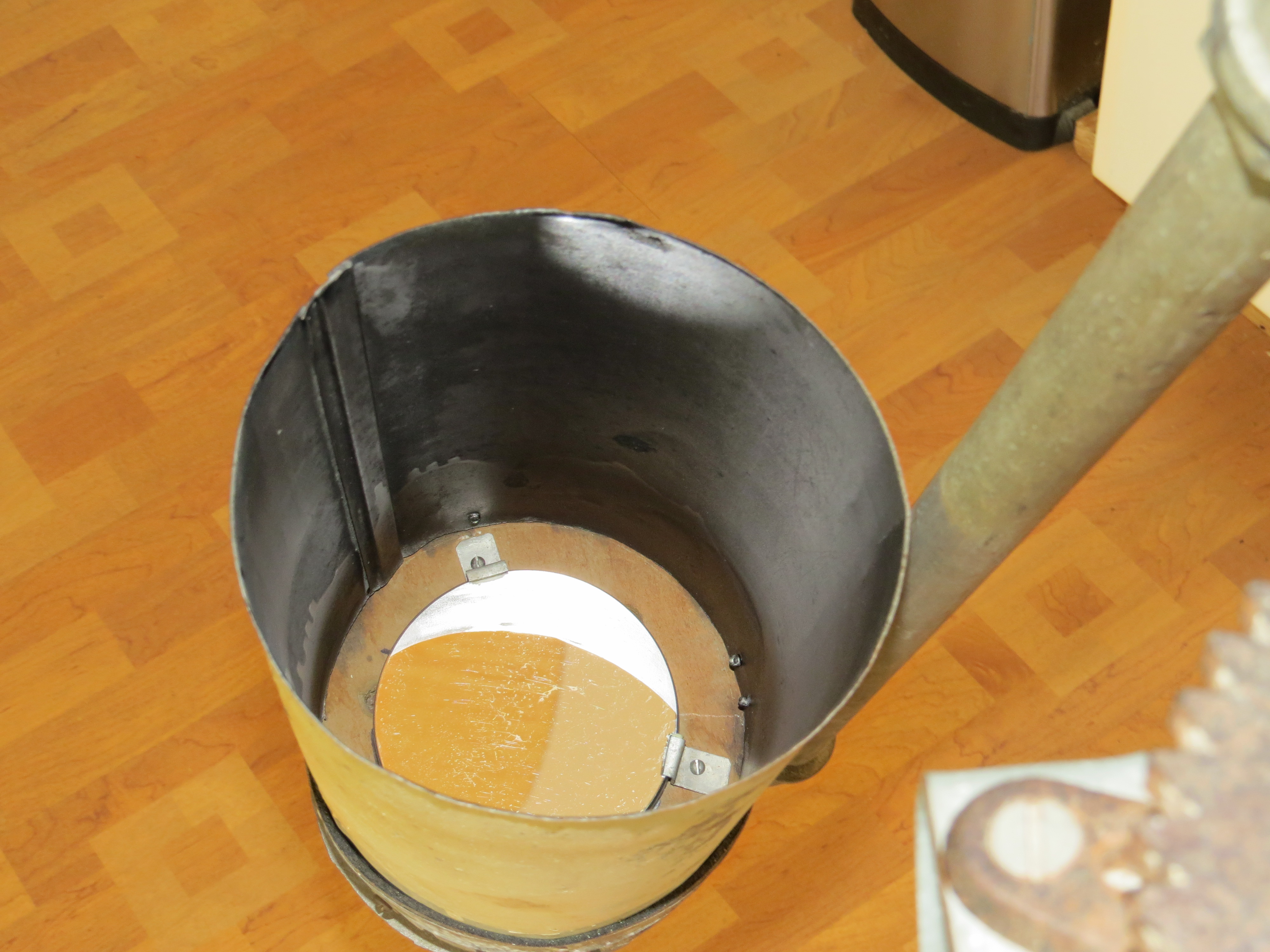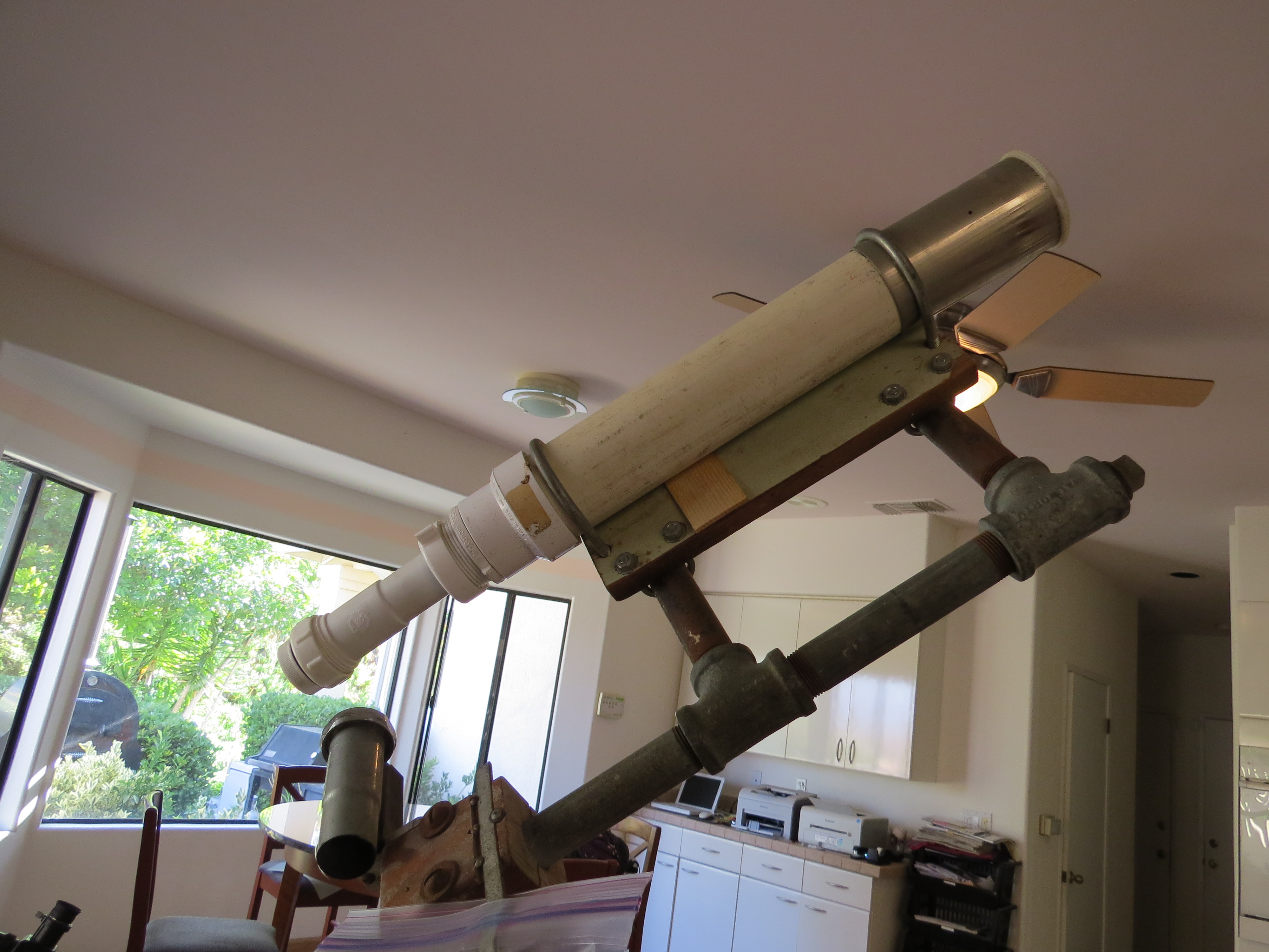 The main mirror base includes scrap wood from 7th grade shop class, three automotive valve springs, and a piece of duraluminum he scrounged from the father of a friend, who worked in a machine shop at Grumman Aerospace. An old stove pipe shields the mirror from ambient light and protects it from dust.