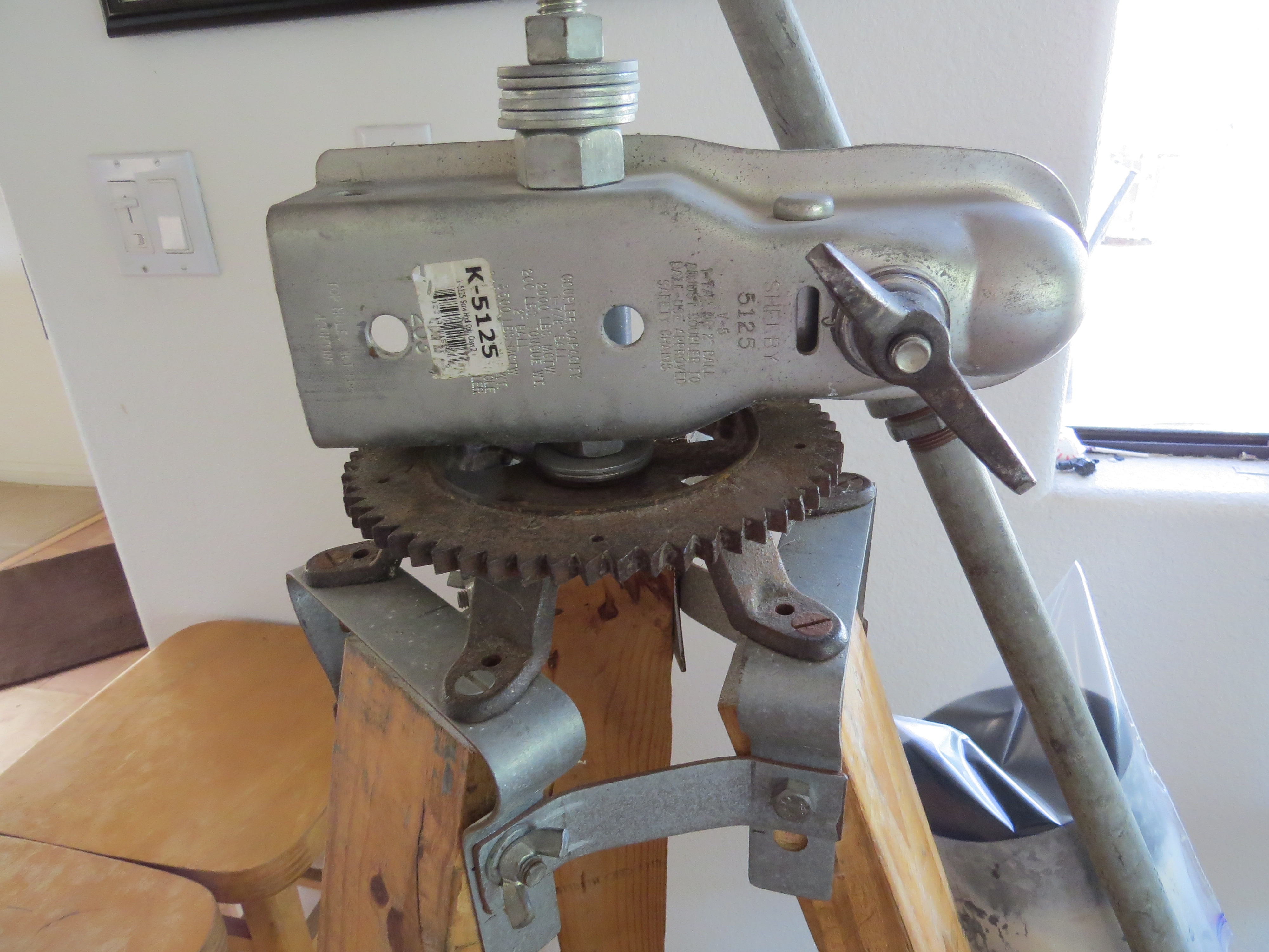 Connecting the tripod to the supporting frame is a ball and trailer hitch with a big wingnut to adjust the tension. David couldn’t find this unusual trailer hitch anywhere he looked in Houston, where he was living at the time, so he ordered one. Ironically, it arrived with a packing slip from a warehouse in Houston. You never know where your parts might come from.