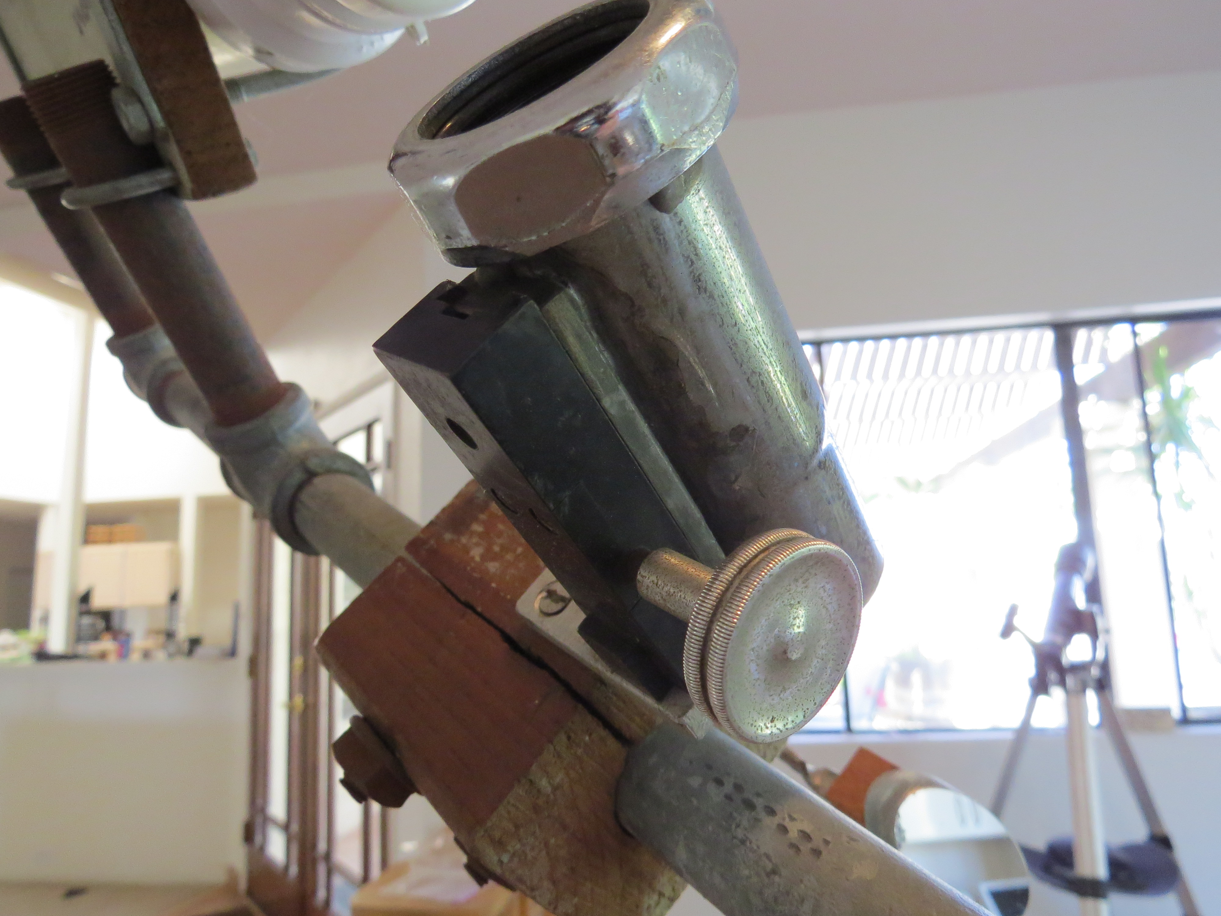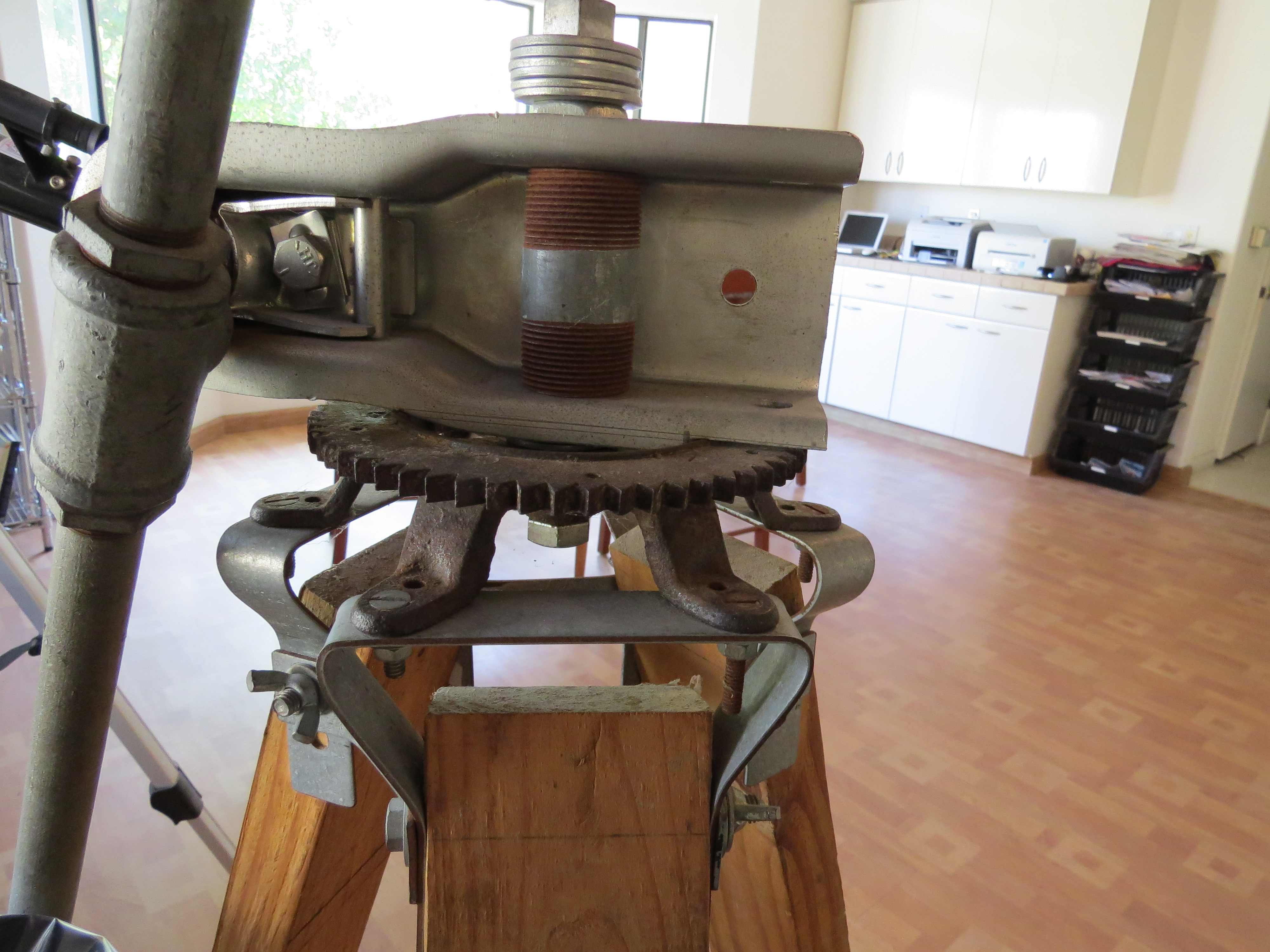 The main supporting frame is iron pipe and fittings. A heavy tripod made from 2×4 lumber, metal brackets, and an old gear from a farm tractor form a steady base for the telescope. It is important to avoid vibration when using the telescope, especially when using higher power eye pieces. Otherwise you can easily lose the object you are trying to view.