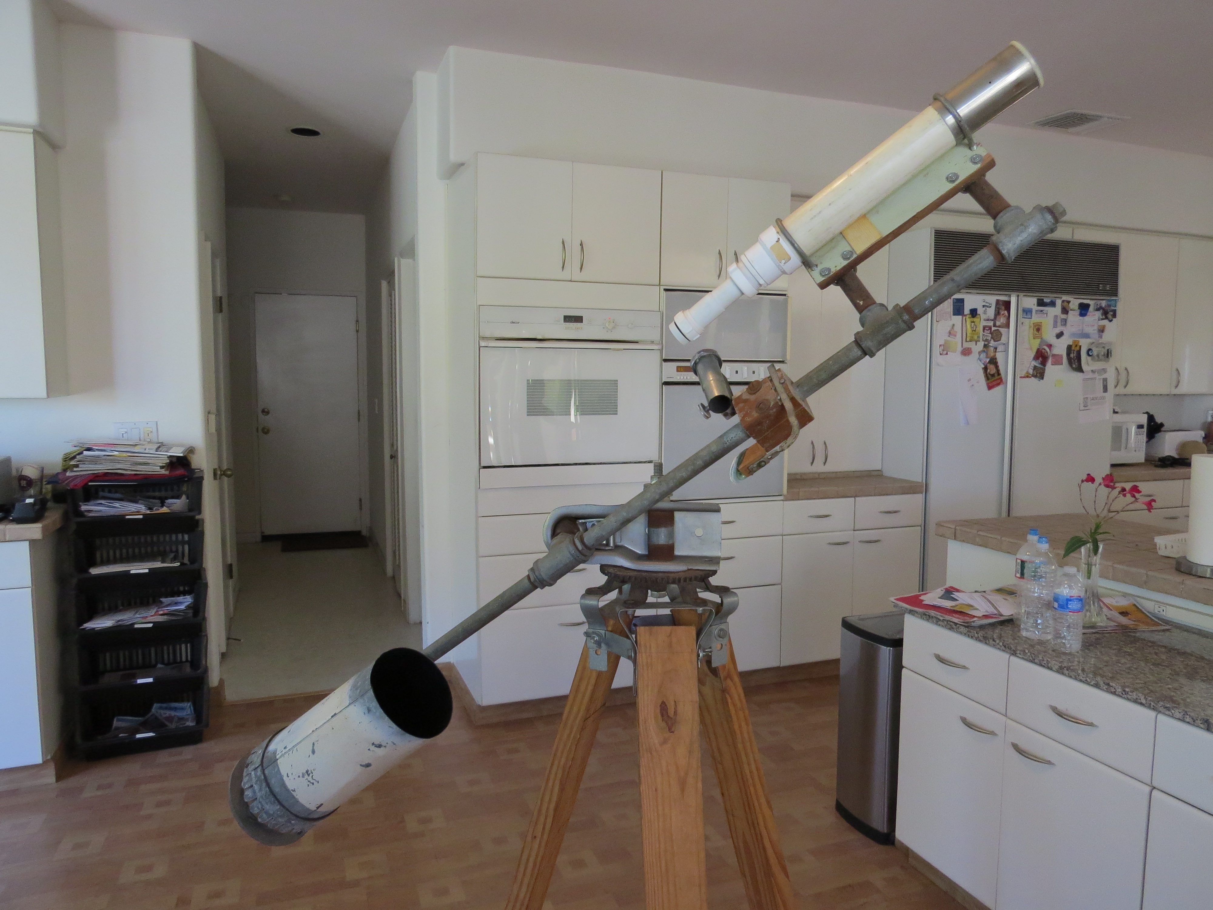 The spotting scope is used to align the telescope for viewing. David’s uses a lens from an old projector. The tube used to be made from cardboard before he replaced it with PVC pipe.
