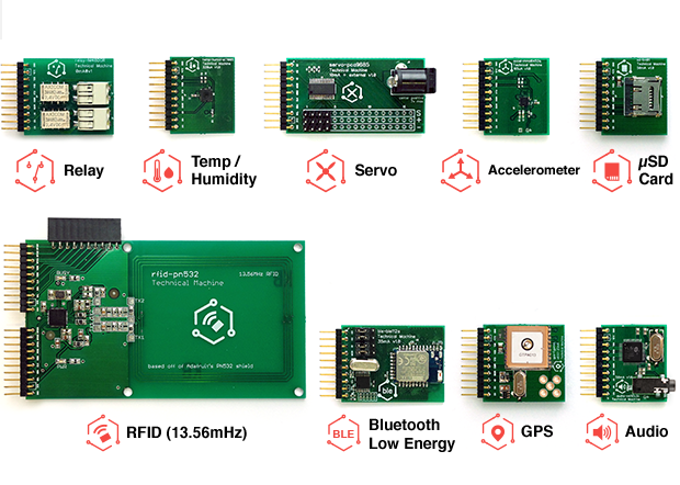 As well as standard GPIO bank at one end—which includes SPI, I2C, and UART capability as well as 6 General Purpose Input/Output pins, 6 Analog to Digital Converters, a 5V pin, a 3.3V pin, and a ground pin—the board supports a module system, making it easier to add capabilities to a project without soldering. There are two types of module, both have the same connector. Class A modules—a Relay, Temp/Humidity, Servo, Accelerometer and micro-SD Card board—and slightly more expensive Class B modules—RFID, Bluetooth LE, GPS and Audio boards.