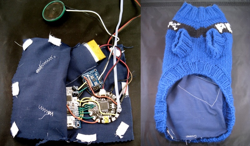 Doctor Who fans and dog fans will surely love Adafuit’s Flora-powered TARDIS costume for dogs. With a knit TARDIS sweater for toy dogs purchased on Etsy, a Flora wearable processor and a VS1053 MP3 music player module which plays the sound (found on this site) of the TARDIS from Doctor Who are added in. The project lays flat to make it wearable. A Flora NeoPixel is used for the blinking blue light on the top, and an infrared receiver is added for the ability to mute the sound when wanted, or switch between different audio tracks if set up with more coding.