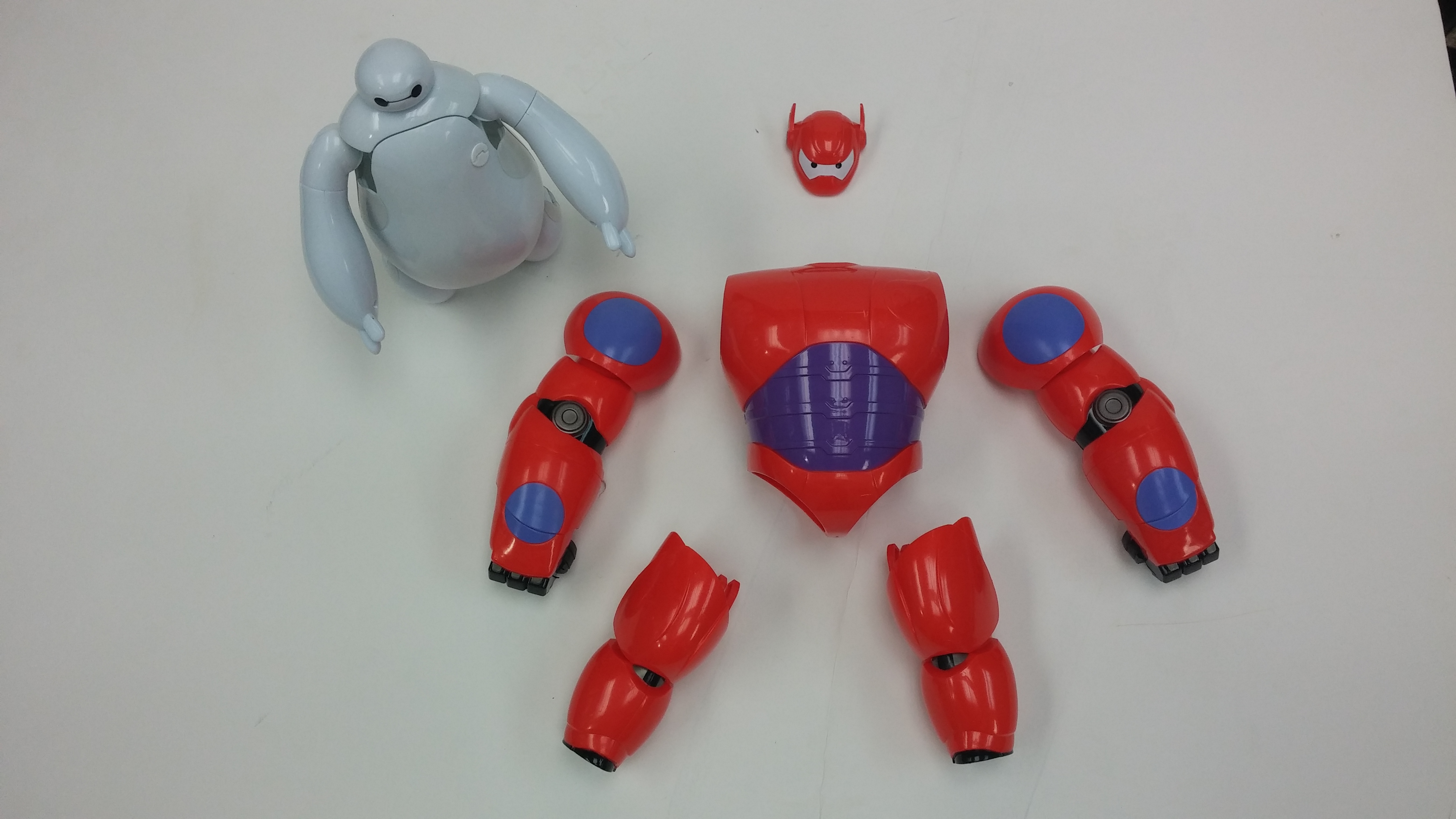 Undeterred, I started looking at different Baymax toys to try to find the most hackable one. I settled on the Baymax “Armor-Up” action figure, which comes as Baymax in his healthcare-mode white, and 20 beautiful red and purple armor pieces. The armor snaps in place to convert Baymax to his big, bad, crime-fighting mode. Essentially, you get a whole extra Baymax worth of snap-on armor, even a new head with the face inside.