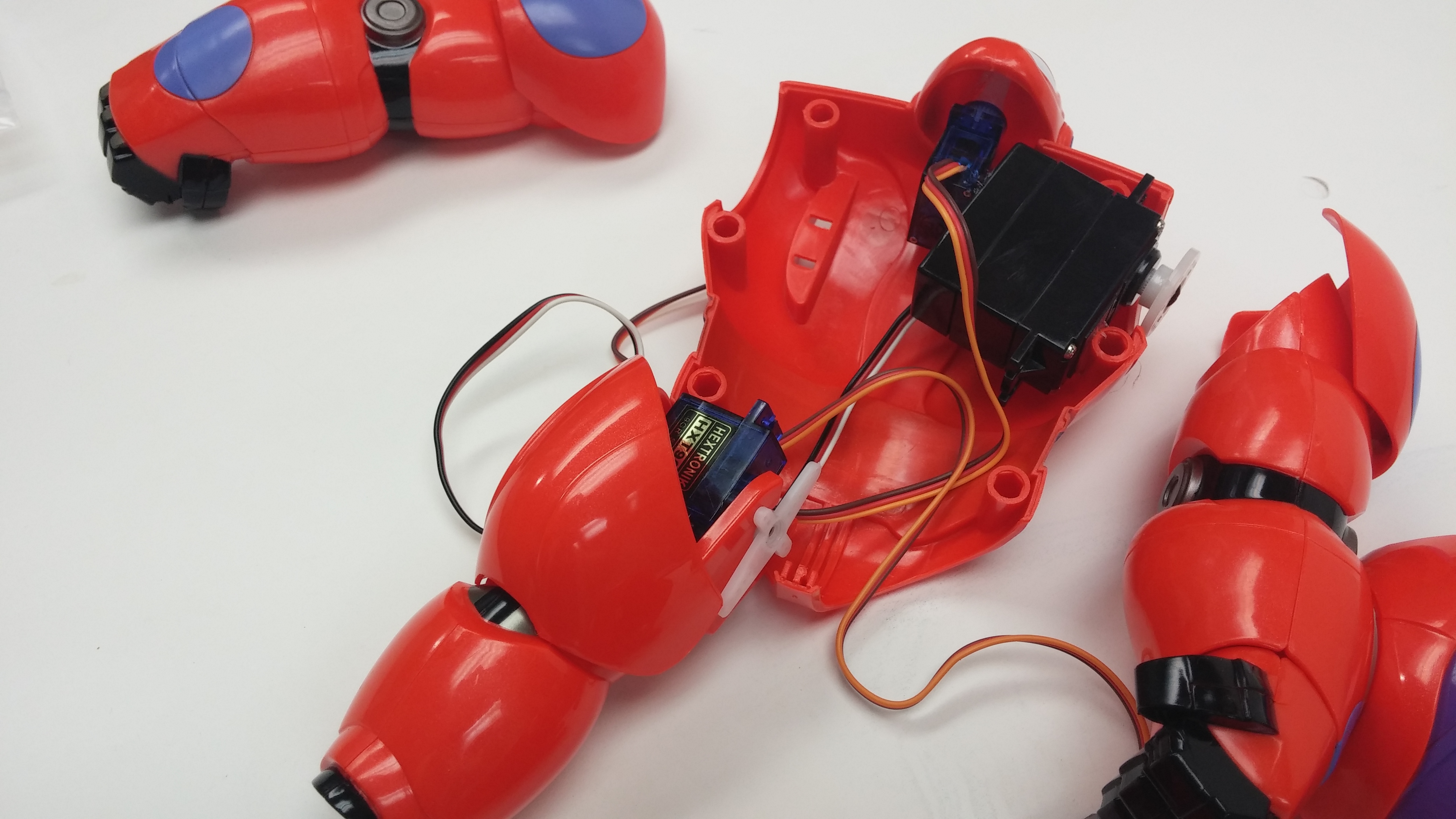With a little imagination and some hot glue, it is easy to see how servos could be fit inside to actuate the armor. Without the white Baymax inside, the armor shell is capacious. The pictures below give an idea of how the servos might fit to control the head, arms, and legs. I haven’t tried it yet, but I plan to. However, I’d be happy to see someone beat me to it. I just want to see this hack done well!