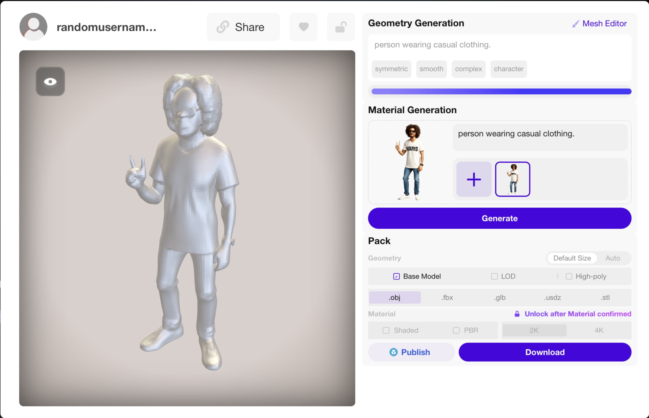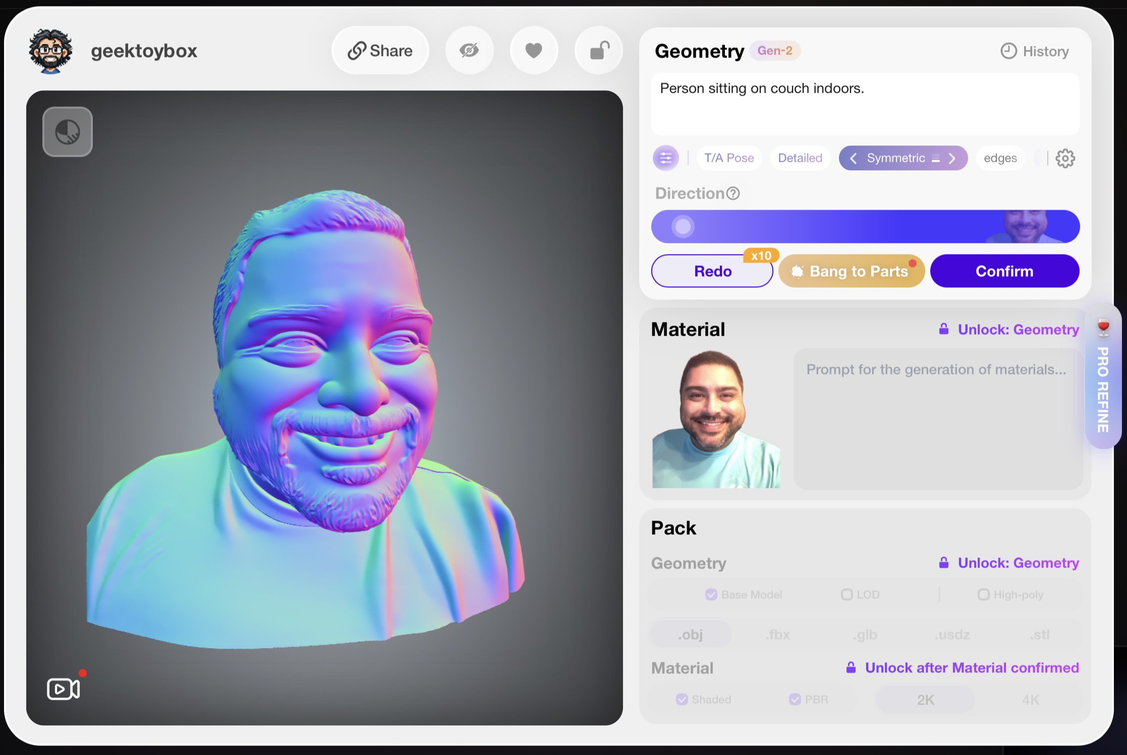 Other than the extra arm, I can see where the generated image influenced the odd effects of the 3D model. Hitting Redo a couple times didn’t seem to help. It’s a great starting point if you wanted to import these models and clean them up in a modeling software like Blender or Nomad Sculpt if you don’t want to use the web-based mesh editor built into the site. Unfortunately, the extra arm and weird fingers ended up in the final generated model. The photo-to-model prompt worked great aside from the choice to give me four teeth and a smooth mouth otherwise. Still a great starting point to refine.