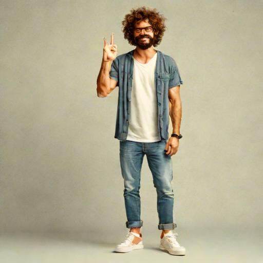 “A man with medium length, curly hair, a short beard and mustache, rounded rectangle glasses (no lenses), jeans and a V neck t-shirt. He has on hand on his hip and he’s giving a peace sign with the other. He is wearing Vans style tennis shoes.”