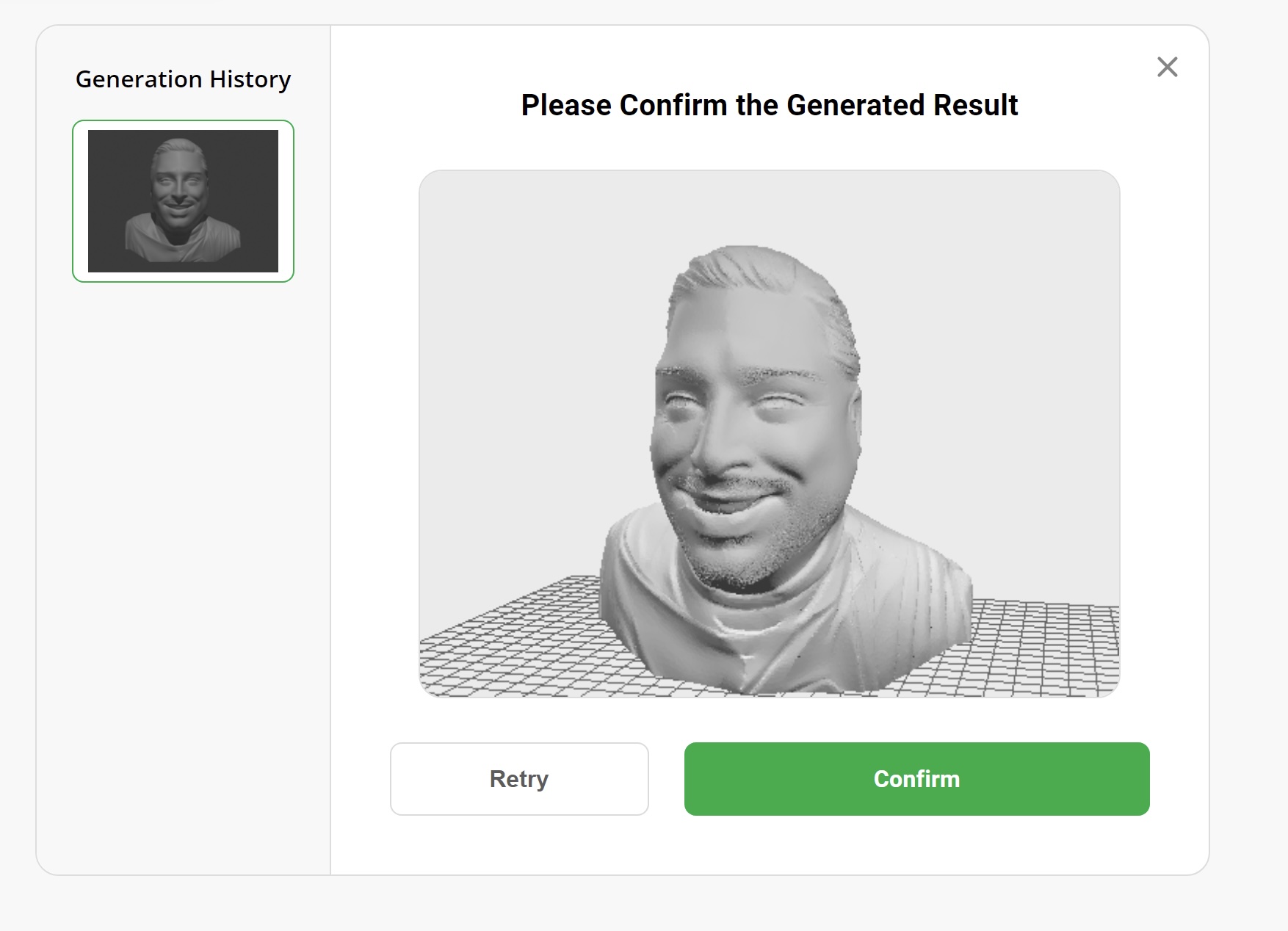 Make My Statue only allows for photograph based generation. This AI model requests photos that are roughly chest high and the subject is to be facing the camera directly. They also show you examples of photos that will and will not work with this process. Once the model is generated, you’re given the option of adding a base to it before exporting it for printing. In my test, the front of the bust shows a passing resemblance, but the back of the head gets shrunken down and the site guesses what the back of the head would look like. While impressive, the better result (in my opinion) came from Rodin in 2024.