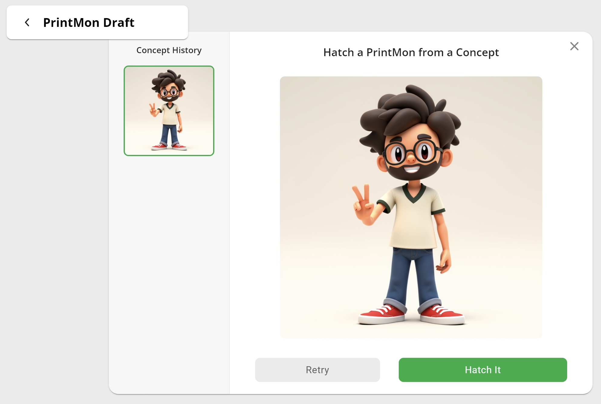 The latest version of Printmon works almost identically to last year. It’s quick and responsive. It picked up the details I asked for and again generated a cartoonish character that I’m not sure would print very well with FDM printing. It’s a bit more refined, but very similar to last year’s preview result, if not a little more mature, both in character age and level of refinement. The final step is to “Hatch It” and while I remember it working last year despite my lack of photo, this time it times out while rendering. I had the same issues with Make My Statue so I suspect something bigger is going on with their servers so I will again have to test later and share my results.