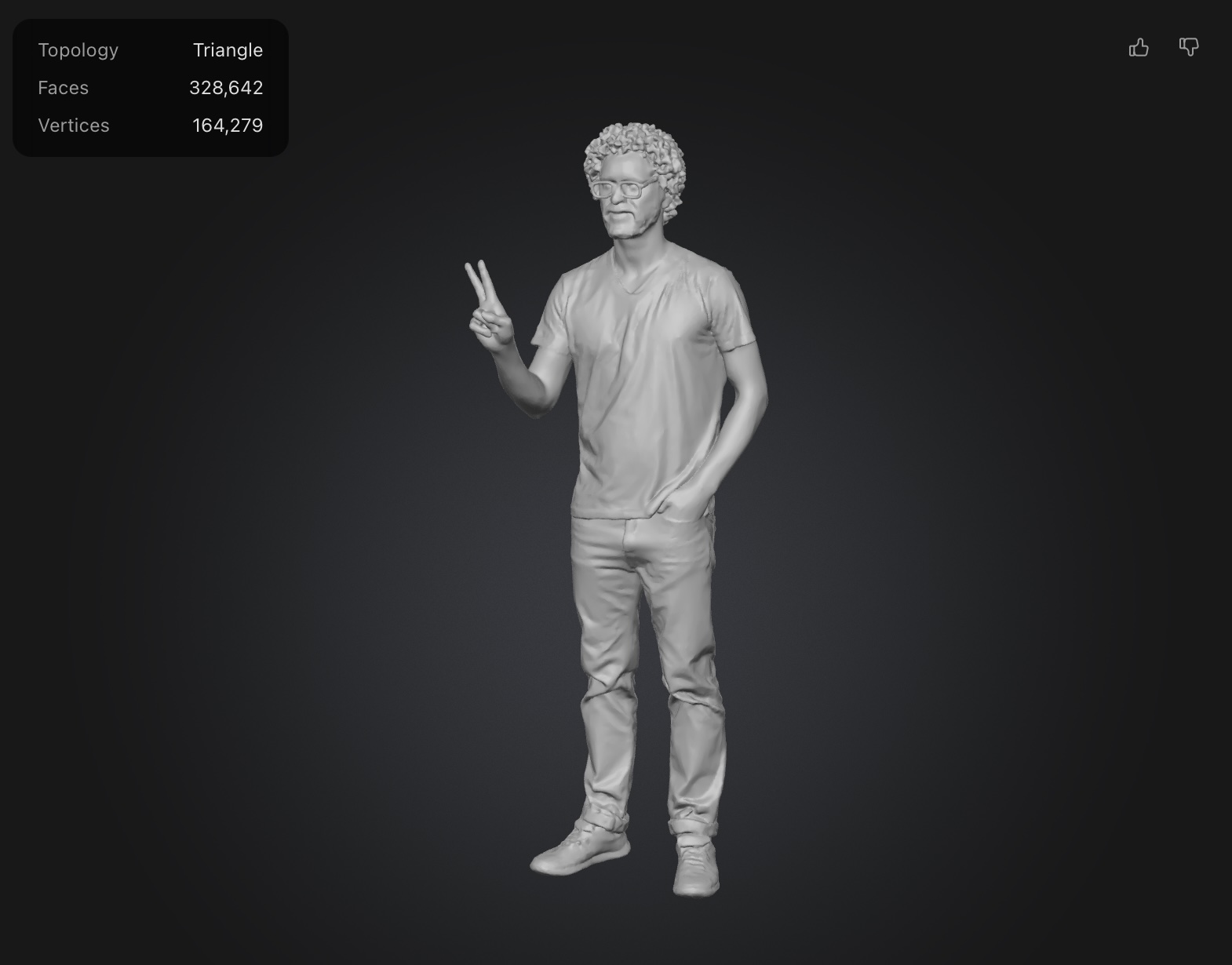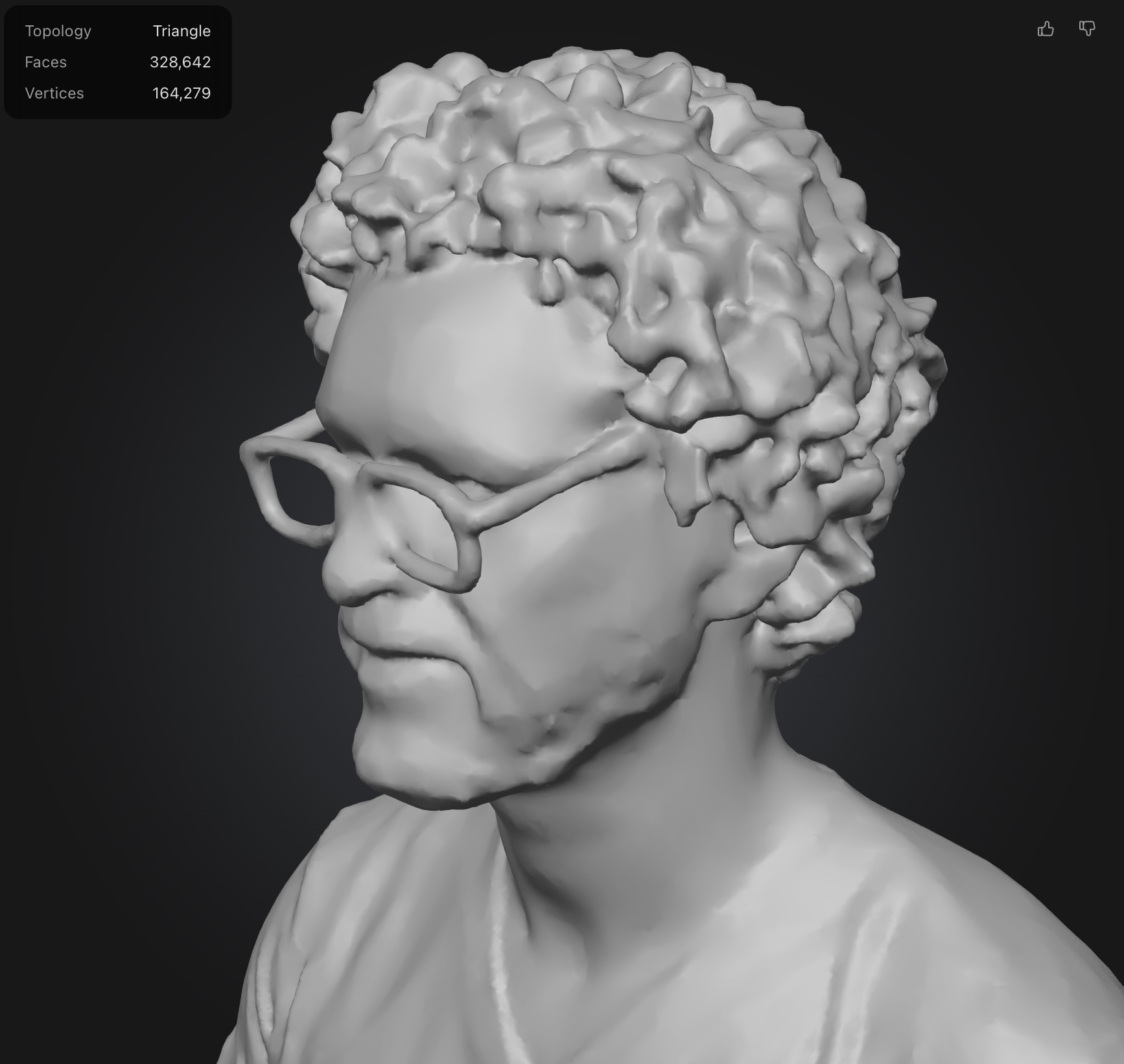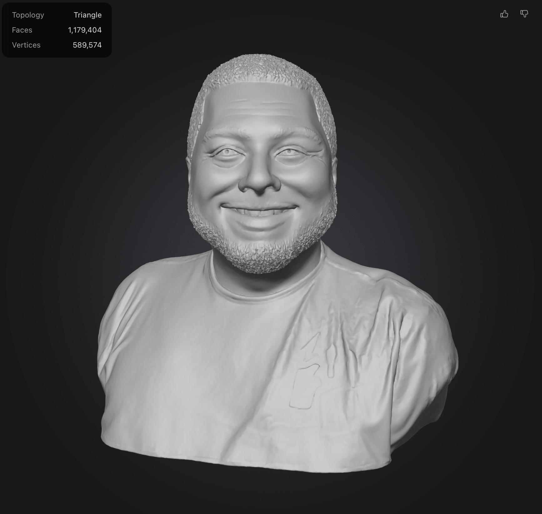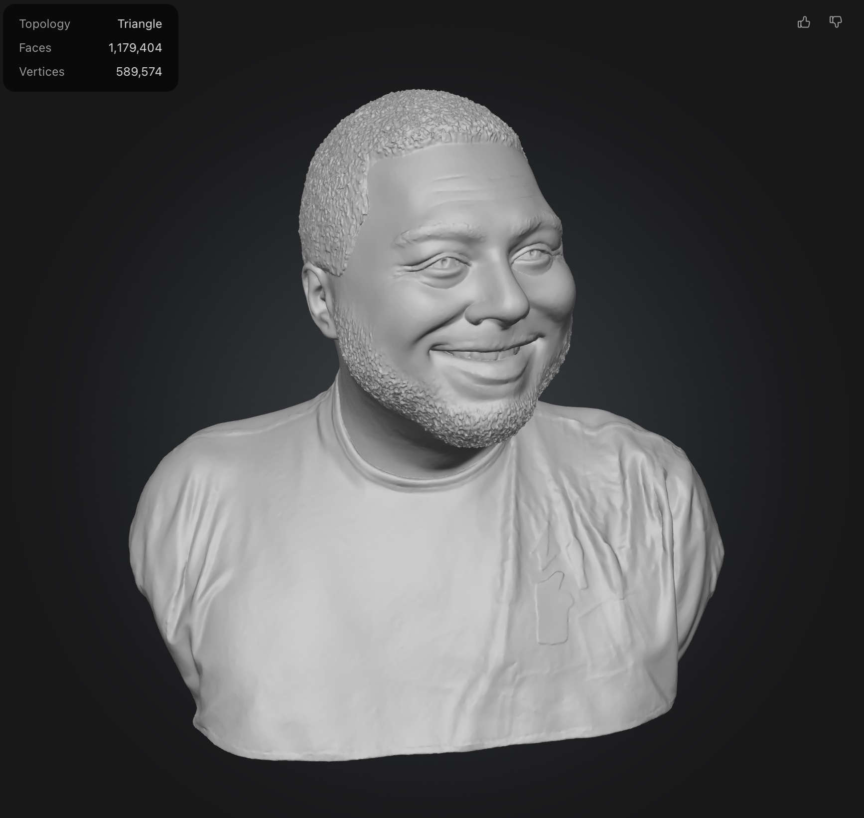 Rodin’s text results were mixed. As a free user, I was limited to the number of polygons it will use to generate the image. It added details I didn’t ask for (like a watch) and wasn’t too good at generating a hand with a peace sign. The photograph generated bust came out much better than I expected, and bared a striking resemblance to me despite polygon restrictions. You’re allowed to request regeneration a number of times before you commit to the geography and it generates the actual model file. The final file looks much smoother than the preview and definitely looks 3D printable.
