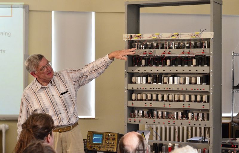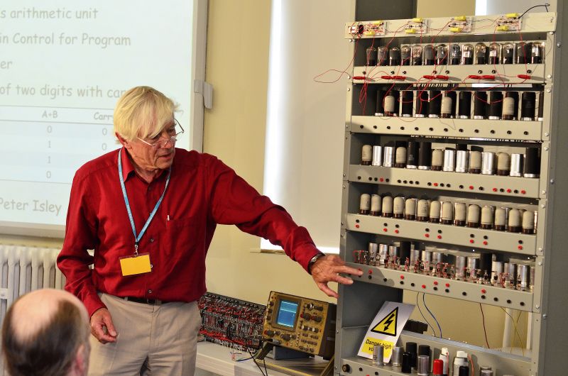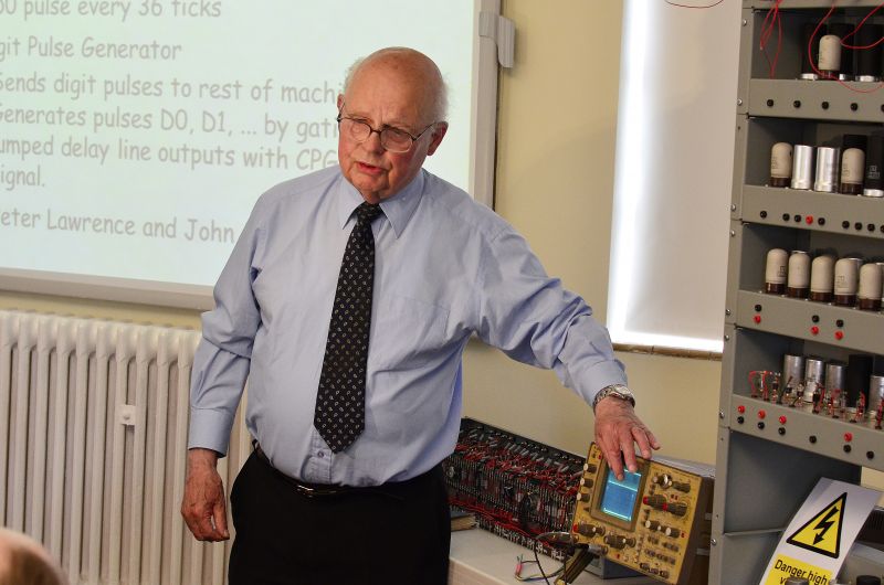 The demonstration of working components in the partially reconstructed EDSAC during Wilkes’ centenary celebration on Wednesday included; the clock pulse generator and digit pulse generator, the Half Adder, and address de-coding. Begun in 2011, the project to rebuild EDSAC is not expected to be completed until 2015.