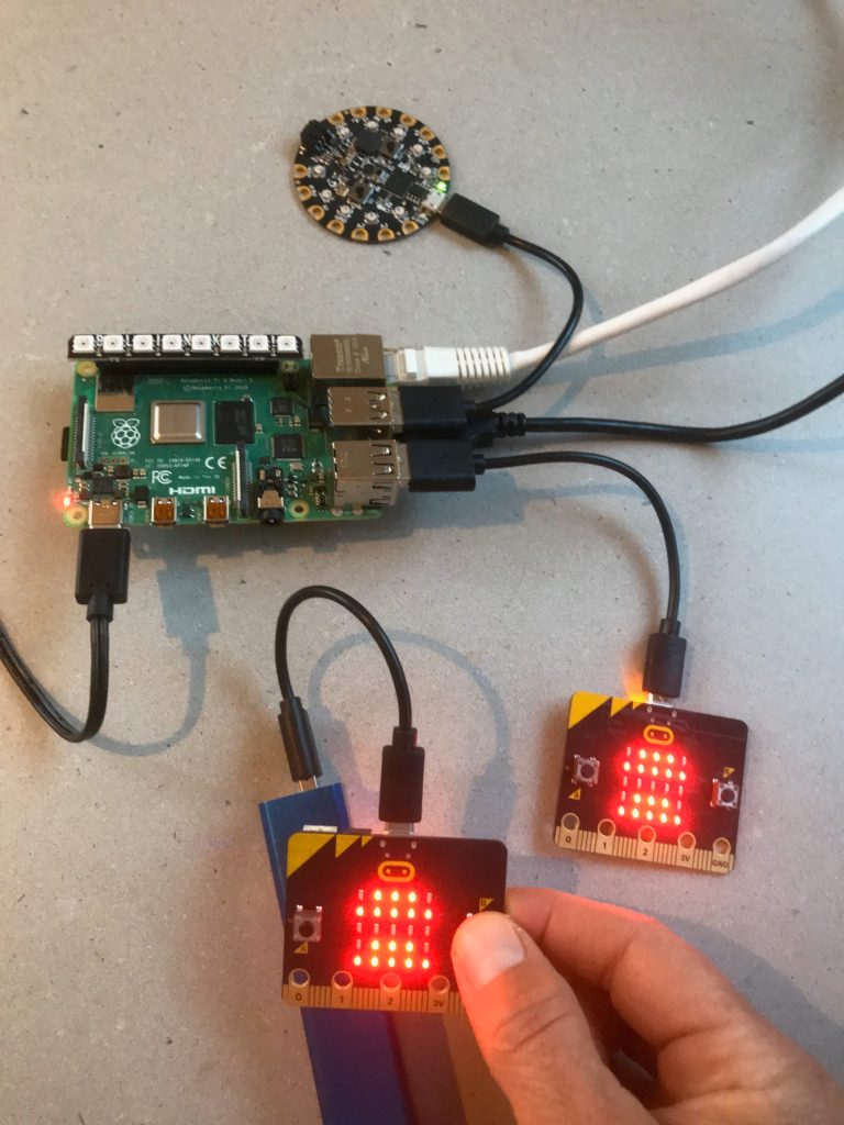 Smart Lights — This last example also takes advantage of the Radio library to turn two BBC micro:bit boards into web controllable “smart lights.” One is connected over USB to the Raspberry Pi gateway, and the other communicates with it wirelessly (using the Radio library). You can turn the light on or off using the micro:bit button, or toggle the “web light” icon on the web user interface.