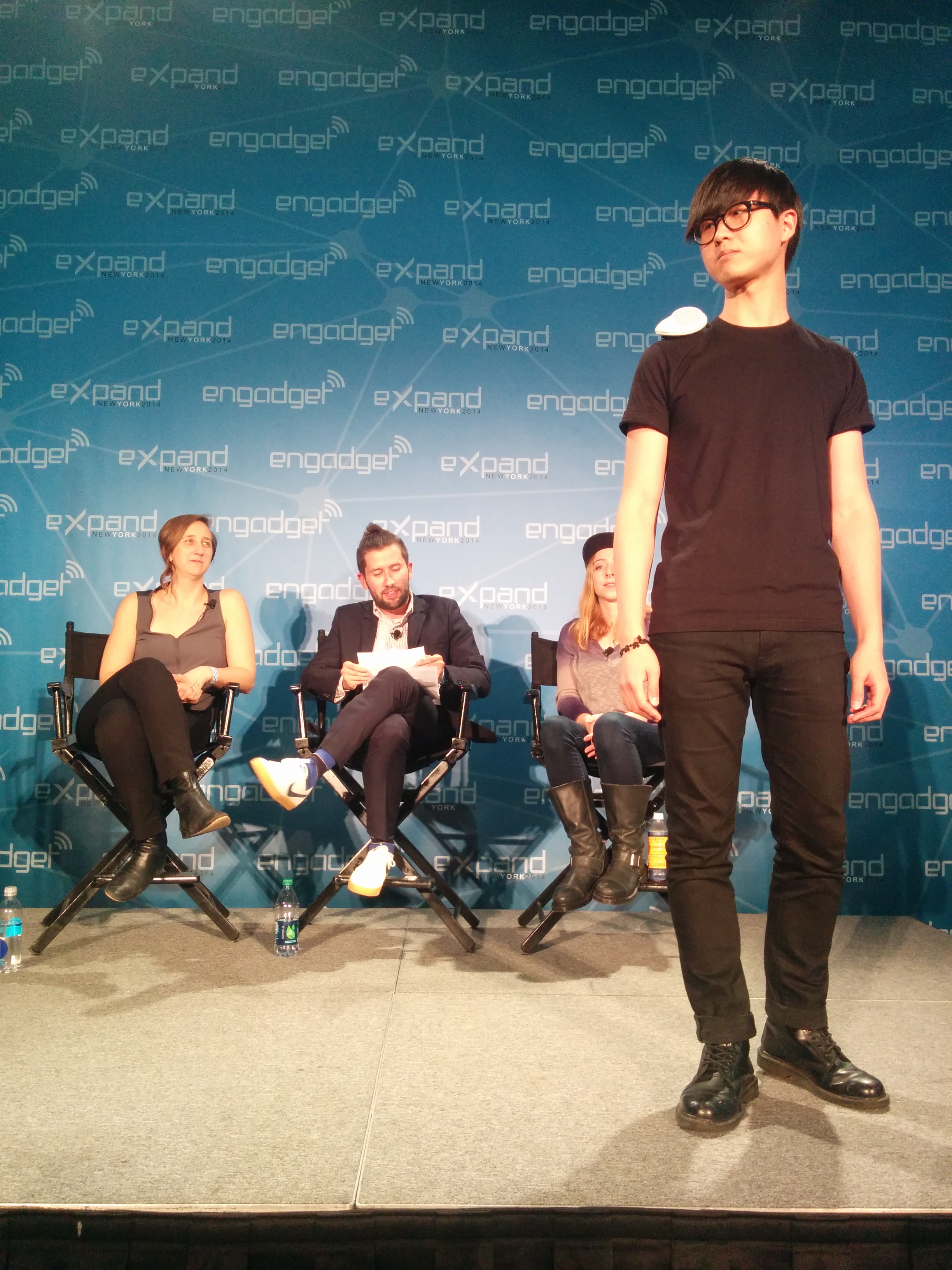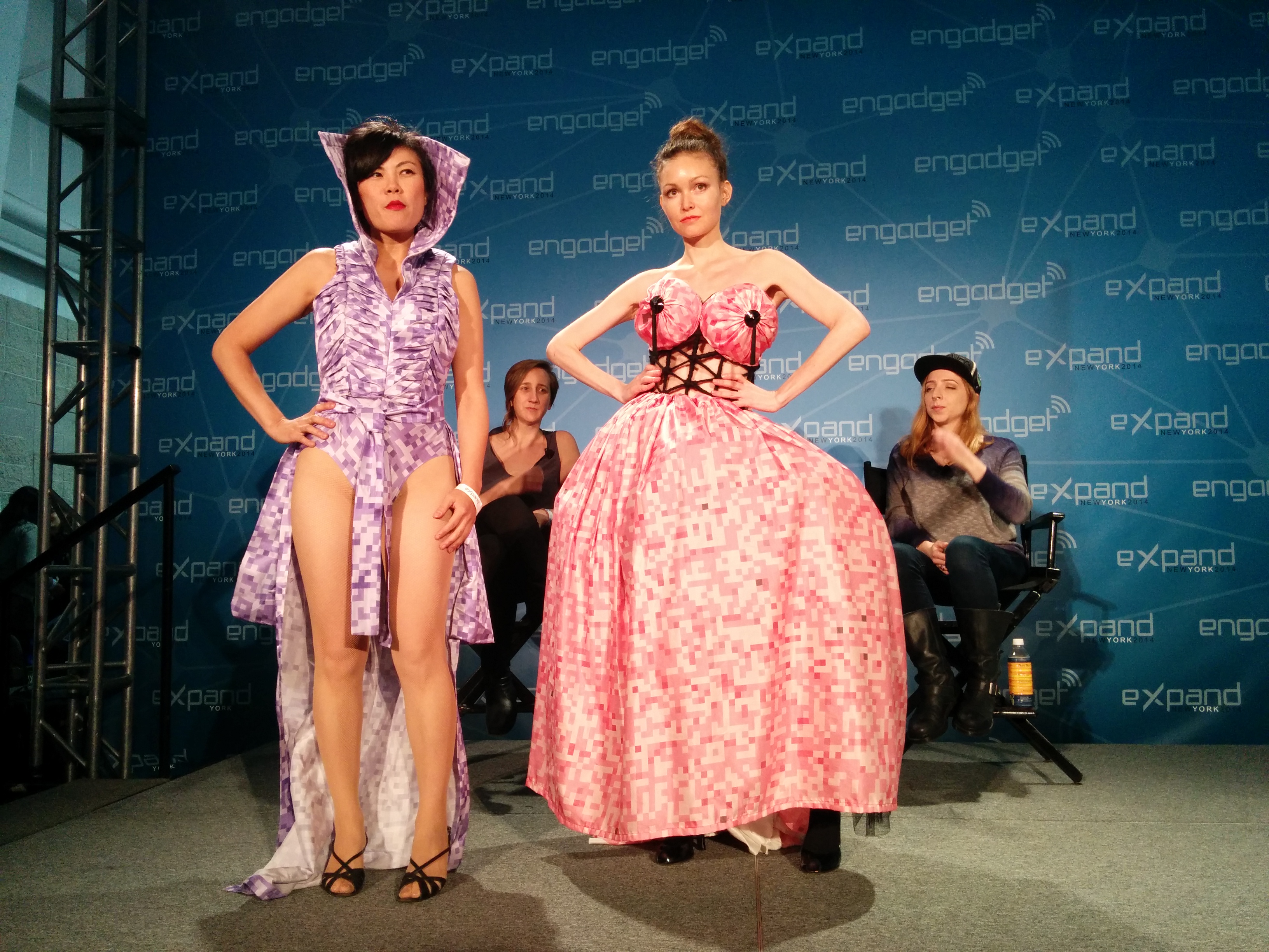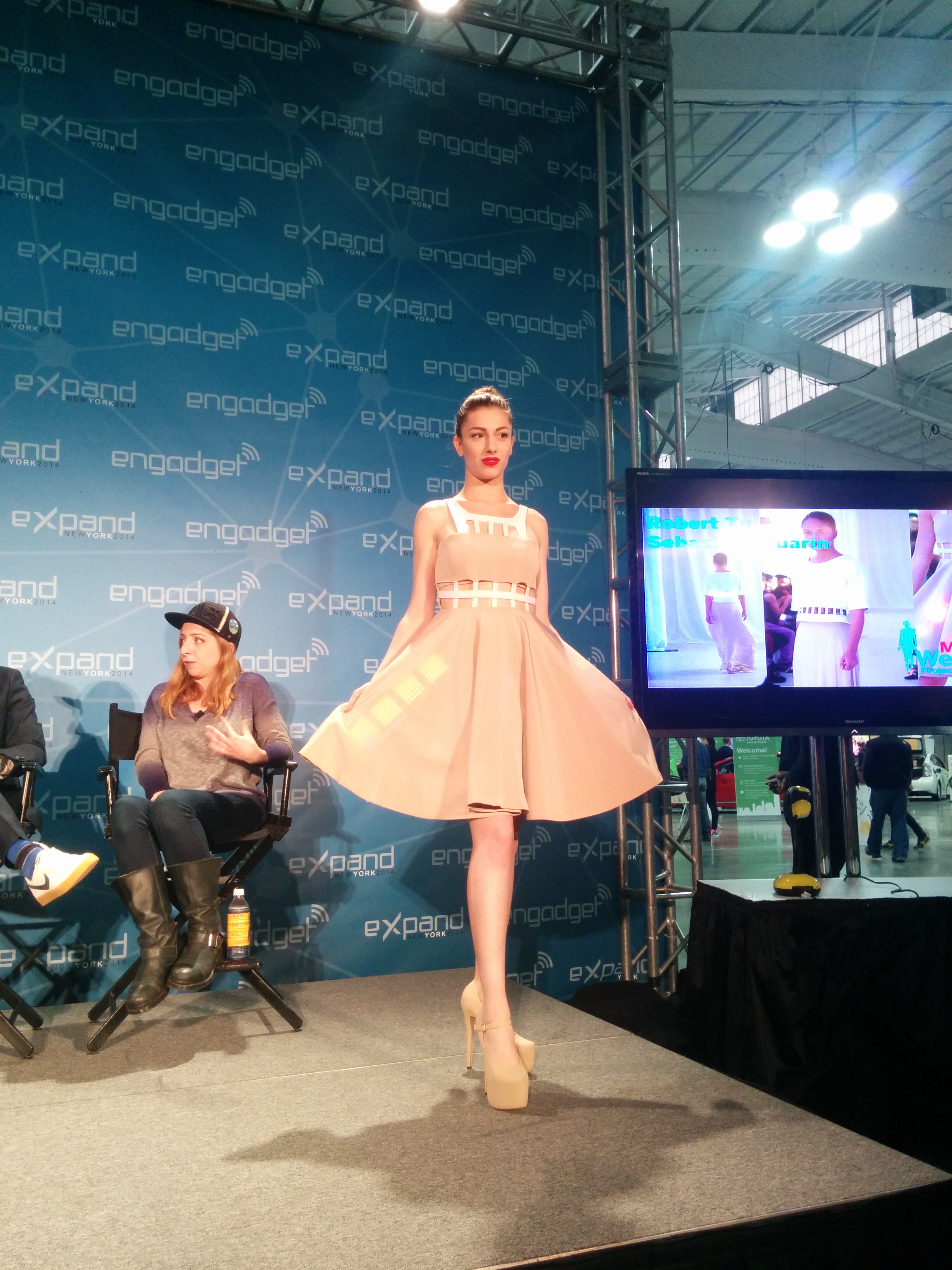 Eighteen designers descended on the Javits Center in Manhattan for Make: Wearables Projects on the Runway at Engadget Expand. The high tech and fashionable pieces they showed incorporated light, kinetics, 3D printing, data logging, data visualization, and a lot of incredible skill. With the expert guidance of OCAD’s Kate Hartman and Adafruit’s Becky Stern, Expand attendees got a small glimpse of what’s on the cutting edge of both fashion and technology. The work from these eighteen designers pushes the boundaries beyond what consumers think of when they hear the phrase “wearable technology”