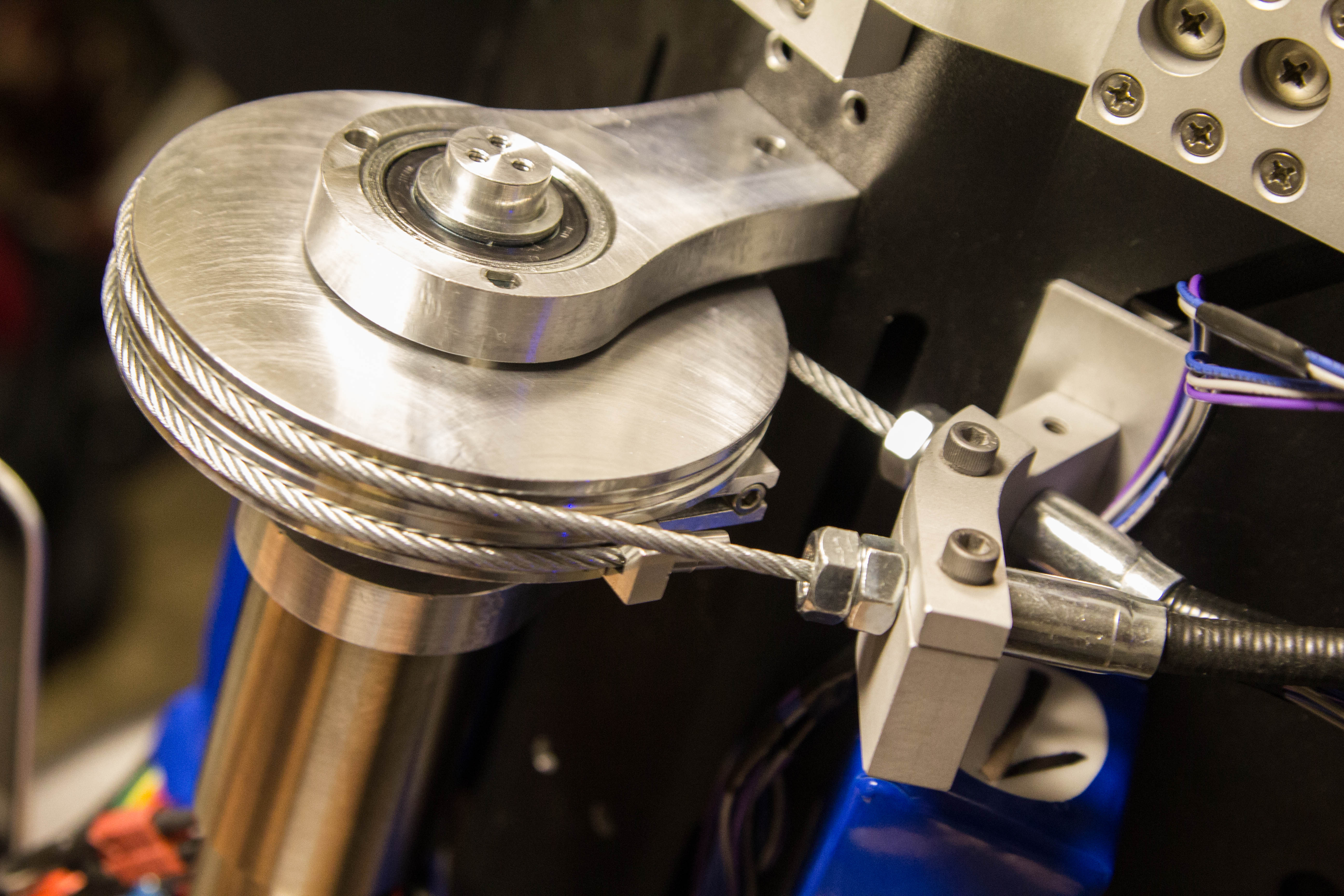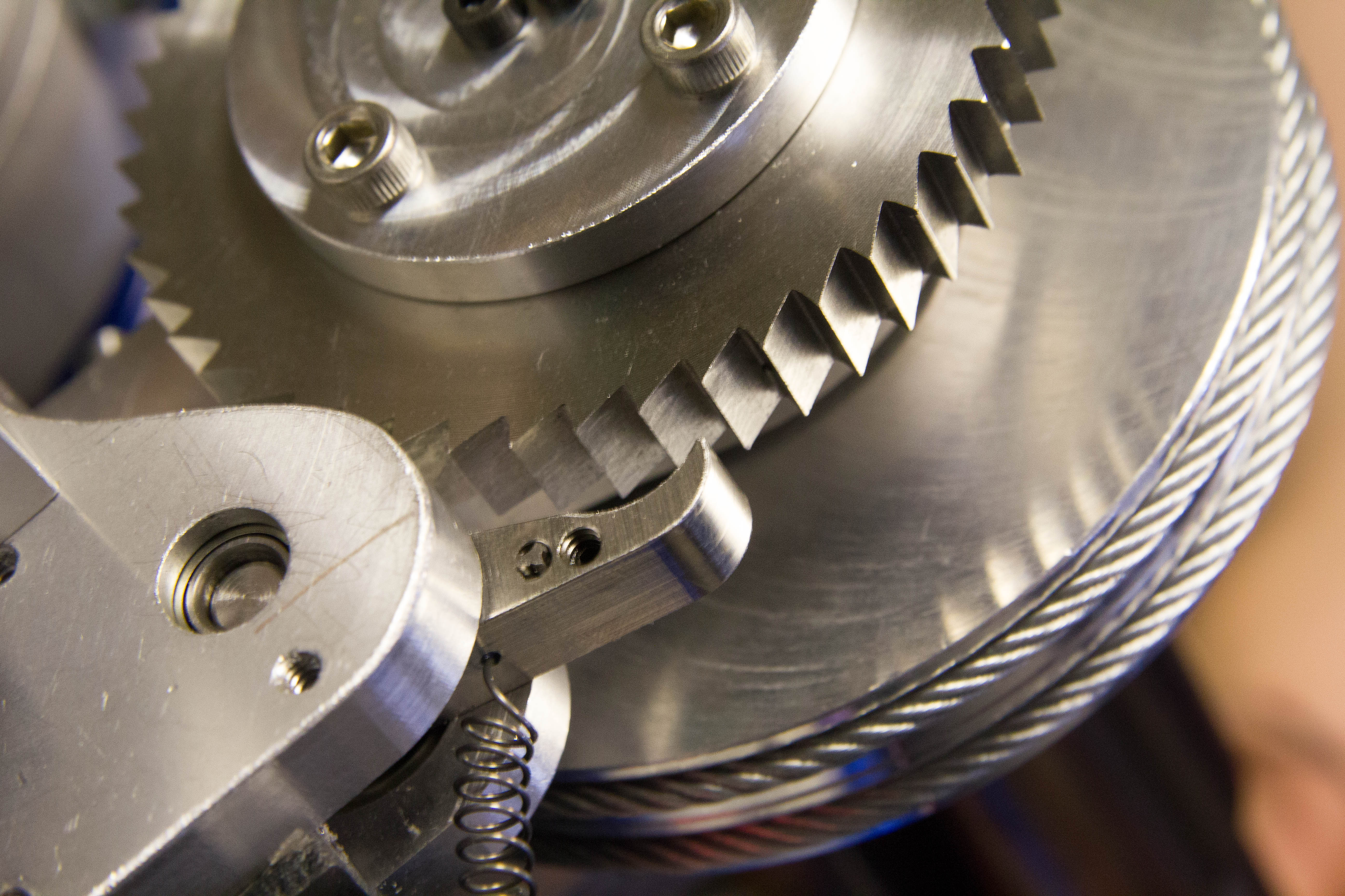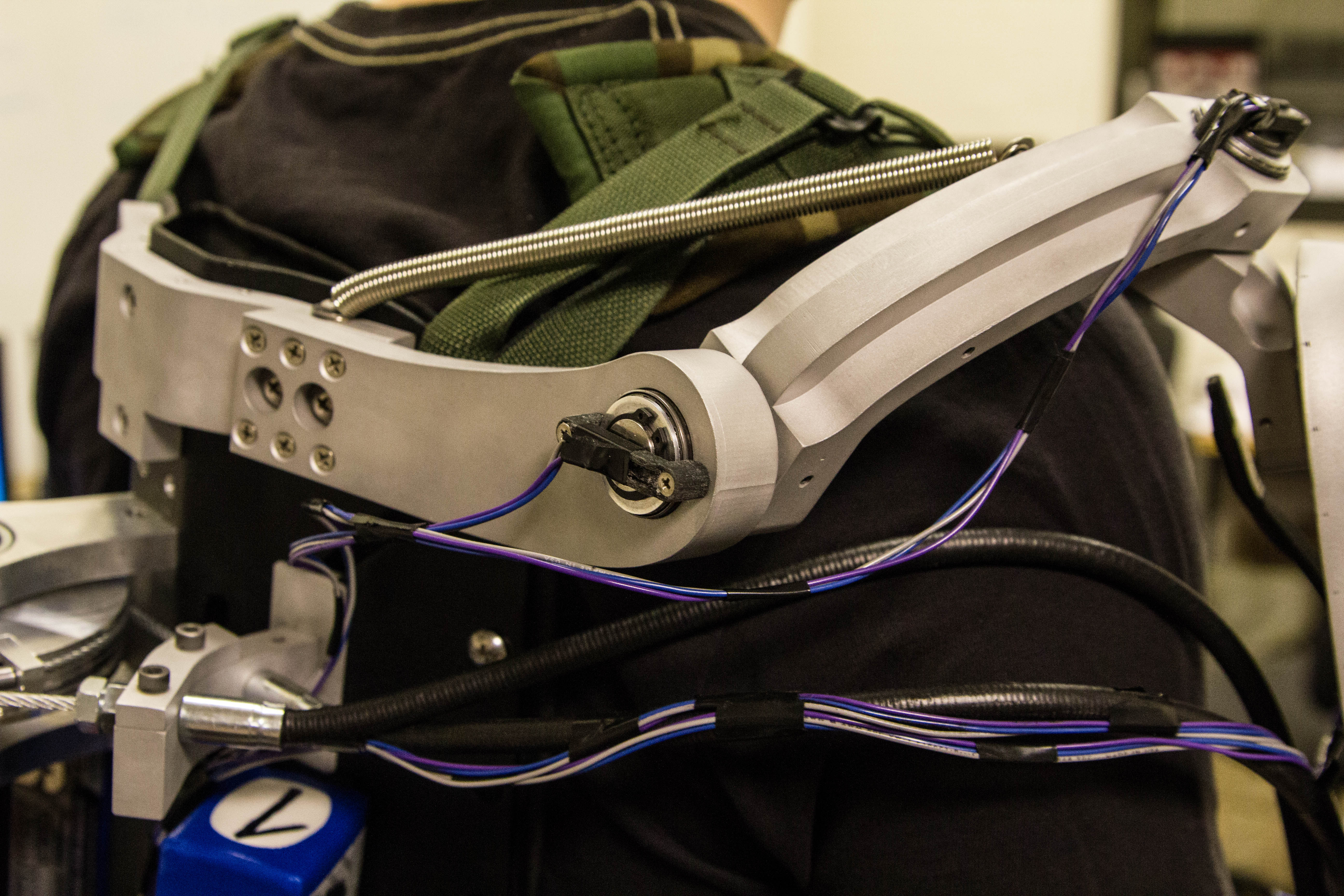 Our exoskeleton runs off a master BeagleBone microcomputer running Ubuntu Linux. Thanks to Alexander Hiam, we’re running the entire system using PyBBIO, an open-source Python library for BeagleBone control. A control loop takes velocity input from the joystick on a hand-held controller and filtered absolute positioning from a rotary potentiometer (mounted at the end of the motor shaft) to compute motor PWM signals. The BeagleBone also controls the brake for the ratchet system — the rocker switch manipulates a servo motor to actuate the pawl.