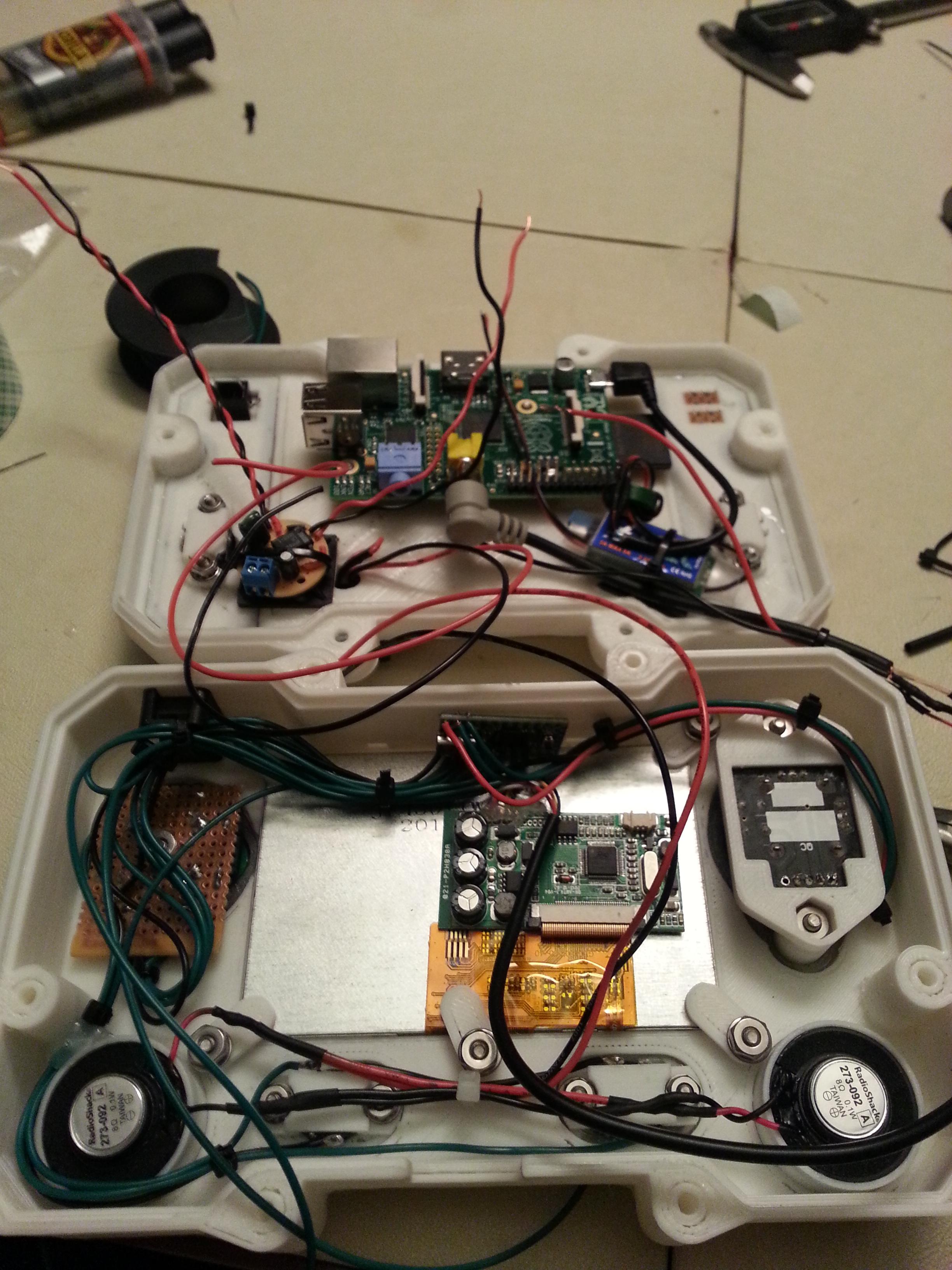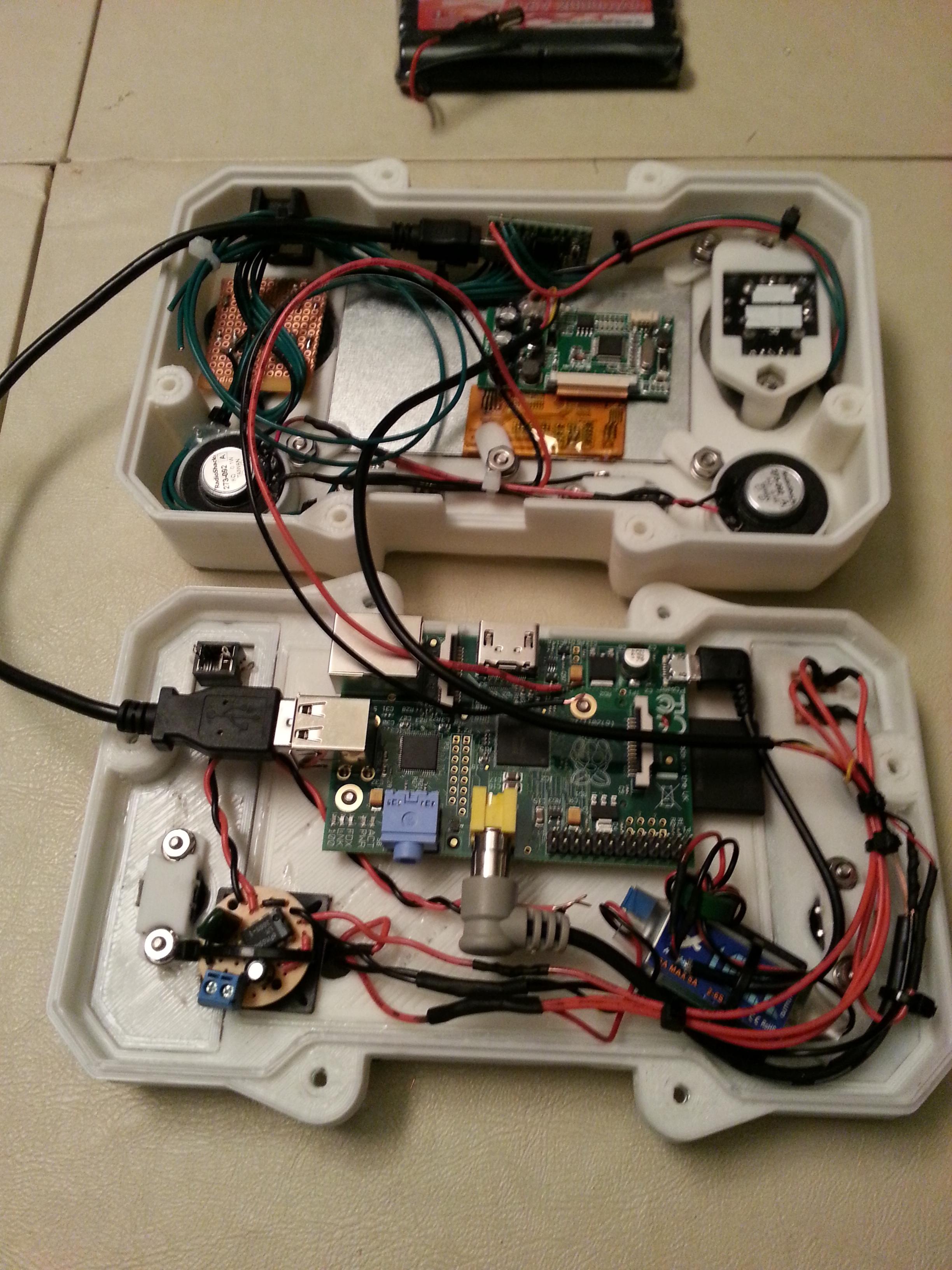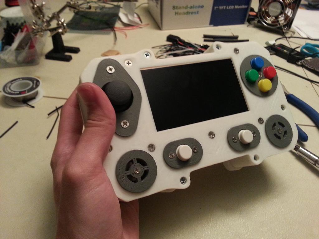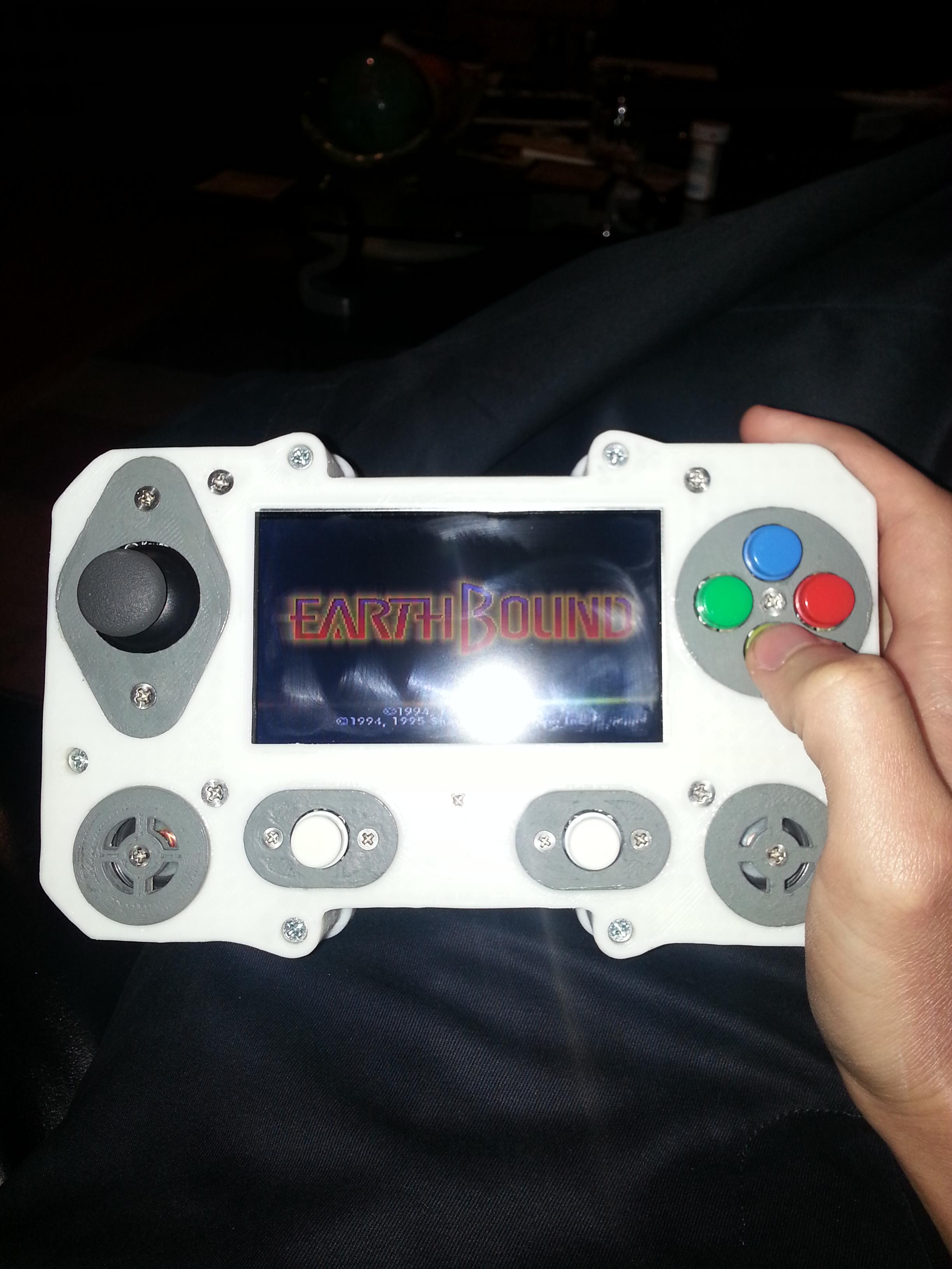 The core of the system is a 512 MB Raspberry Pi Model B. Attached to that is a Teensy 2.0, handling all the buttons and joysticks. There is a 4.5 inch LCD as well as 2 tiny speakers. The entire thing runs for roughly 2 to 3 hours on a 9.6 volt NiMh battery pack. This is all encased in a custom designed 3D printed enclosure, which Mike has shared if you’d like to print your own. Mike says that all together he spent about 20 hours printing out the various pieces.