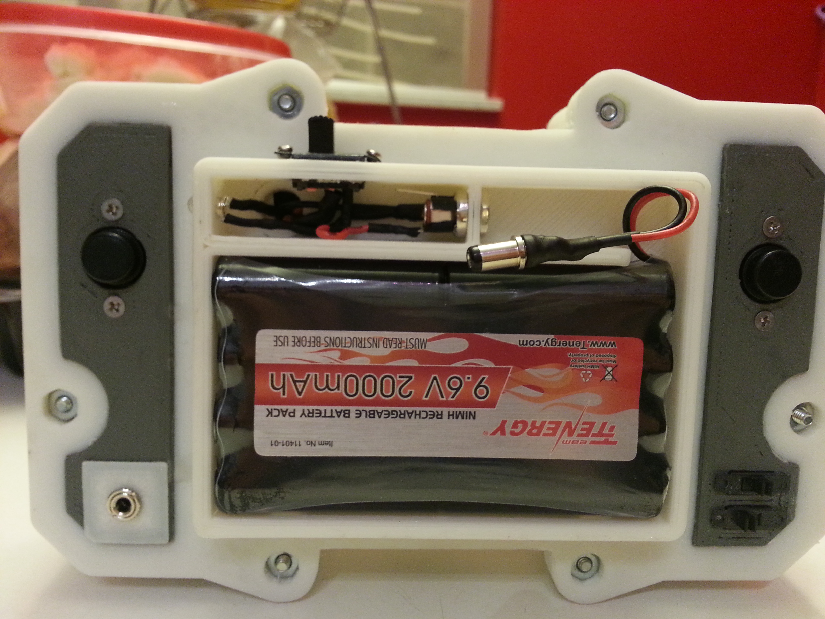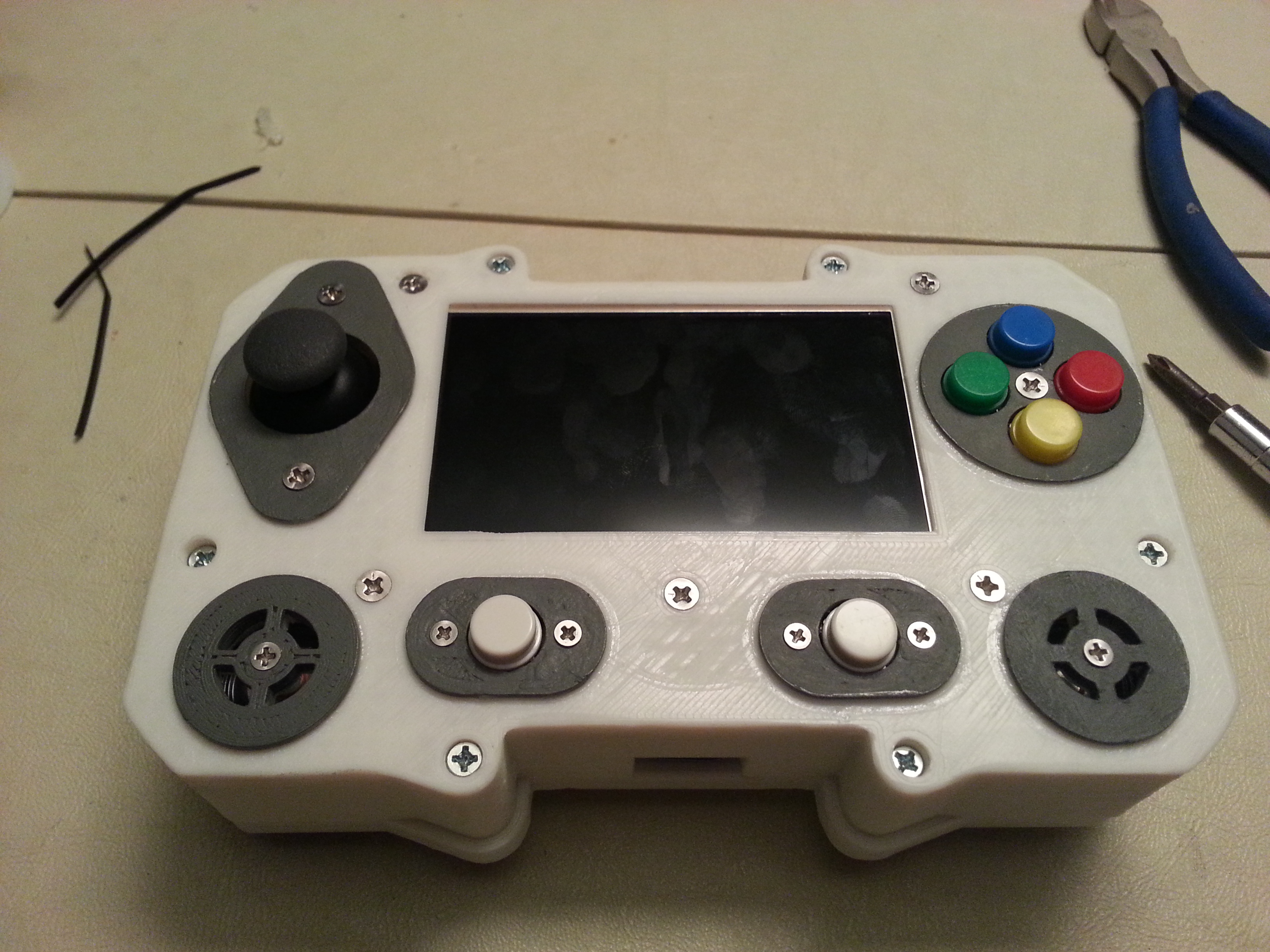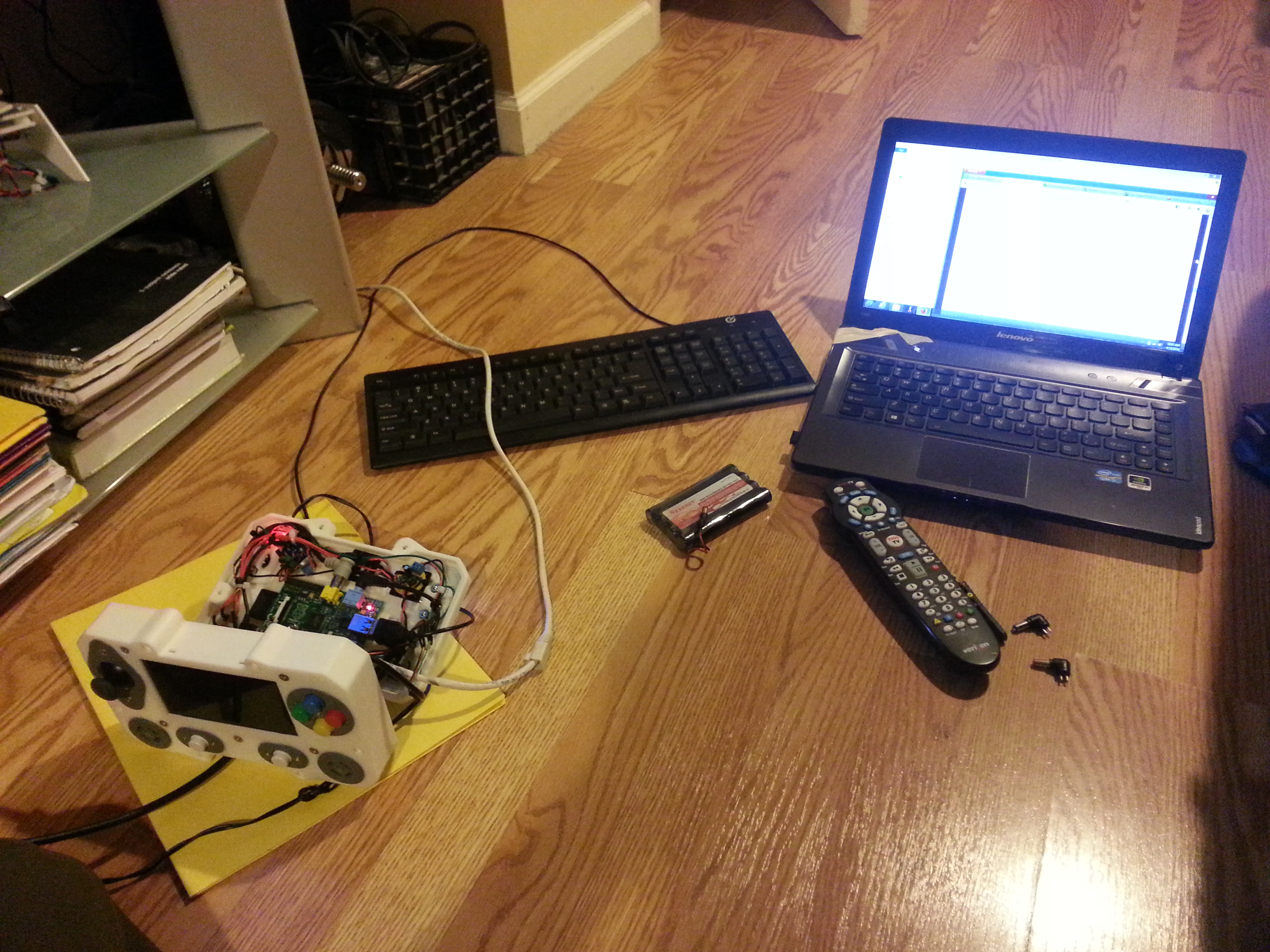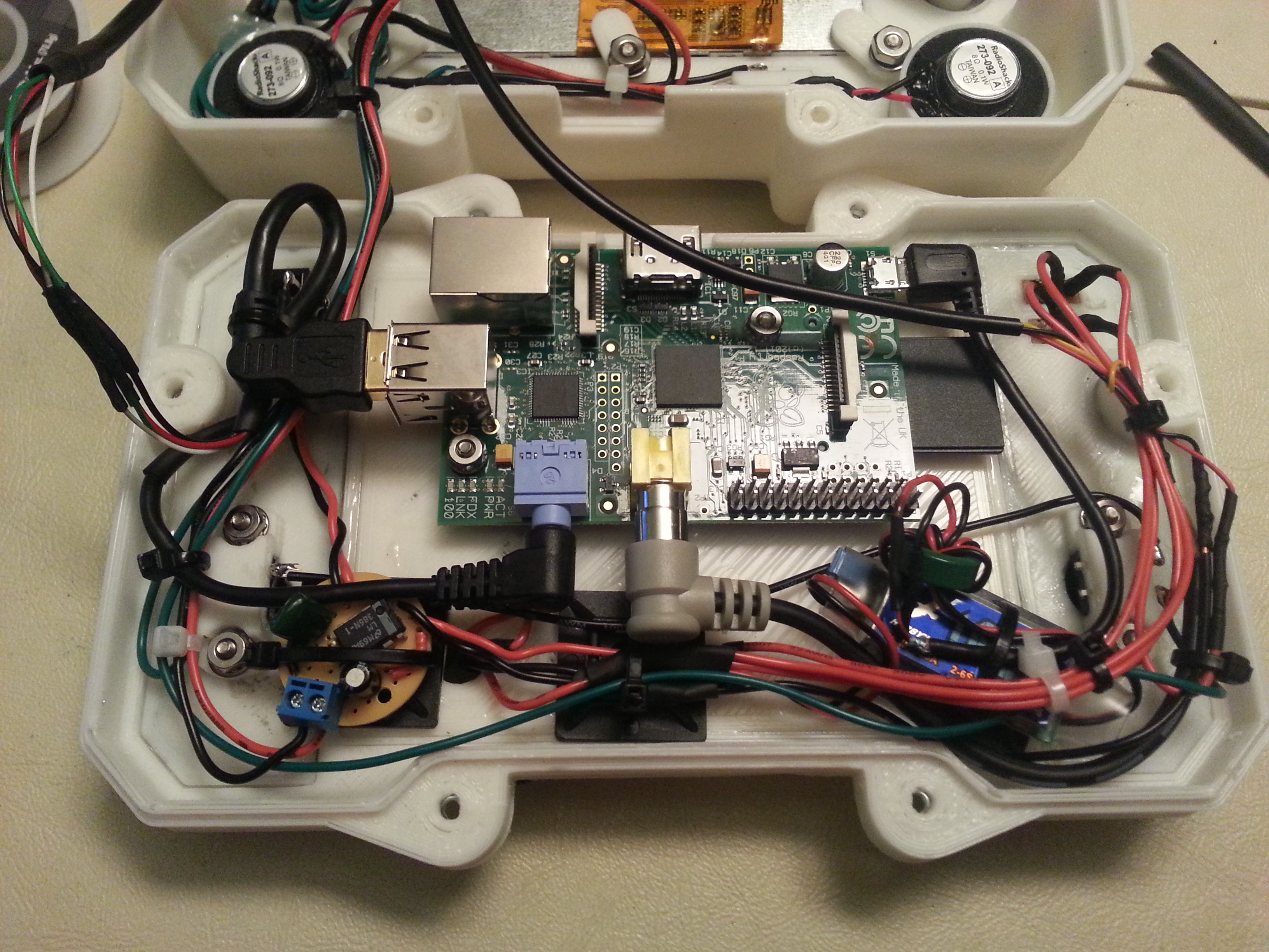 The core of the system is a 512 MB Raspberry Pi Model B. Attached to that is a Teensy 2.0, handling all the buttons and joysticks. There is a 4.5 inch LCD as well as 2 tiny speakers. The entire thing runs for roughly 2 to 3 hours on a 9.6 volt NiMh battery pack. This is all encased in a custom designed 3D printed enclosure, which Mike has shared if you’d like to print your own. Mike says that all together he spent about 20 hours printing out the various pieces.