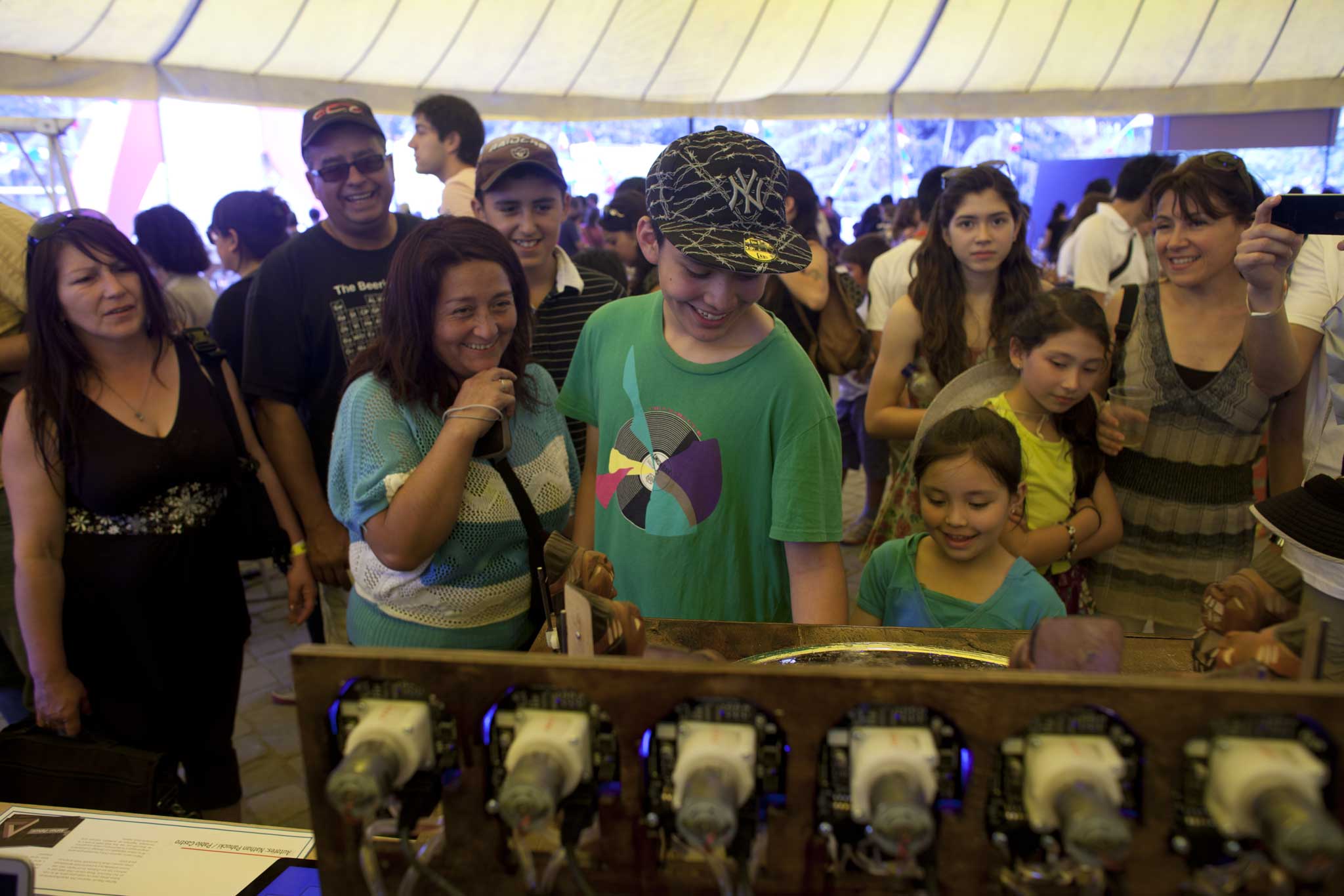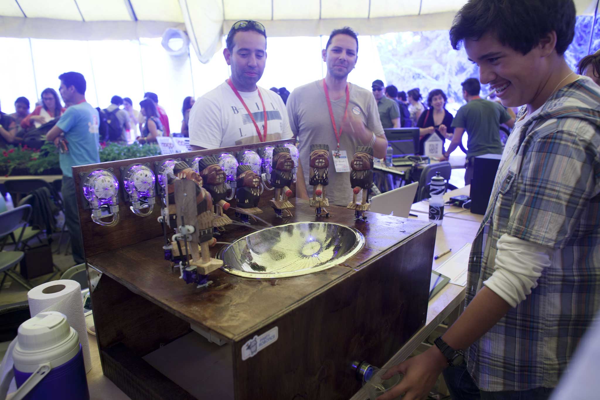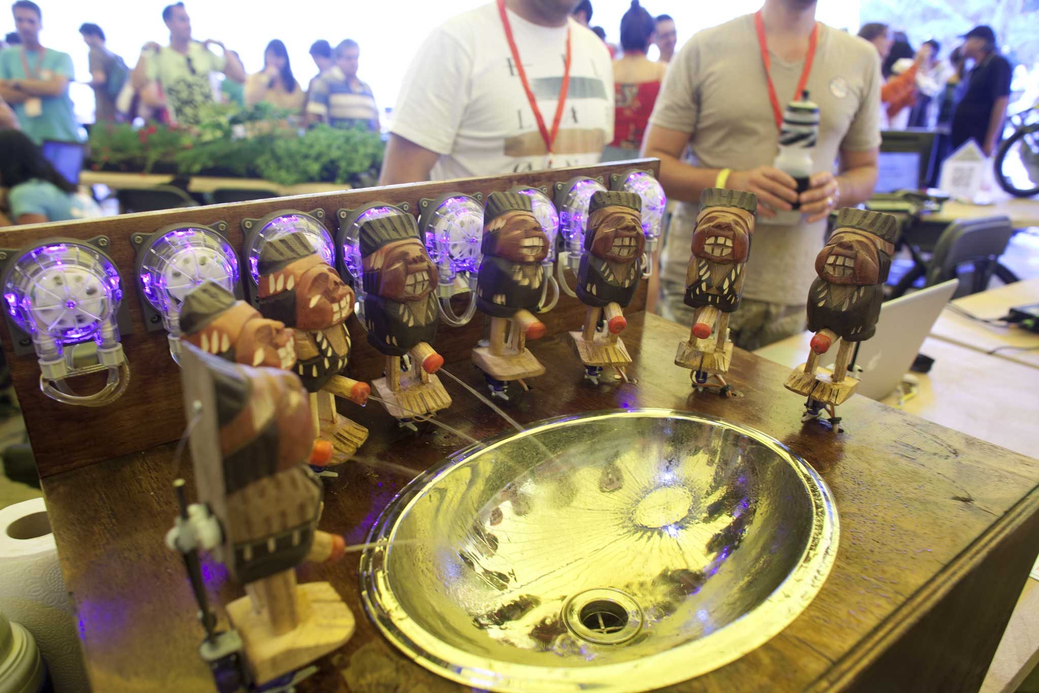 The Indio Pícaro doll is a national joke in Chile, one which Nathan Pahucki and Pablo Castro wanted to capitalize on at the Santiago Mini Maker Faire. Their project, PissCO, is a robotic drink machine in which each Indian doll… well… dispenses a particular drink ingredient. The user chooses their drink from a tablet which is connected to a Raspberry Pi-based web server. The Raspberry Pi, in turn, controls the servo motors and peristaltic pumps to dispense the drink according to its recipe.
