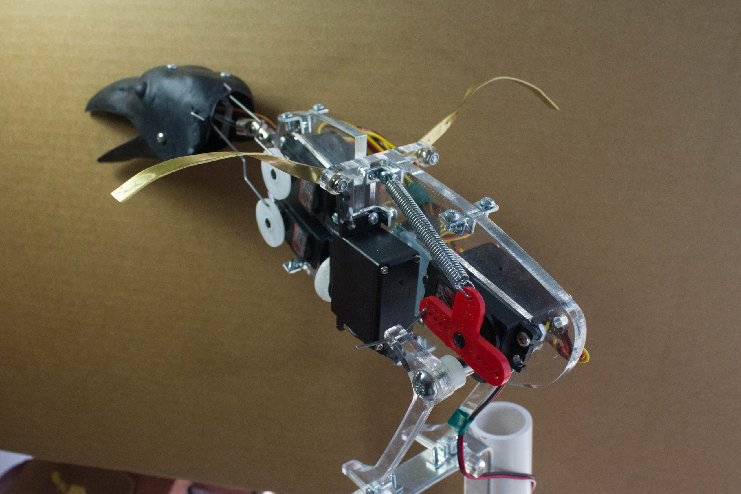 Thanks to excellent video documentation by kit maker Jasper Anderson (aka Mr. Chicken) itโs an easy build โ I assembled the robotics portion in an afternoon and evening, and had the servos jumping the next morning. Pretty much a screwdriver and needlenose pliers and youโre there. Oh yeah, youโll need to drill a few holes in thin brass stock for the wing armatures, but that was easy too.