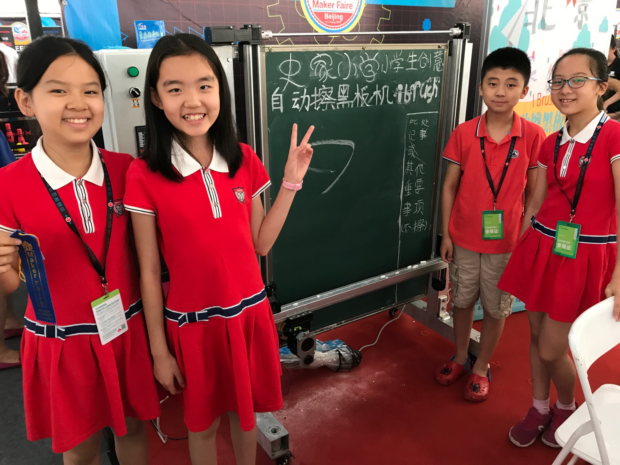 Some nice young maker projects just charmed the pants off visitors. There was the CNC chalkboard eraser (Can’t you just imagine the brainstorming session that led to that project idea??!), as well as a class’ experimentations in battery-powered walking and running machines.