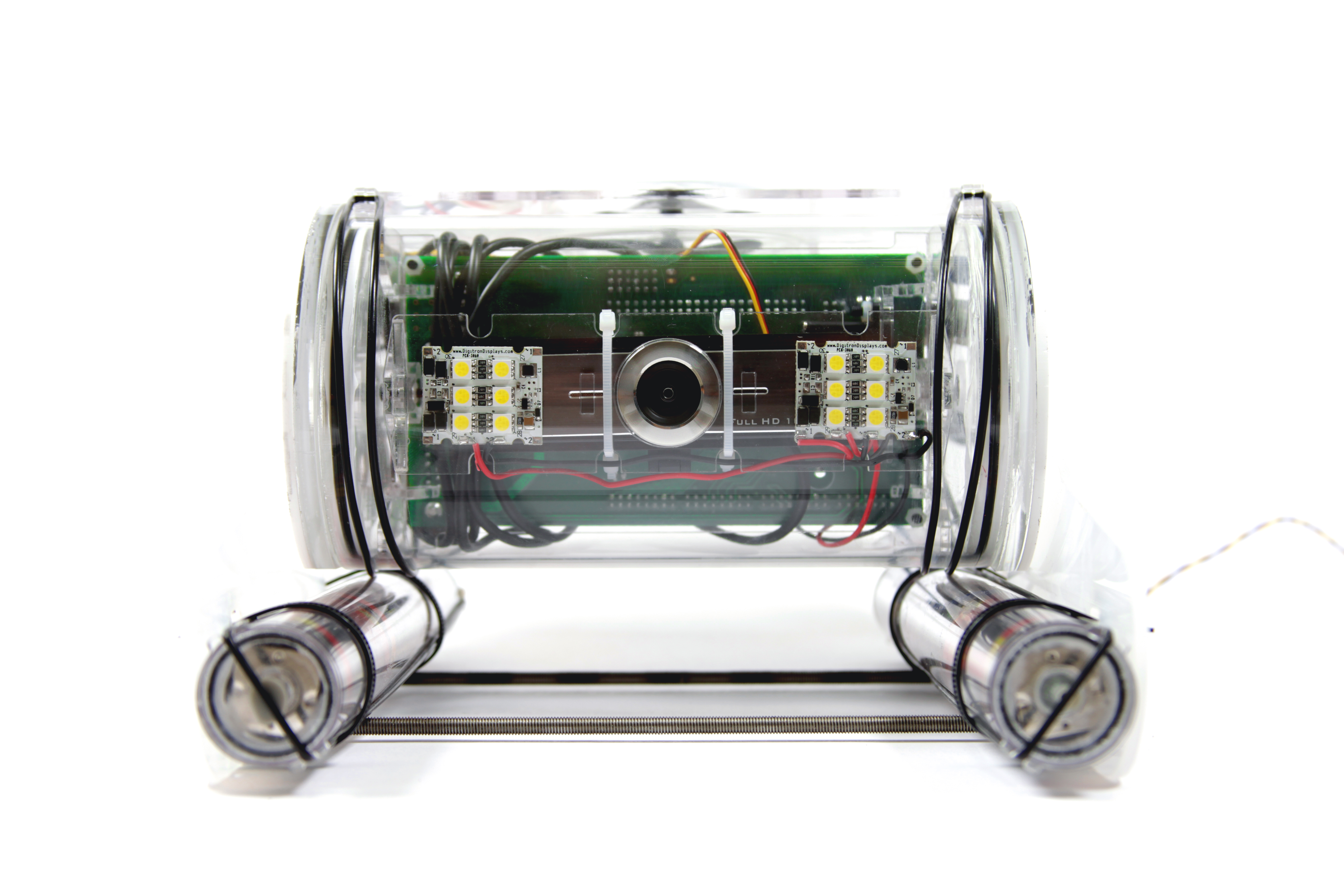 This is one of six spherical robots that make up a kinetic sculpture called SWARM. Since 2007, SWARM has appeared at Burning Man, Maker Faire, Yuri’s Night, and many other events. The round shells are made of water-jet cut aluminum, and the robots move by pushing against the weight of their internal battery packs. Each unit’s onboard electronics include a GPS receiver, IMU, multicolor LED banks, speakers, and an embedded system running Linux.