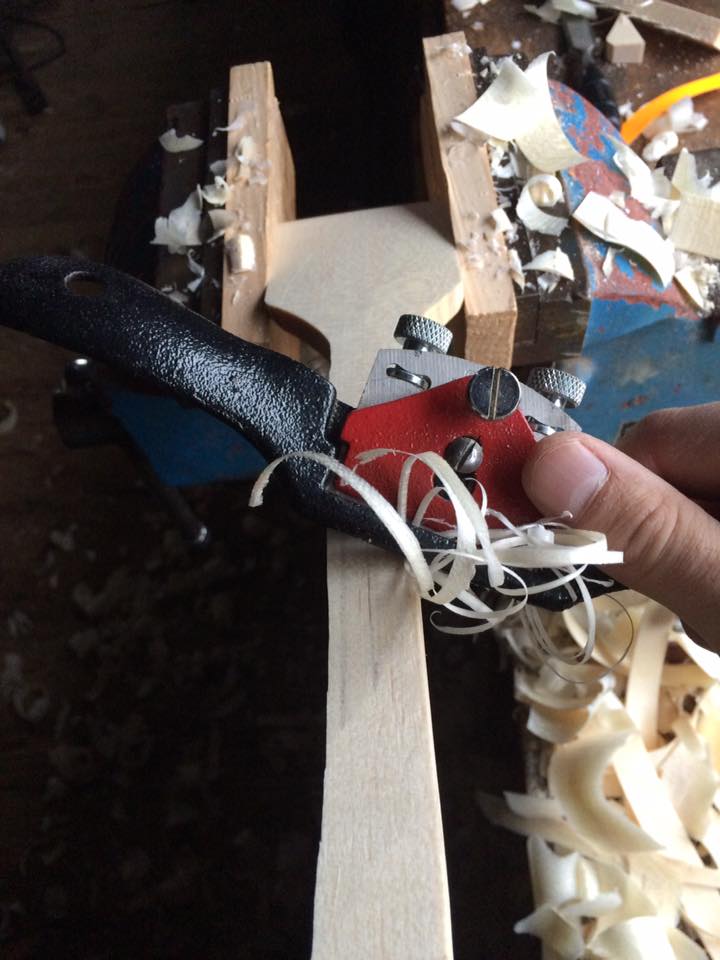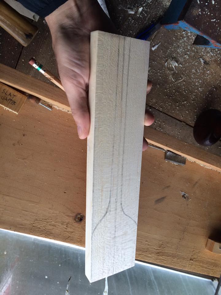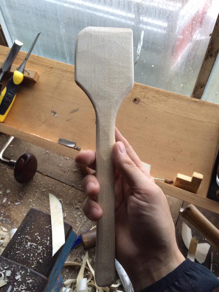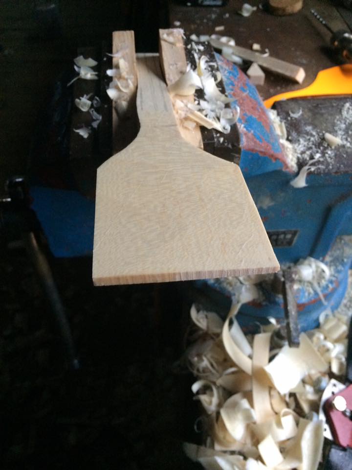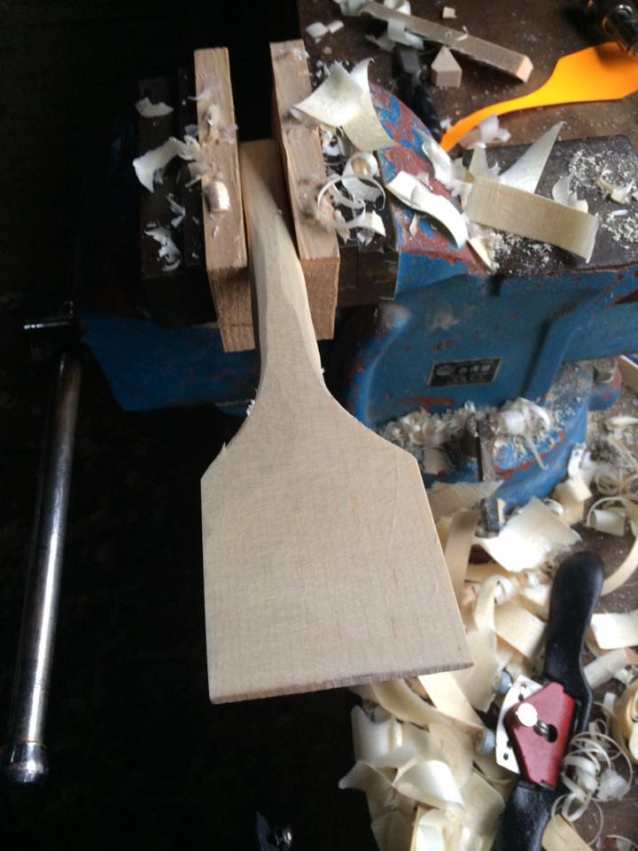 This build starts out with Beane selecting the appropriate piece of wood (maple) to use in his project, then cutting it with a hatchet. From this rough shape, he then chipped the bark off the new plank of wood, and continued the process with a draw knife then a wood plane. On this now-squarish blank he then drew a template for his spatula, then continued work with a draw knife, now shaping the “square” into a blocky version of a spatula.