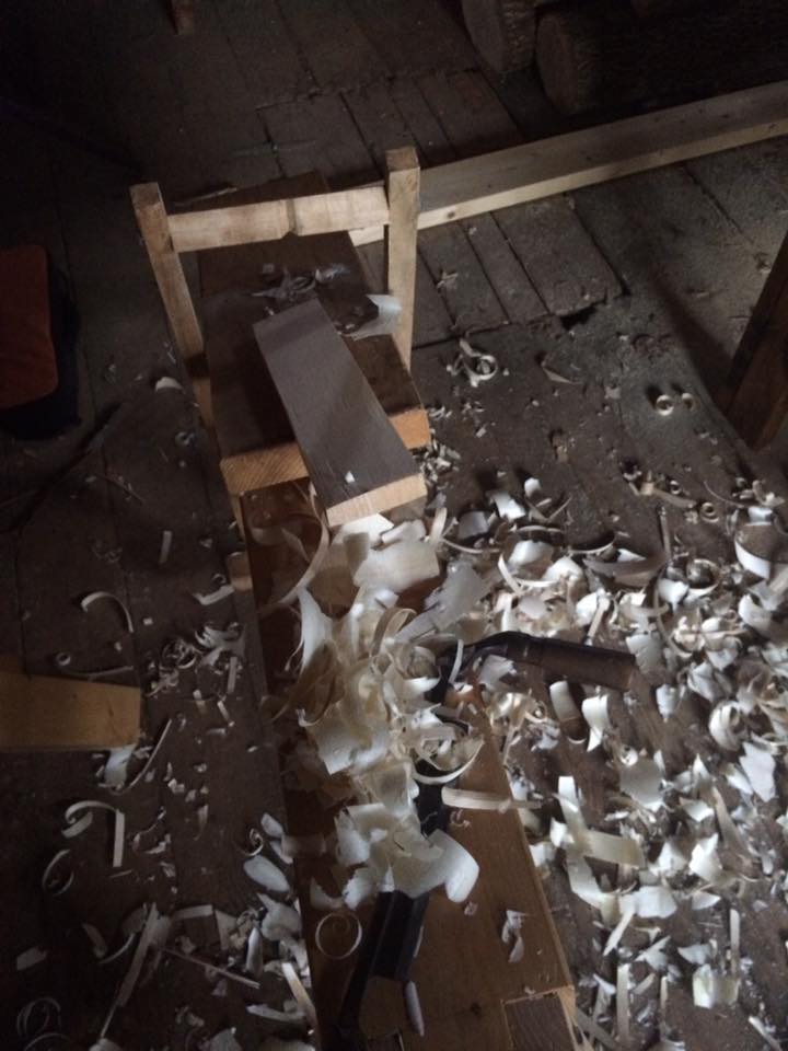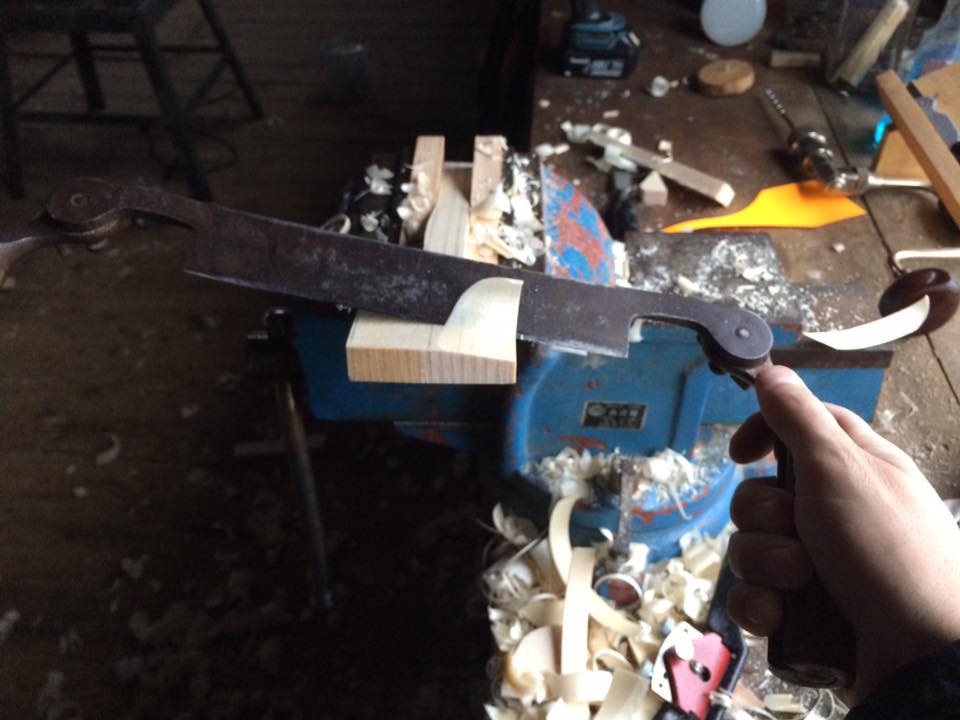 After more work to make it into the correct shape, he then thinned the piece down with, you guessed it, his trusty draw knife. After finishing the handle, he then made one corner of the spatula itself rounded, as he likes to use this to scrape the inside of frying pans. This is one obvious advantage to making your own cooking utensils; if you have the right skills and tools, you can shape them however you want. In fact, though what he is holding in the second to last image isn’t quite done, he apparently doesn’t like to sand it much, instead opting for a rough look. You can see more of his implements in the last picture, including more spatulas and a spoon.